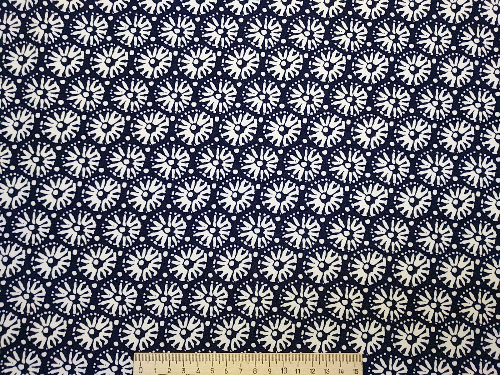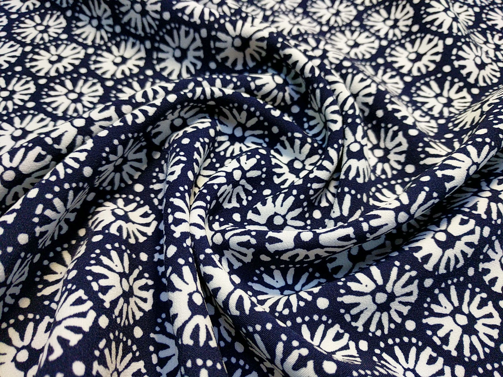 Крепова щільна тканина зі стрейчем дозволяє шити з неї плаття, костюми, а класичні монохромні принти на темно-синьому тлі ніби створені для сукні футляра. В наявності декілька дизайнів купона та рапорту для створення костюмів та суконь.