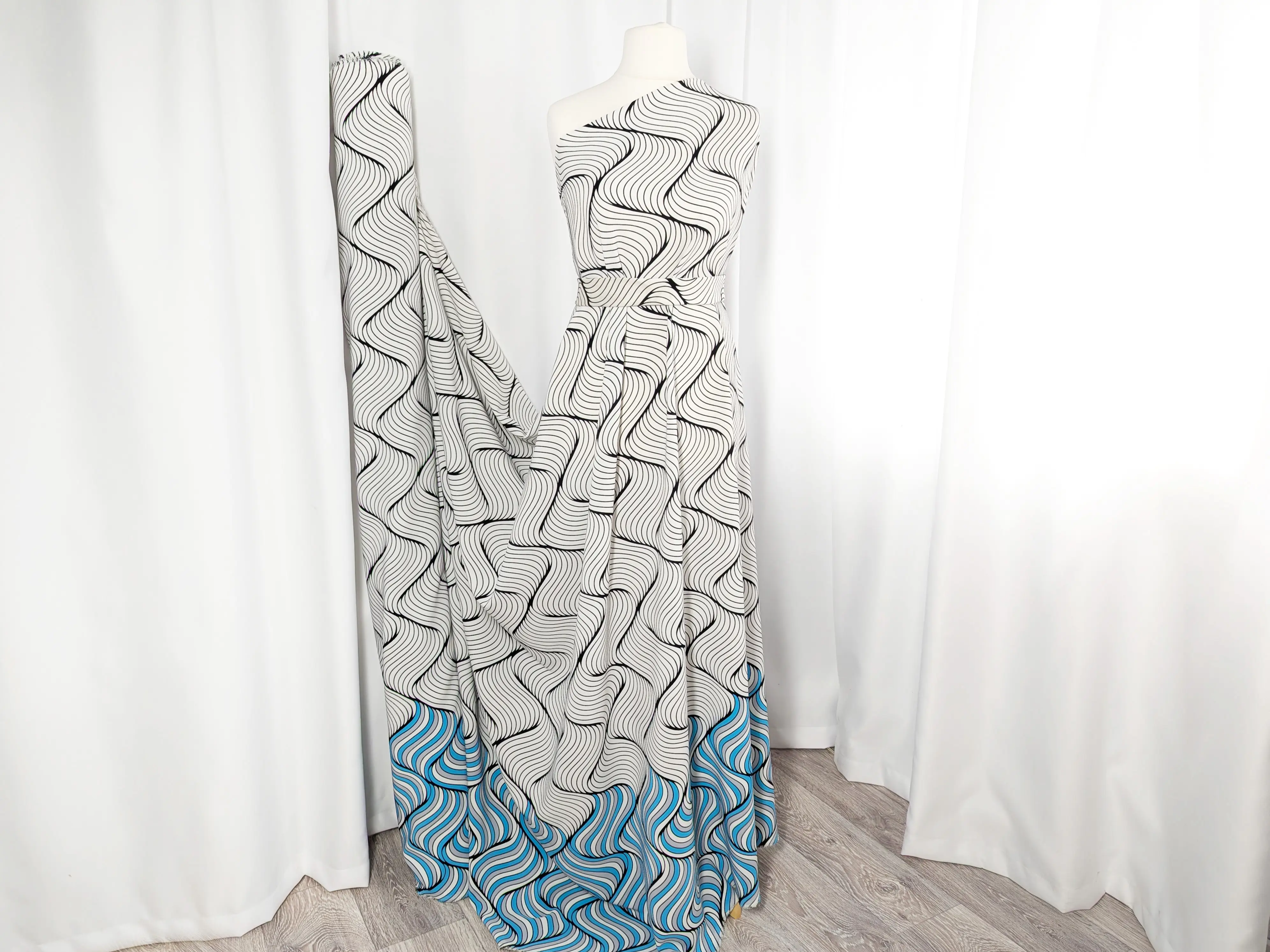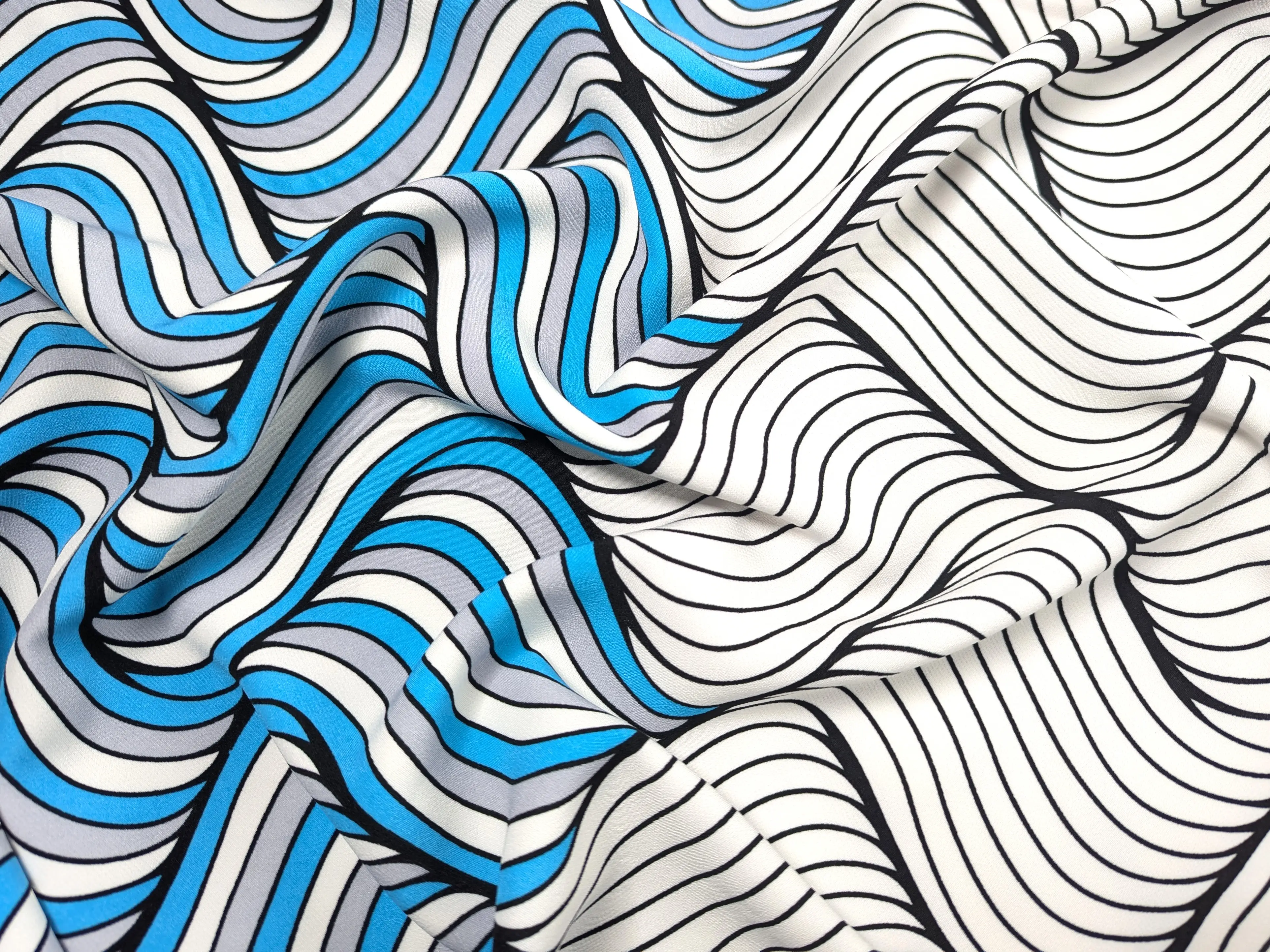 Тканина середньої щільності, стрейчева, не мнеться, відмінно сидить по фігурі, приємна на дотик. По всьому полотну нанесений яскравий принт рапортом. Має діагональне плетіння ниток по лицьовій стороні. Застосовується для пошиття костюмів та суконь.