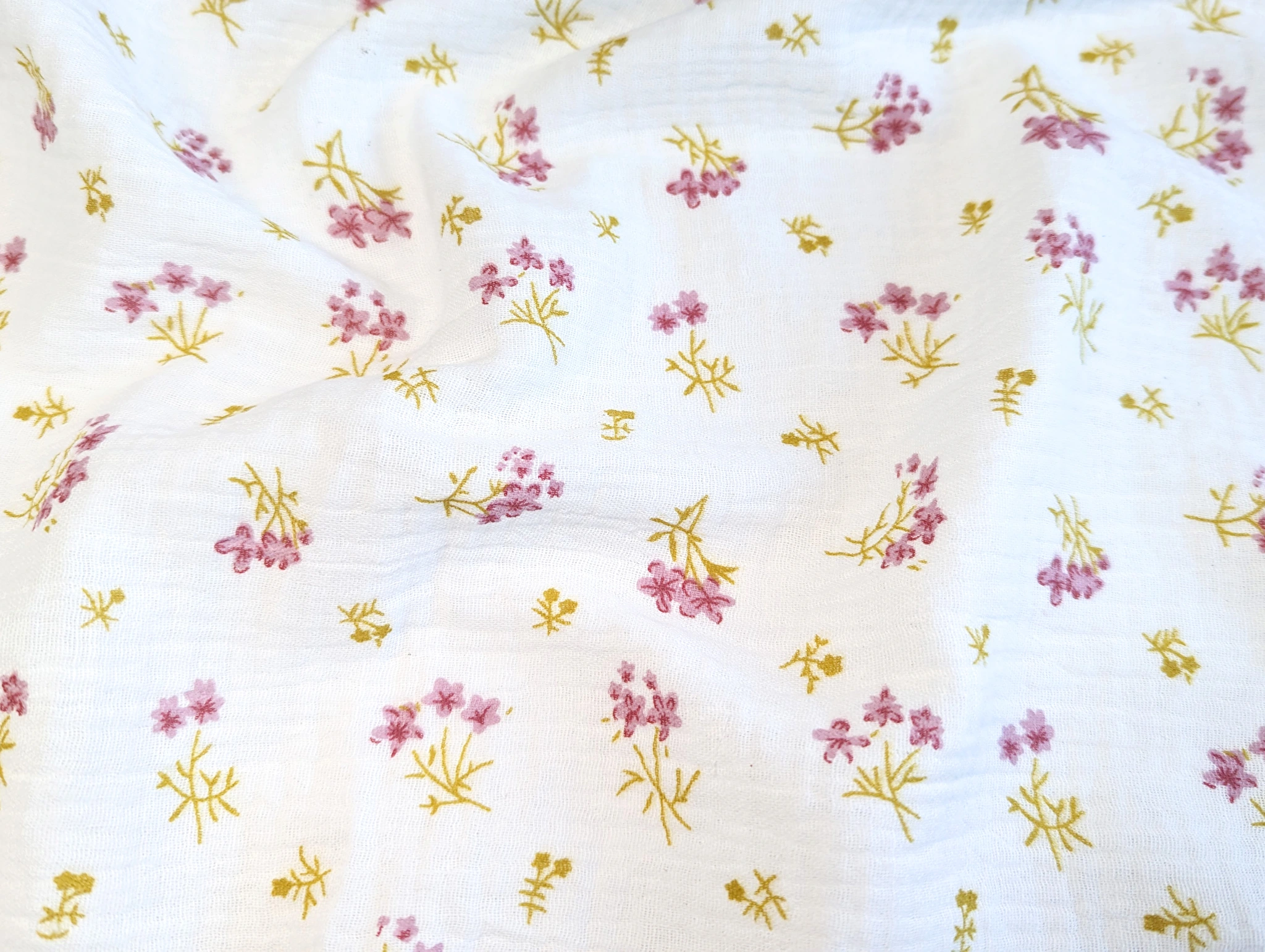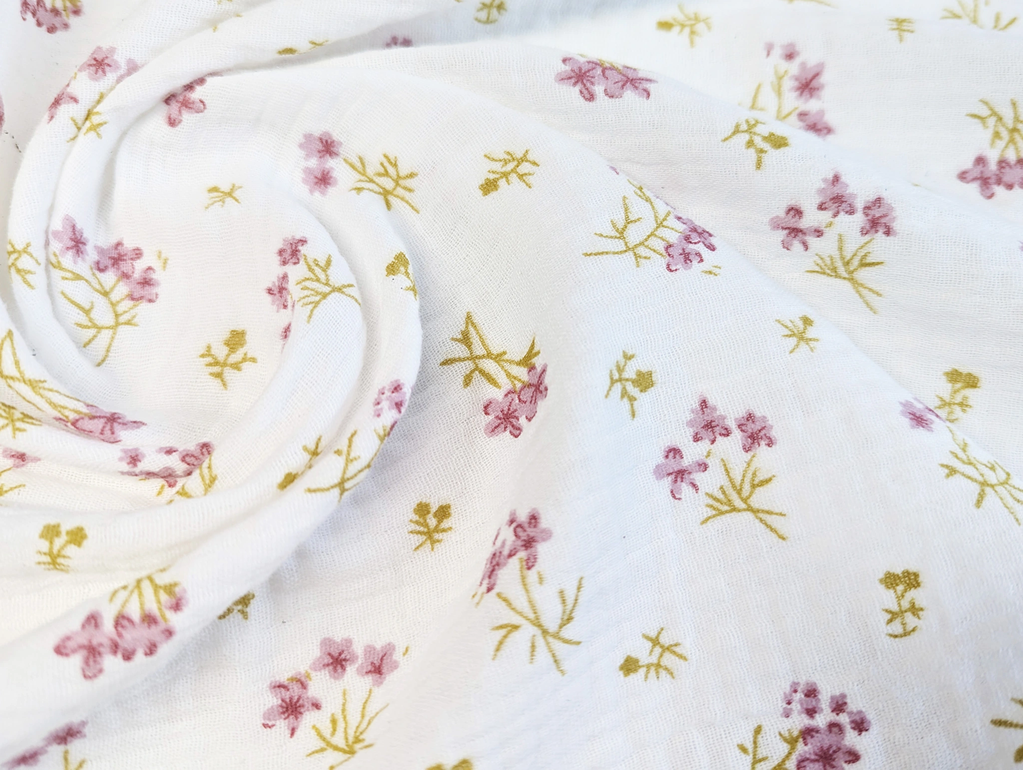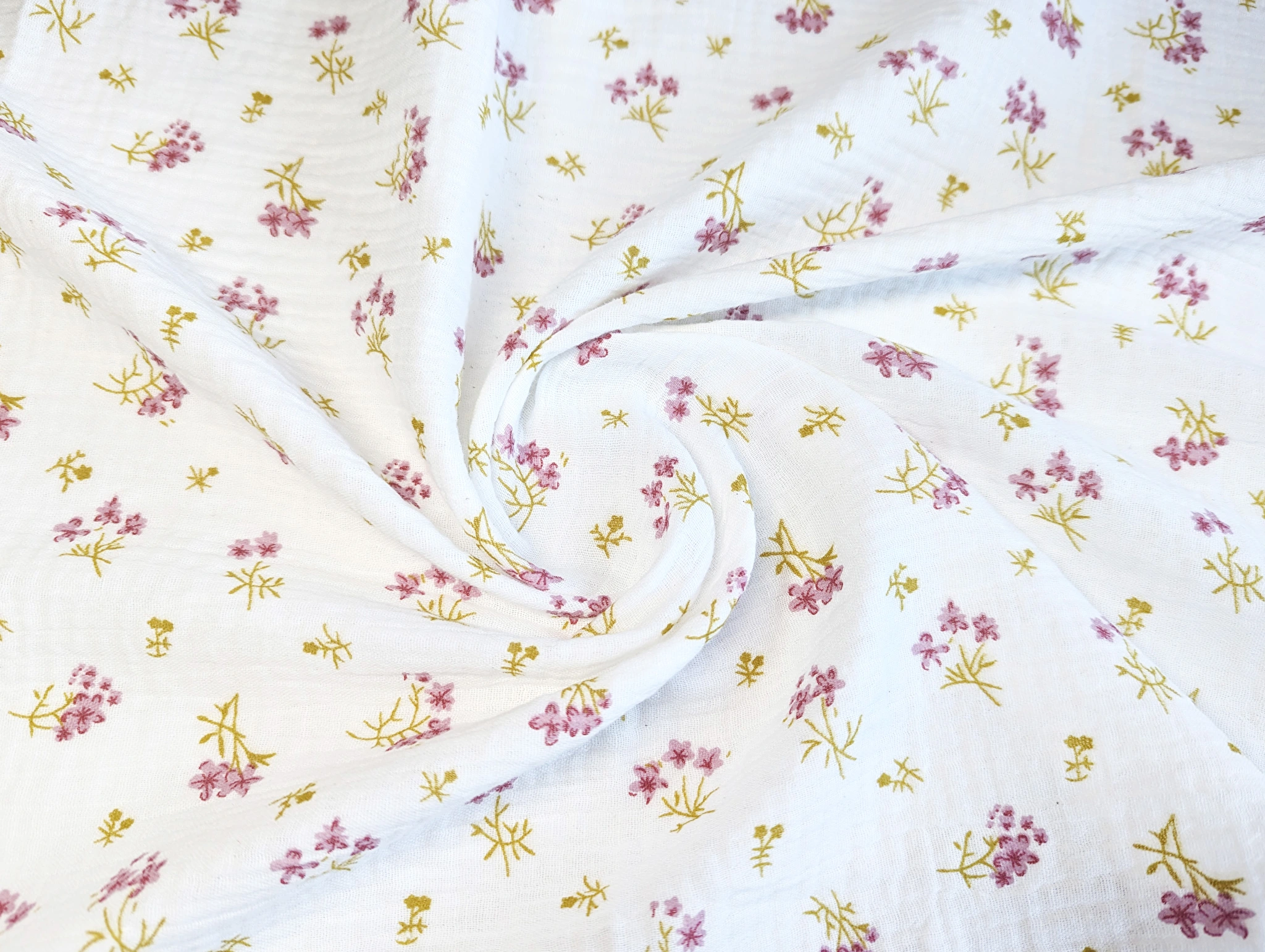 Муслін - це двошарова бавовна, приємна, м'яка до тіла тканина. Структура полотна злегка піджата, щільна, але має легкий просвіт, вироби з нього будуть дуже зносостійкими. Абсолютно не парить в жарку погоду, воно легке і практично невагоме. Полотно муслін не мнеться, не вимагає додаткового догляду. Відмінно підійде для пошиття літніх суконь, комбінезонів, блуз як для дорослих так і для дітей.