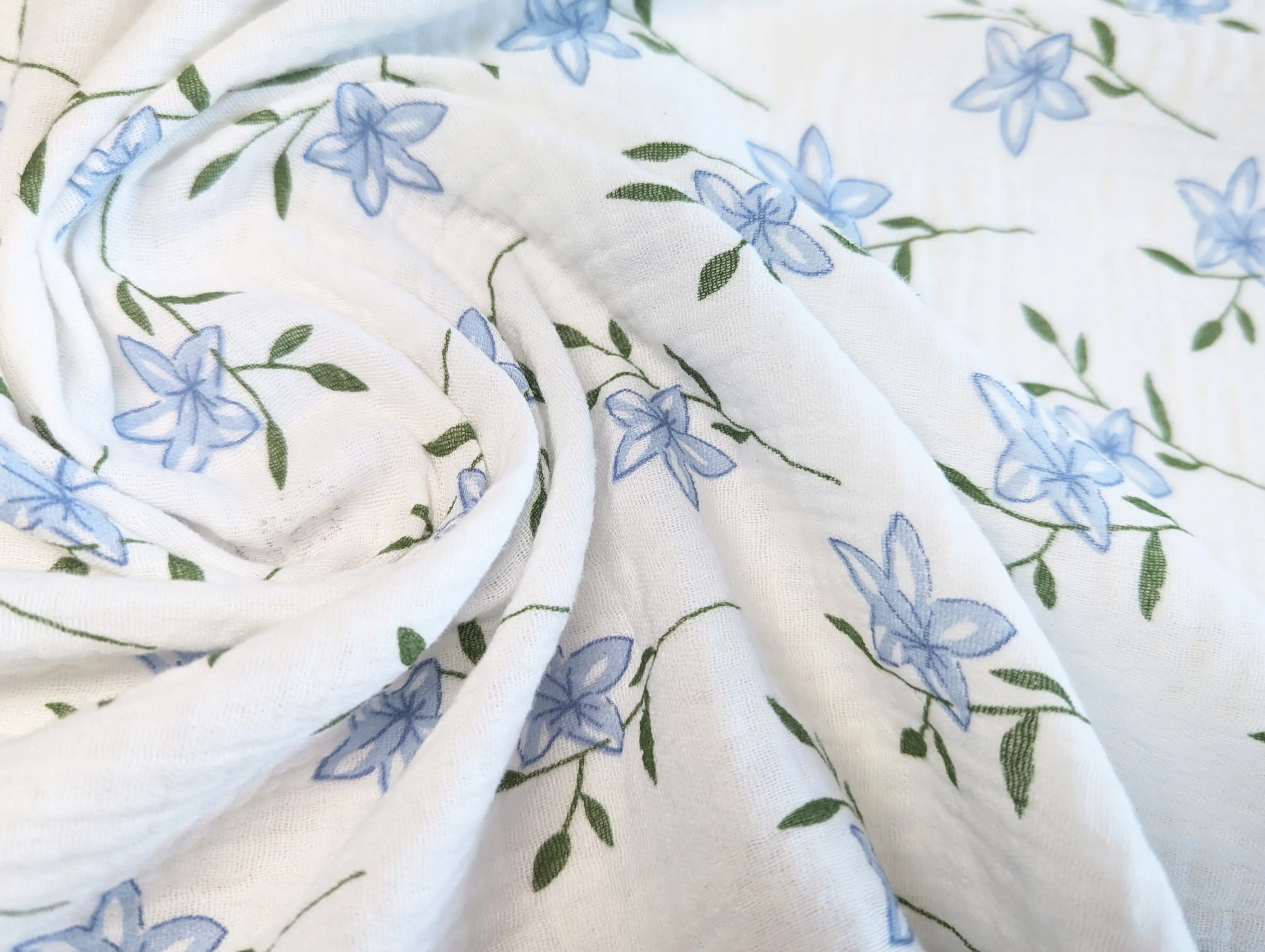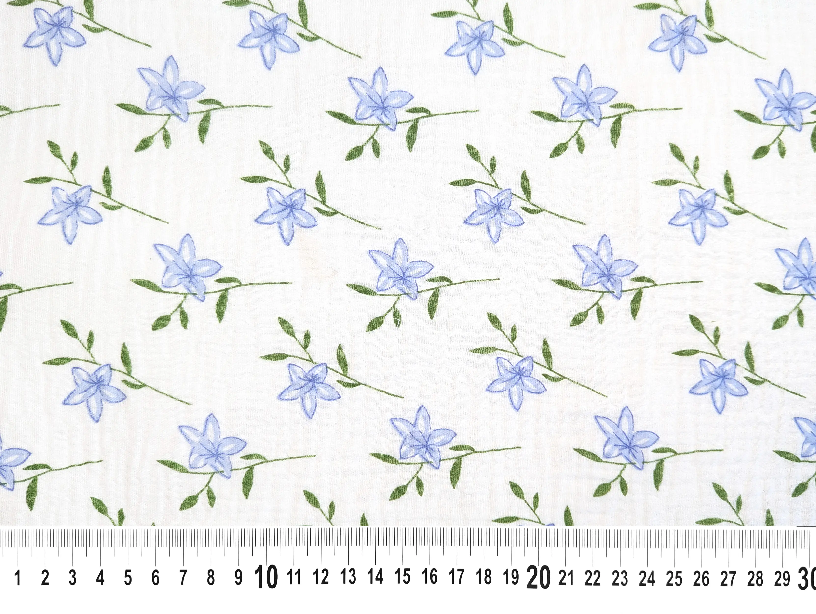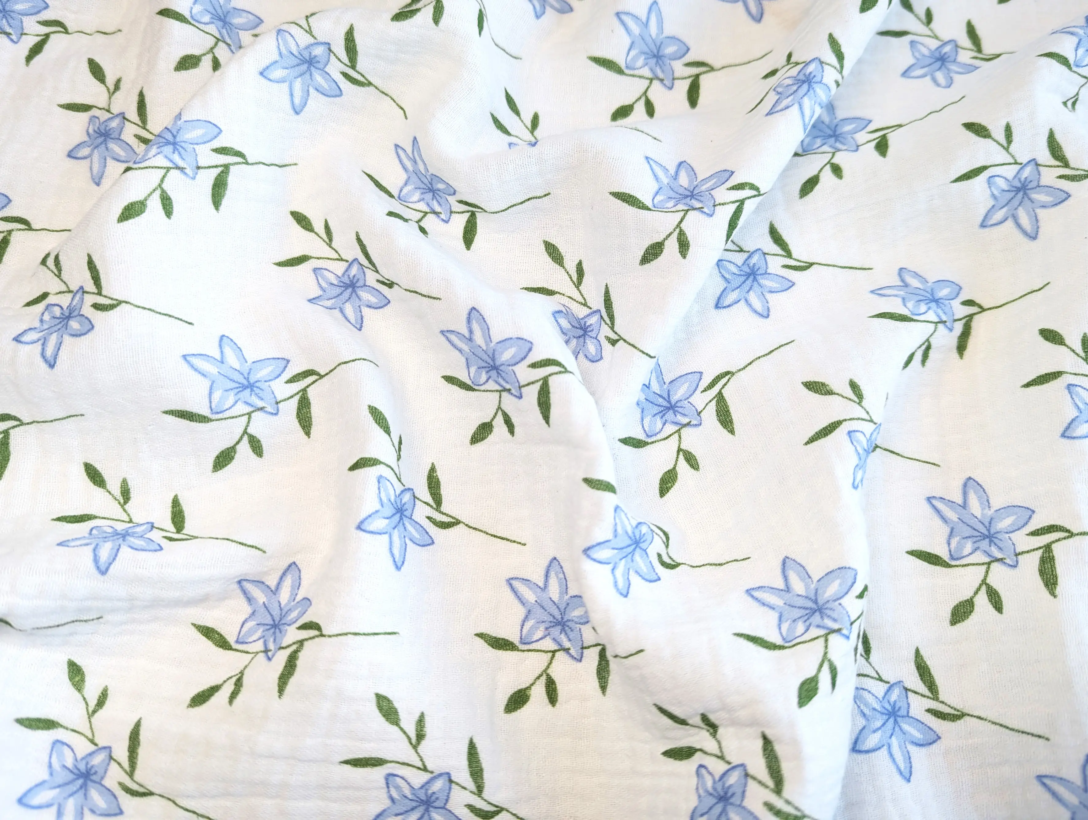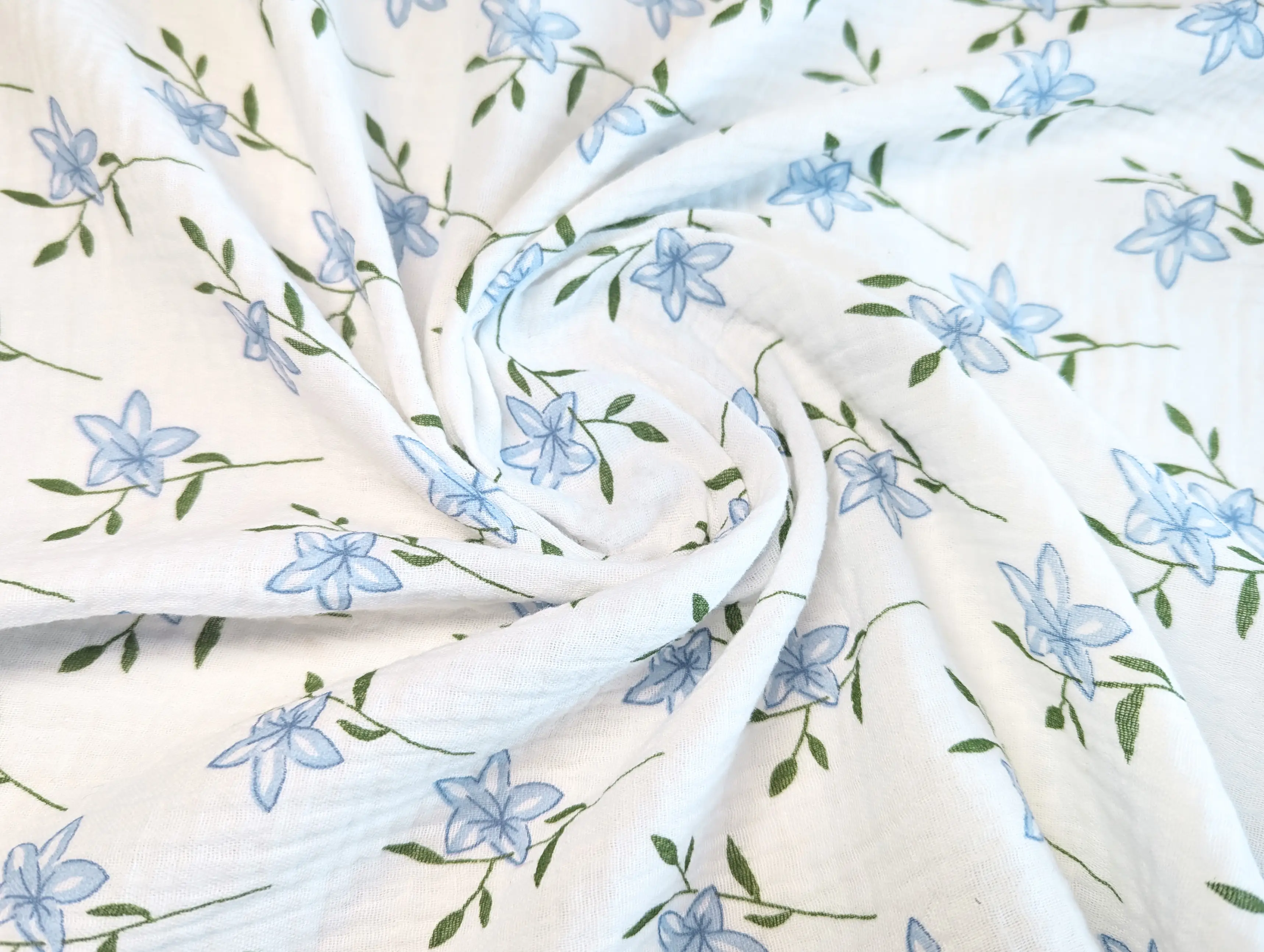 Муслін - це двошарова бавовна, приємна, м'яка до тіла тканина. Структура полотна злегка піджата, щільна, але має легкий просвіт, вироби з нього будуть дуже зносостійкими. Абсолютно не парить в жарку погоду, воно легке і практично невагоме. Полотно муслін не мнеться, не вимагає додаткового догляду. Відмінно підійде для пошиття літніх суконь, комбінезонів, блуз як для дорослих так і для дітей.