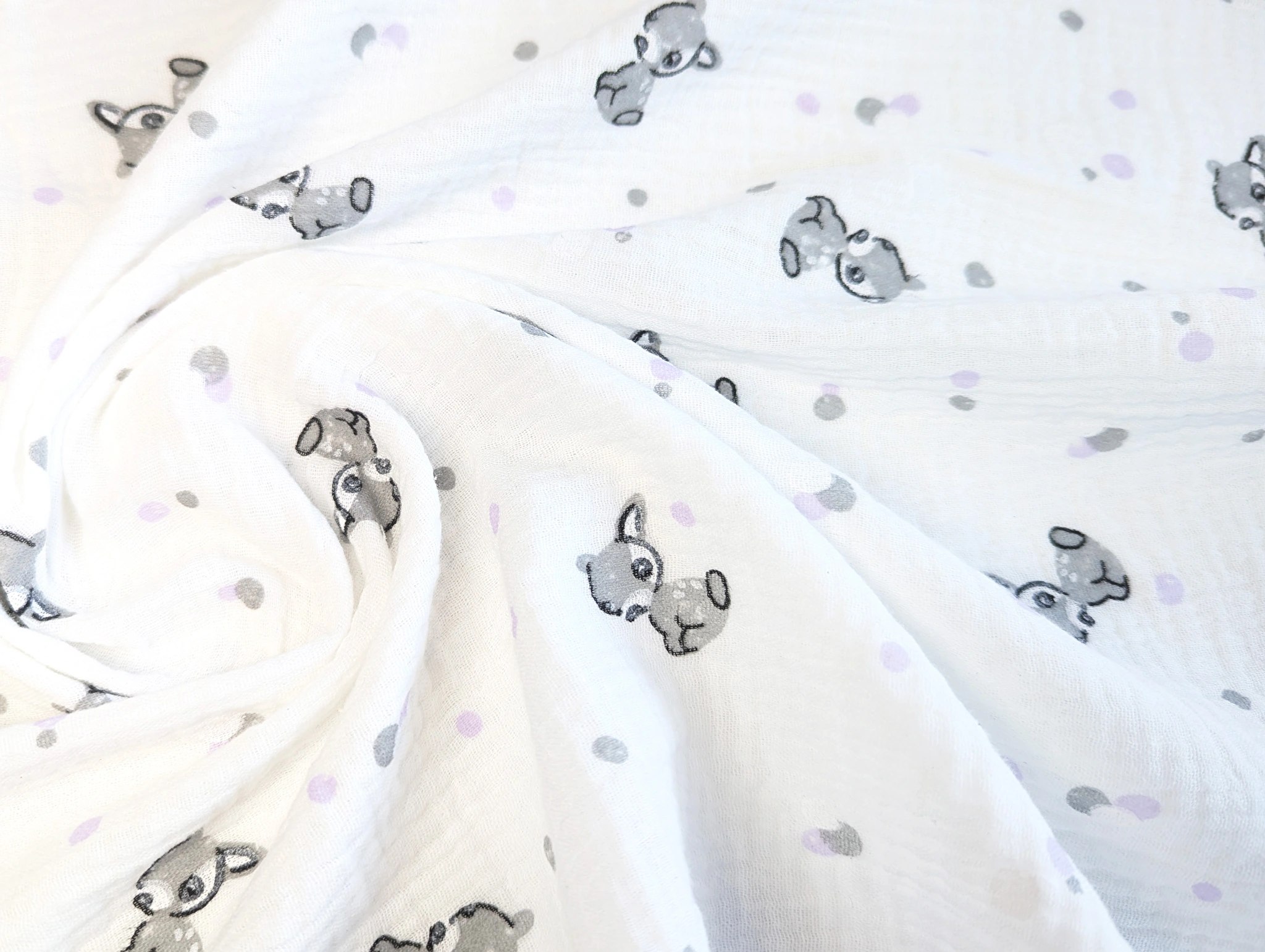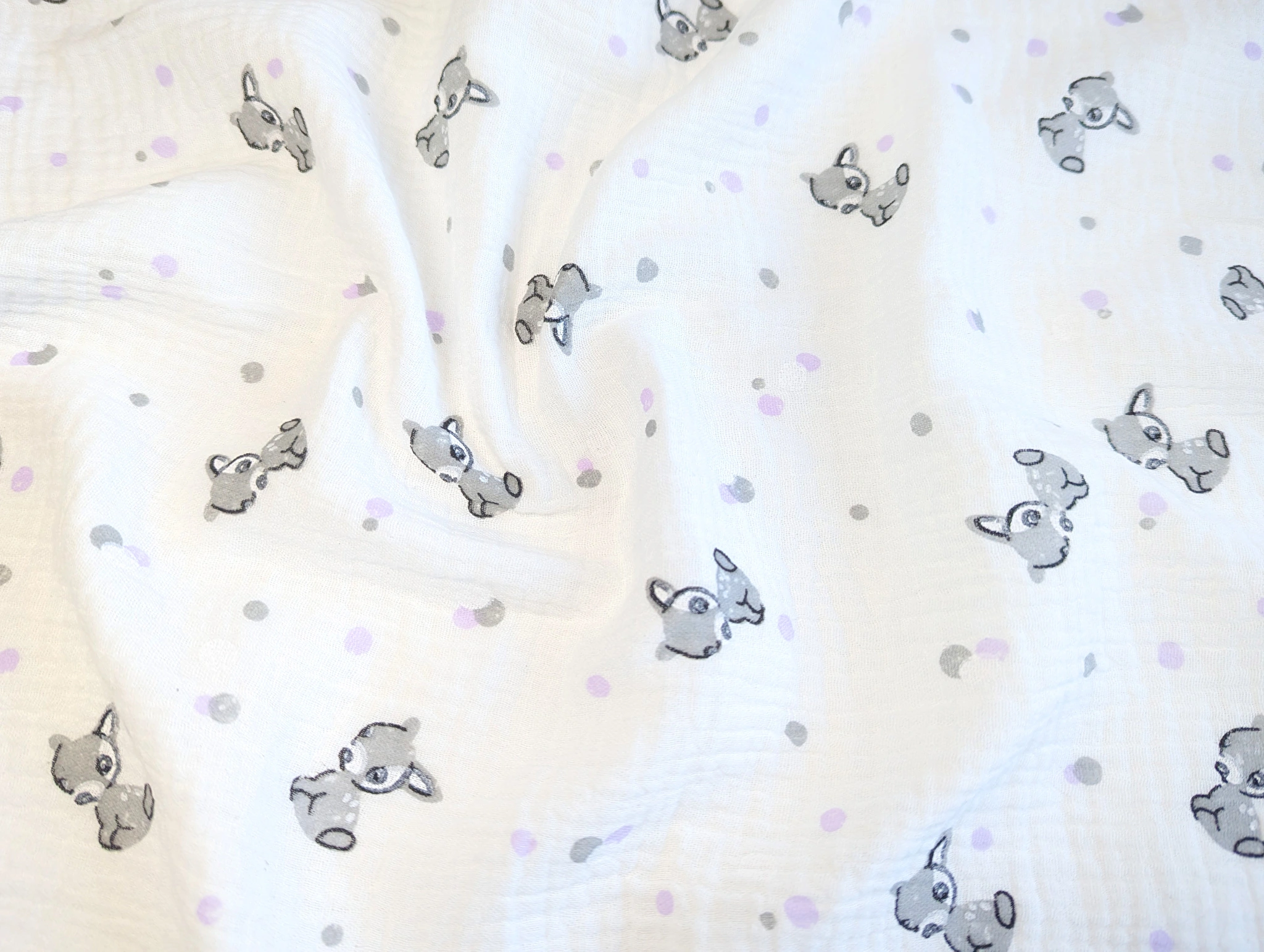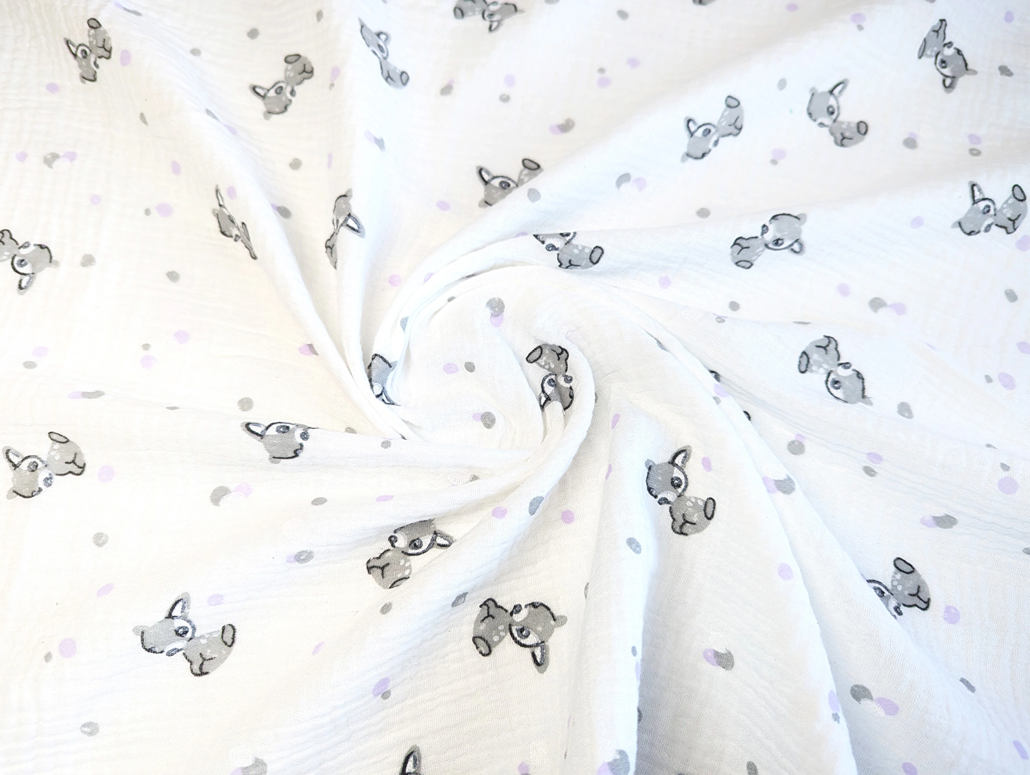 Муслін - це двошарова бавовна, приємна, м'яка до тіла тканина. Структура полотна злегка піджата, щільна, але має легкий просвіт, вироби з нього будуть дуже зносостійкими. Абсолютно не парить в жарку погоду, воно легке і практично невагоме. Полотно муслін не мнеться, не вимагає додаткового догляду. Відмінно підійде для пошиття літніх суконь, комбінезонів, блуз як для дорослих так і для дітей.