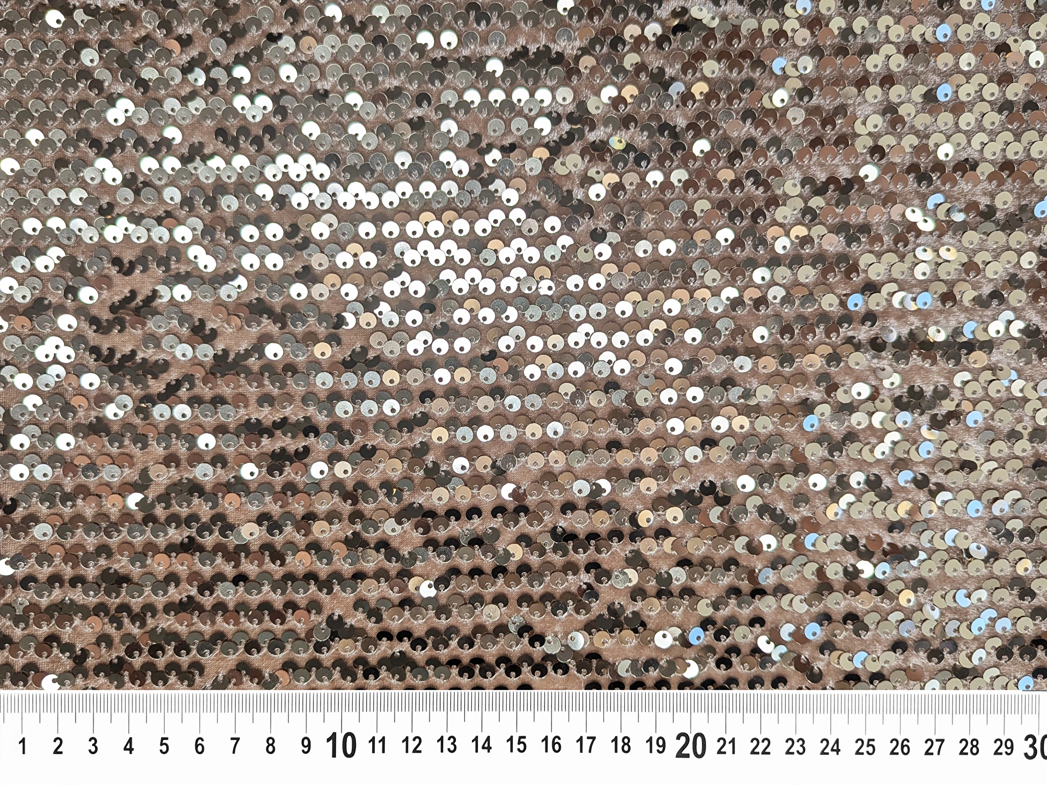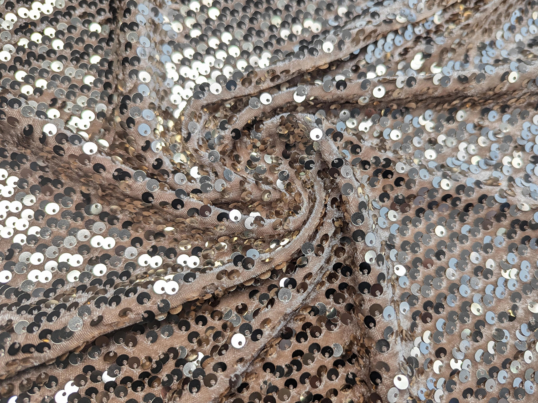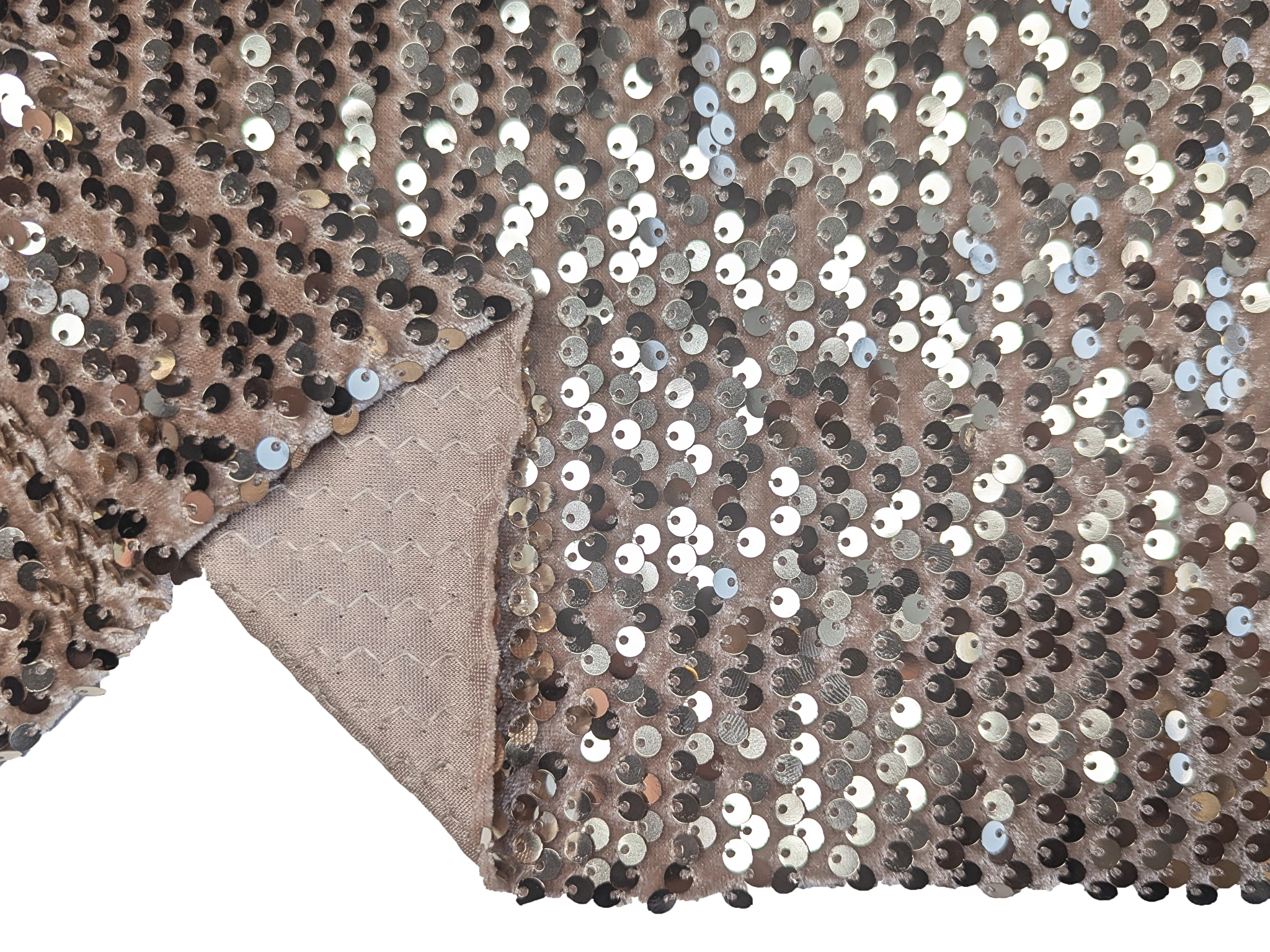 Оксамит з паєткою - благородний і витончений матеріал, в основі якого тонкий оксамит розшитий мерехтливими паєтками. Тканина тонка, м'яка, не просвічується, еластична по ширині полотна, не мнеться, добре піддається драпіруванню. Паєтки на тканині зафіксовані за допомогою ниток, які закріплені на виворітній стороні, тому з метою комфорту рекомендуємо використовувати підкладкову тканину.