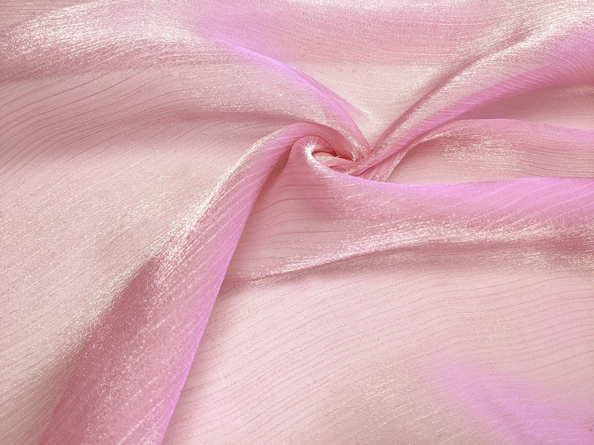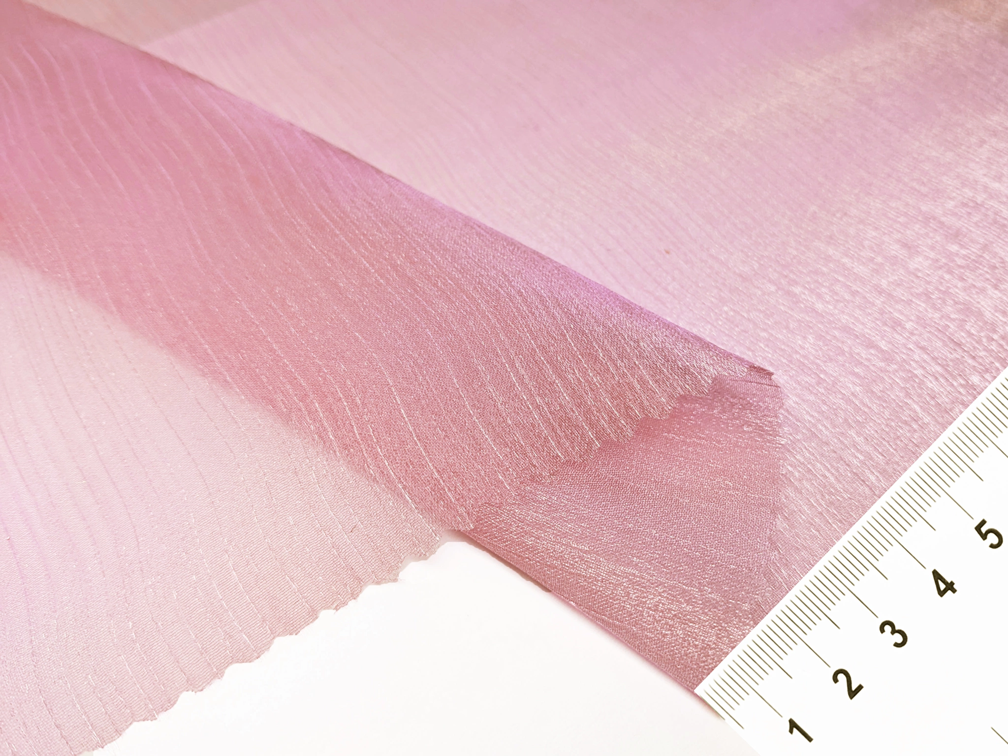 Органза креш – тонкий, прозорий, легкий матеріал з мерехтливою поверхнею та ефектом креш. Поверхня рельєфна, зі смугастою структурою та благородним легким сяйвом. Органза нееластична, не зминається, тактильно дуже комфортна та приємна.