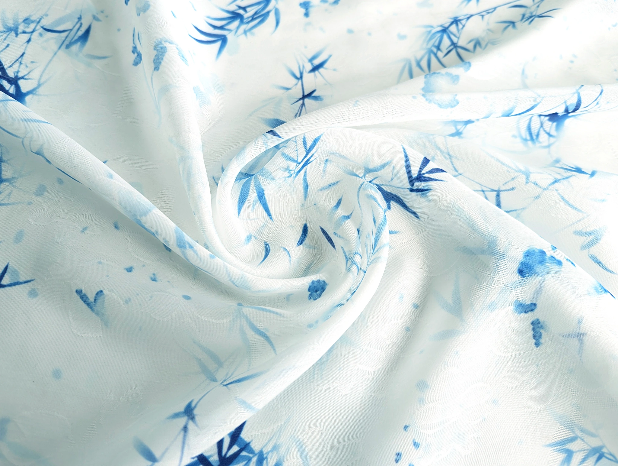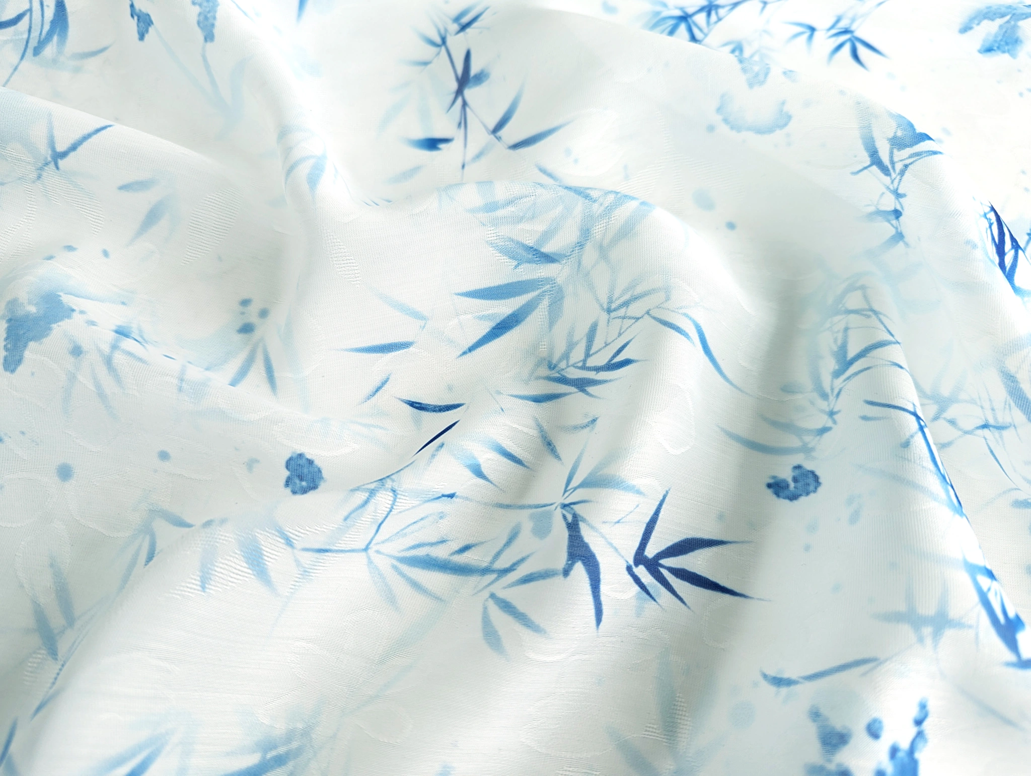 Органза жакард - тонкий, легкий, напівпрозорий матеріал з жакардовим плетінням, що створює на поверхні тканини флористичні візерунки. Тканина нееластична, злегка мнеться, під час драпірування збірки і складки утворюють м'яку і повітряну форму. Полотно тактильно м'яке і комфортне.