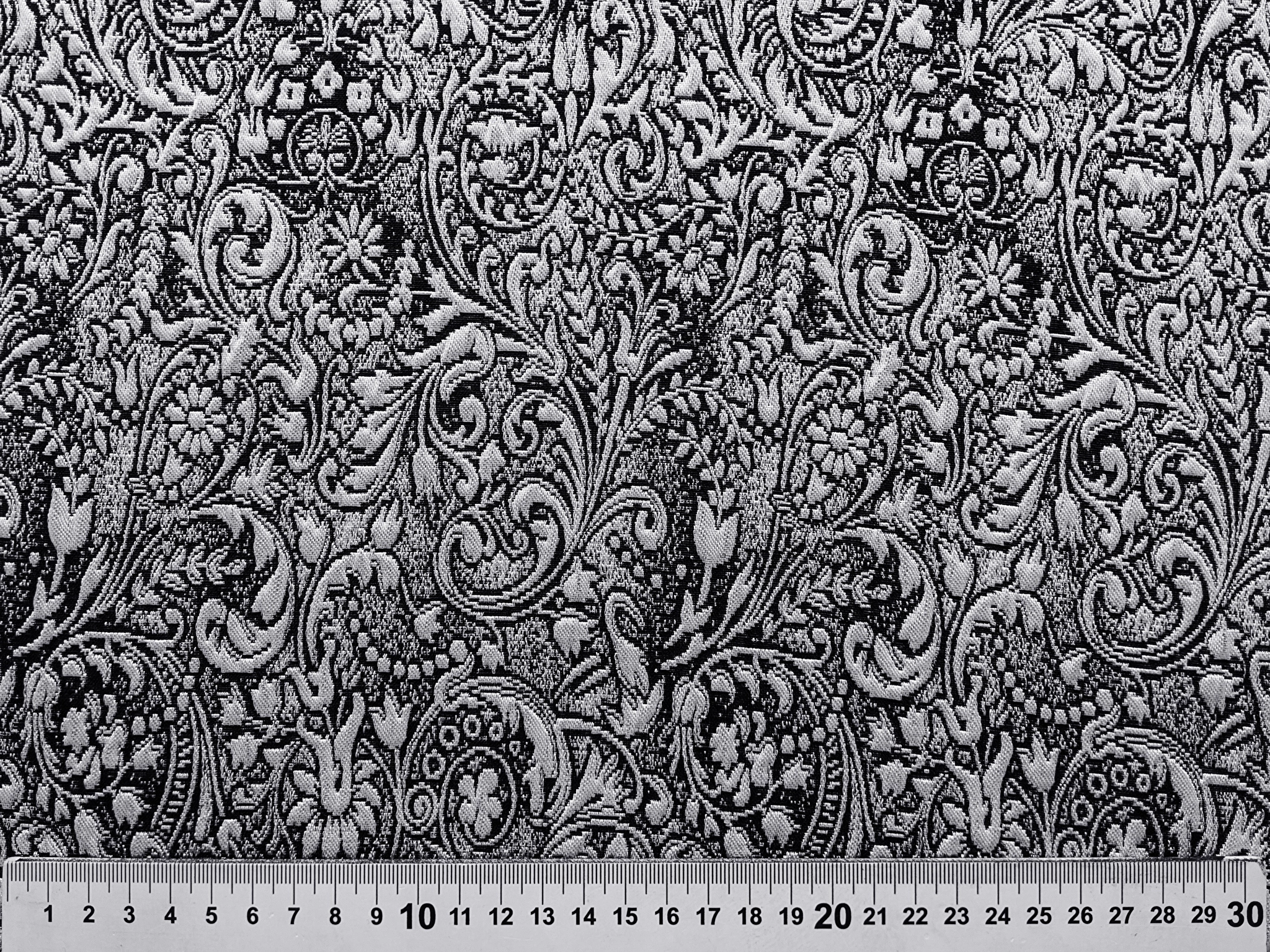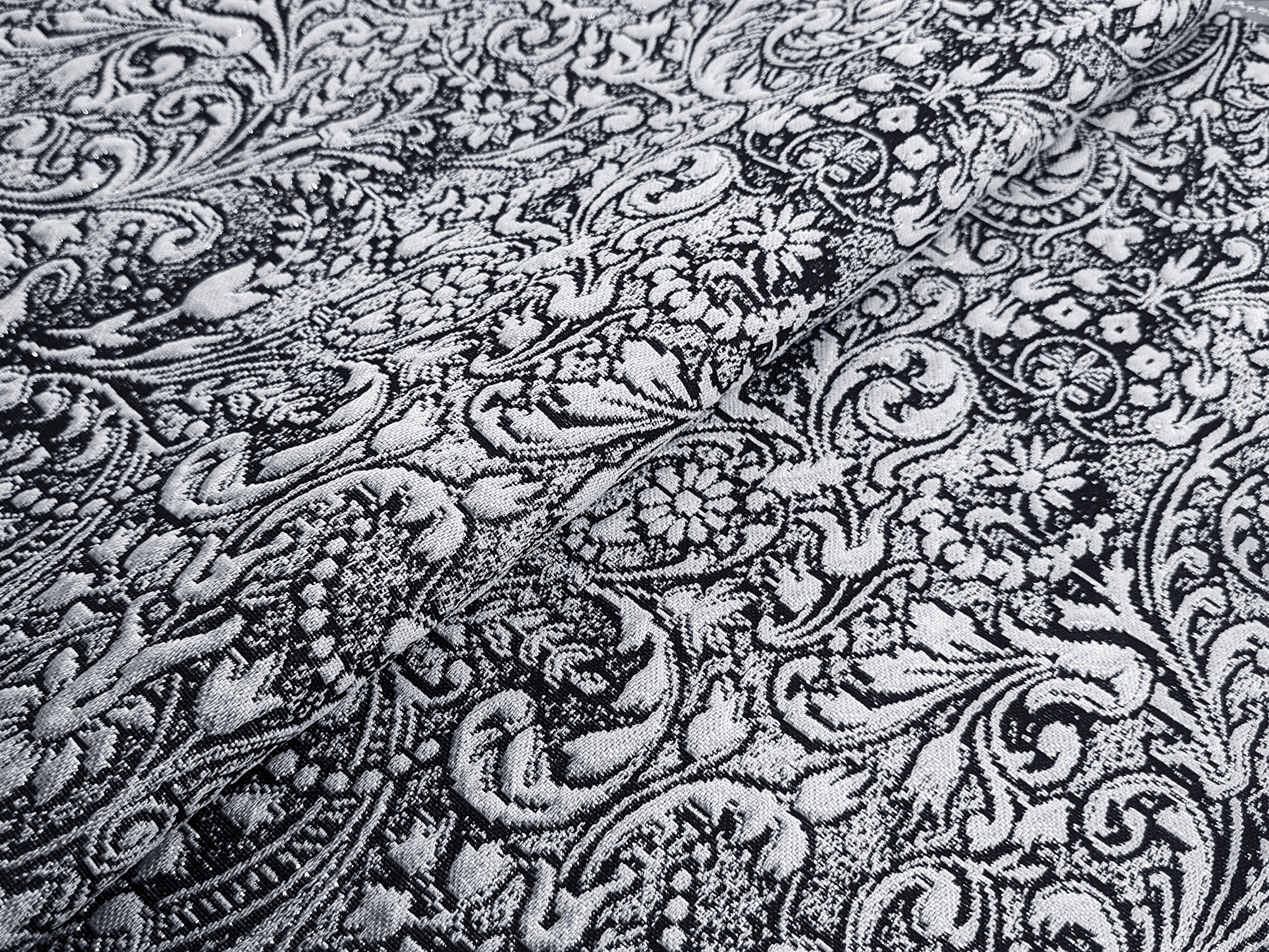Тканина має структурний малюнок та люрексові нитки, що робить її ошатною.Полотно не мнеться, не тягнеться, добре драпірується, утворюючи стійку складку.