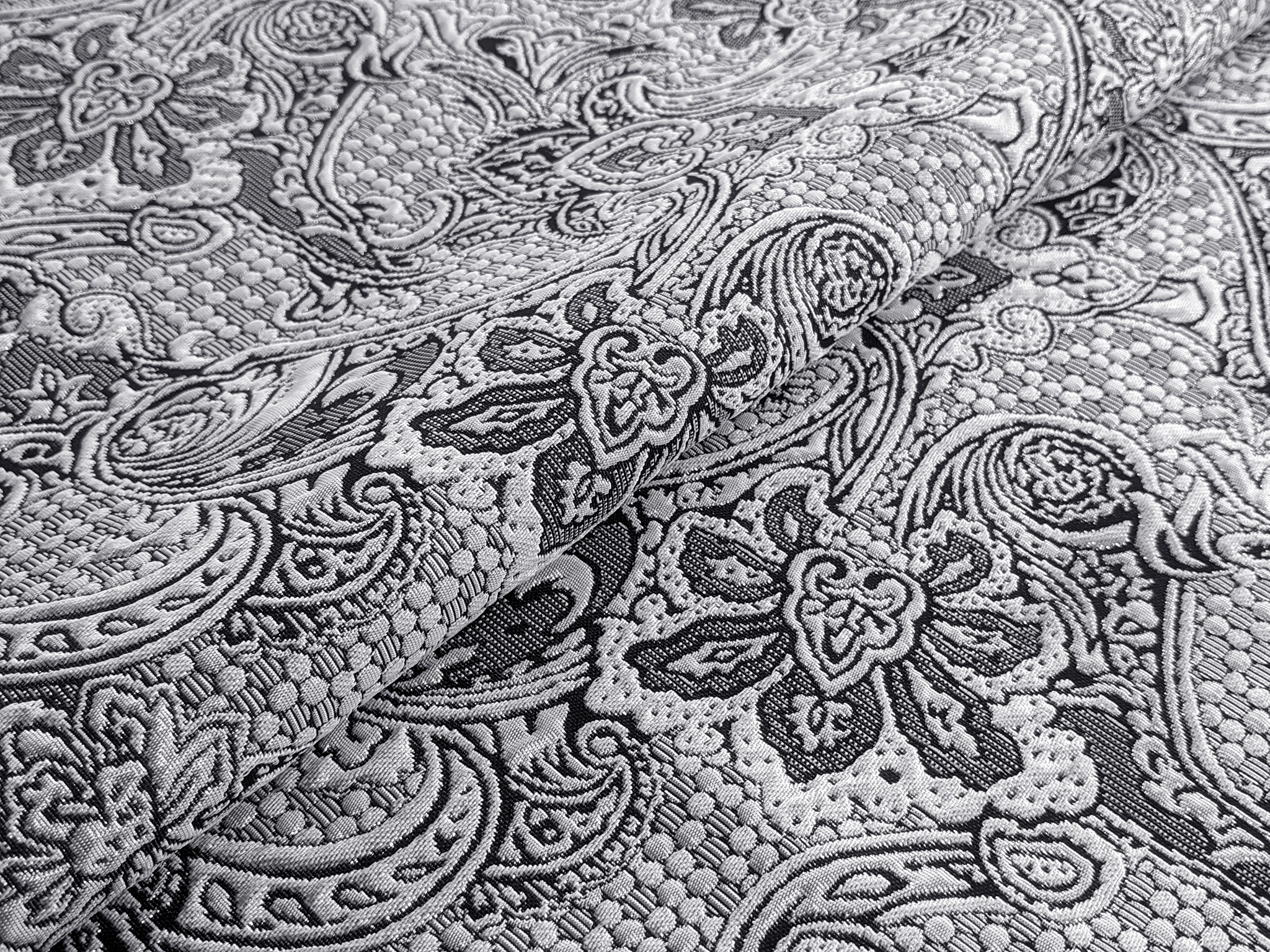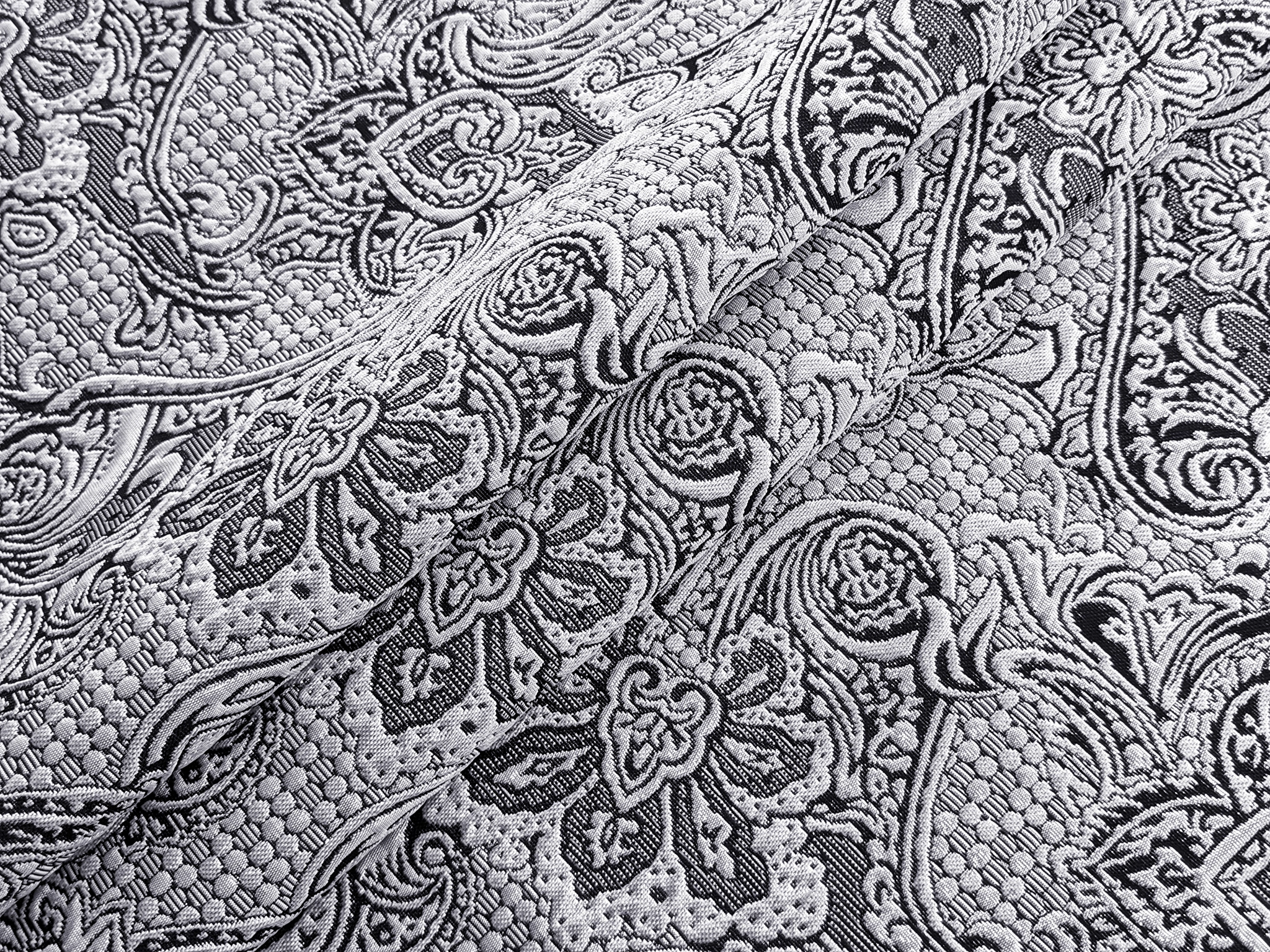 Тканина має структурний малюнок та люрексові нитки, що робить її ошатною.Полотно не мнеться, не тягнеться, добре драпірується, утворюючи стійку складку.