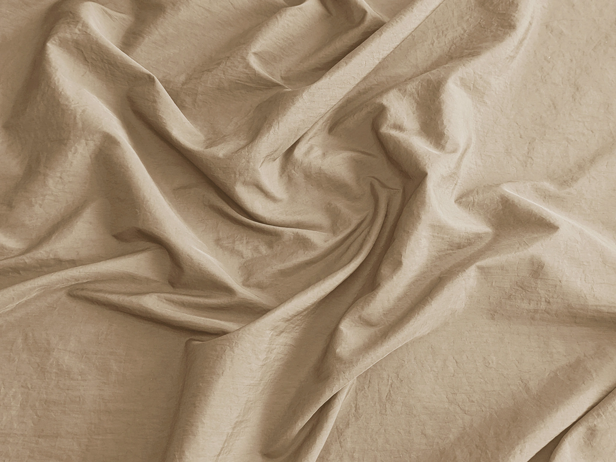 Плащовка щільна жата - це легка і тонка тканина з дуже щільним переплетенням ниток. Тканина дуже міцна, тактильно приємна, з матовою поверхнею та злегка жатою текстурою. На дотик м'яка, трохи ковзна, комфортна в носінні, створює легкий ефект, що шарудить, без просочення. При драпіруванні складки набувають м'якої, повітряної форми. Матеріал нееластичний, міцний, зносостійкий.