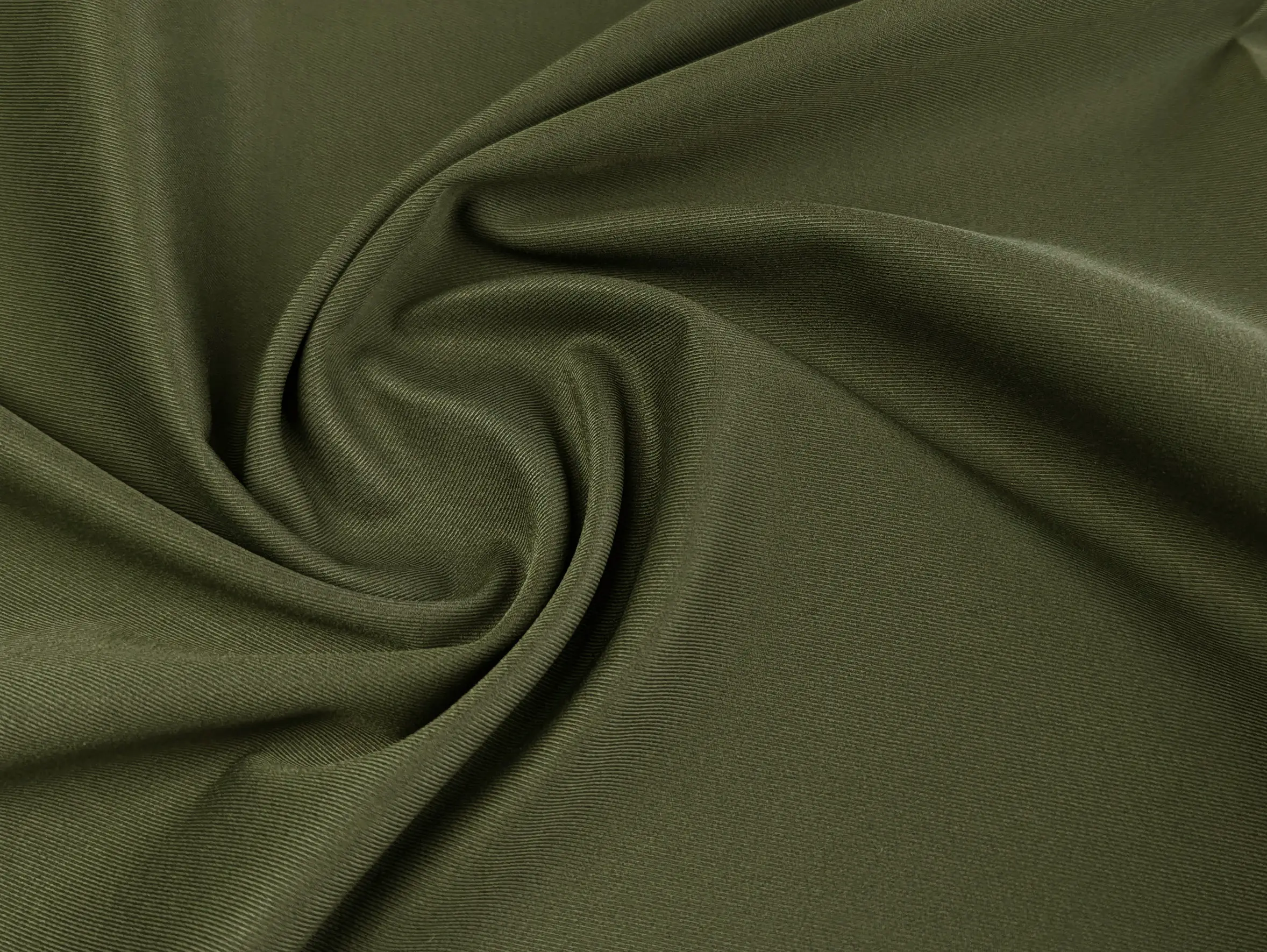 Лицьовий бік має виразний полірований блиск та діагональну структуру. Тканина трохи тягнеться, злегка мнеться, добре драпірується, утворюючи м’які повітряні складки. Полотно щільне, не має силуетного просвіту навіть у молочному кольорі. Невибагливе у догляді, але рекомендовано делікатний режим прання.