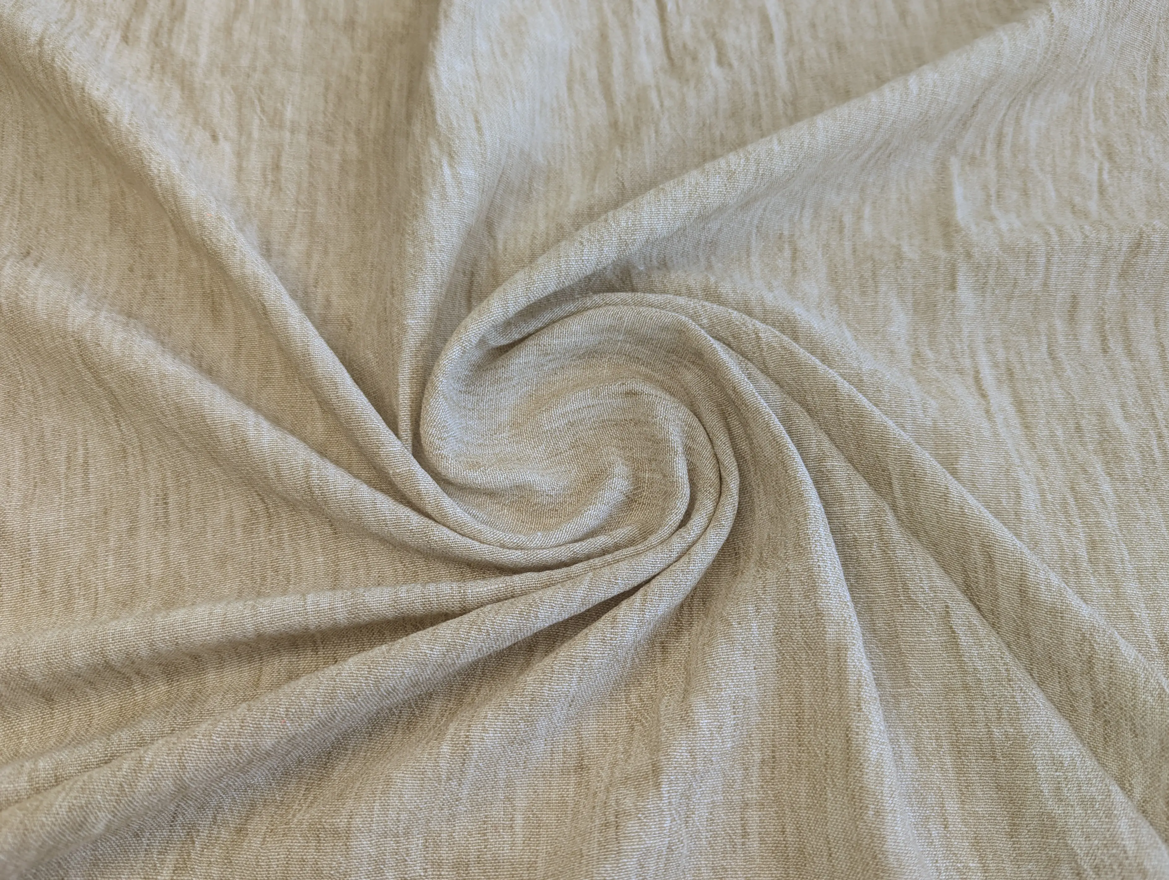 Полільон меланжевий - фактурна тканина з ефектом натурального льону та злегка жатою поверхнею. Тканина легка, м’яка, добре драпірується і не заминається. Забезпечує міцність і комфорт у носінні. Стійка до вигорання та легка у догляді.