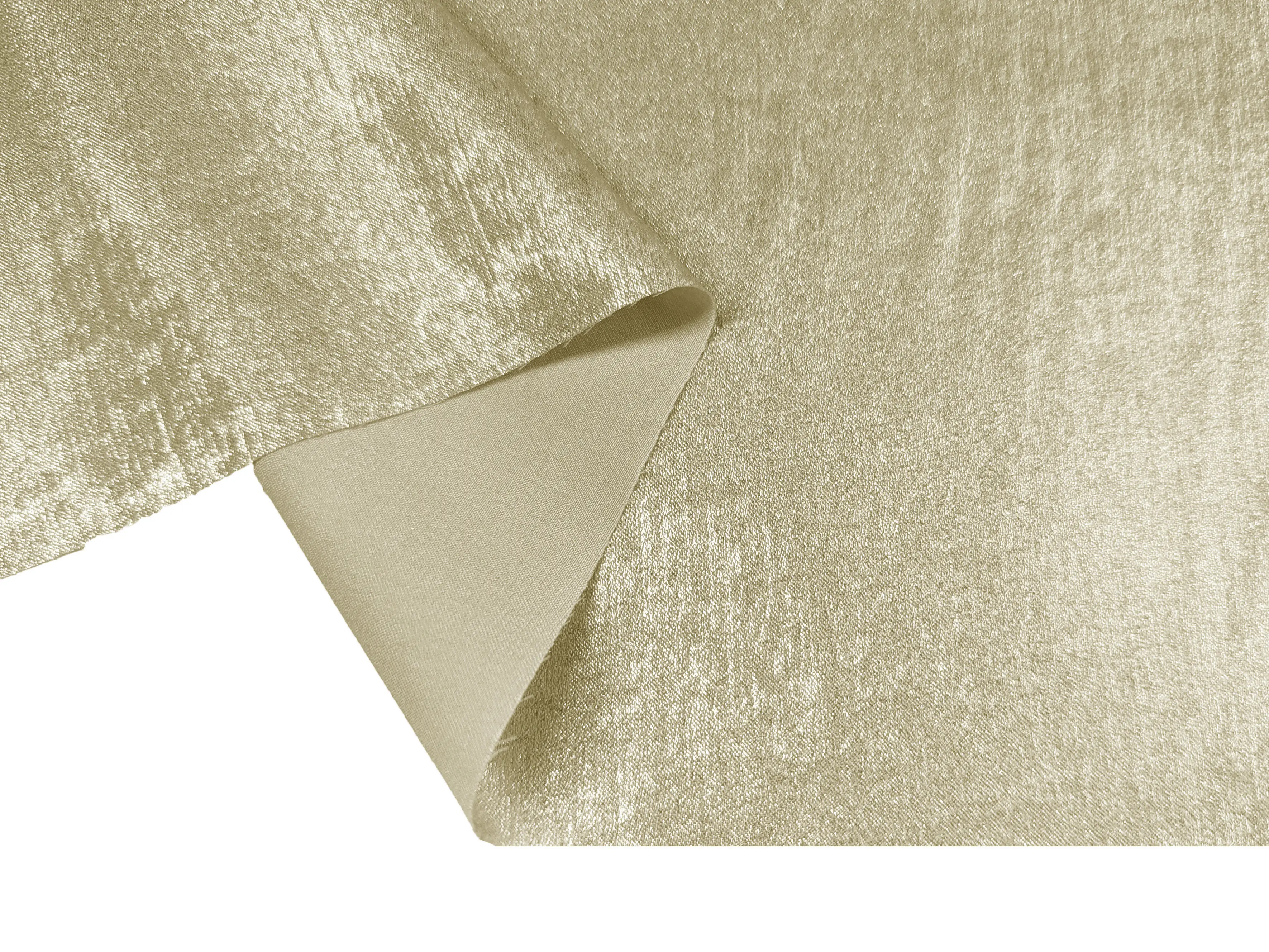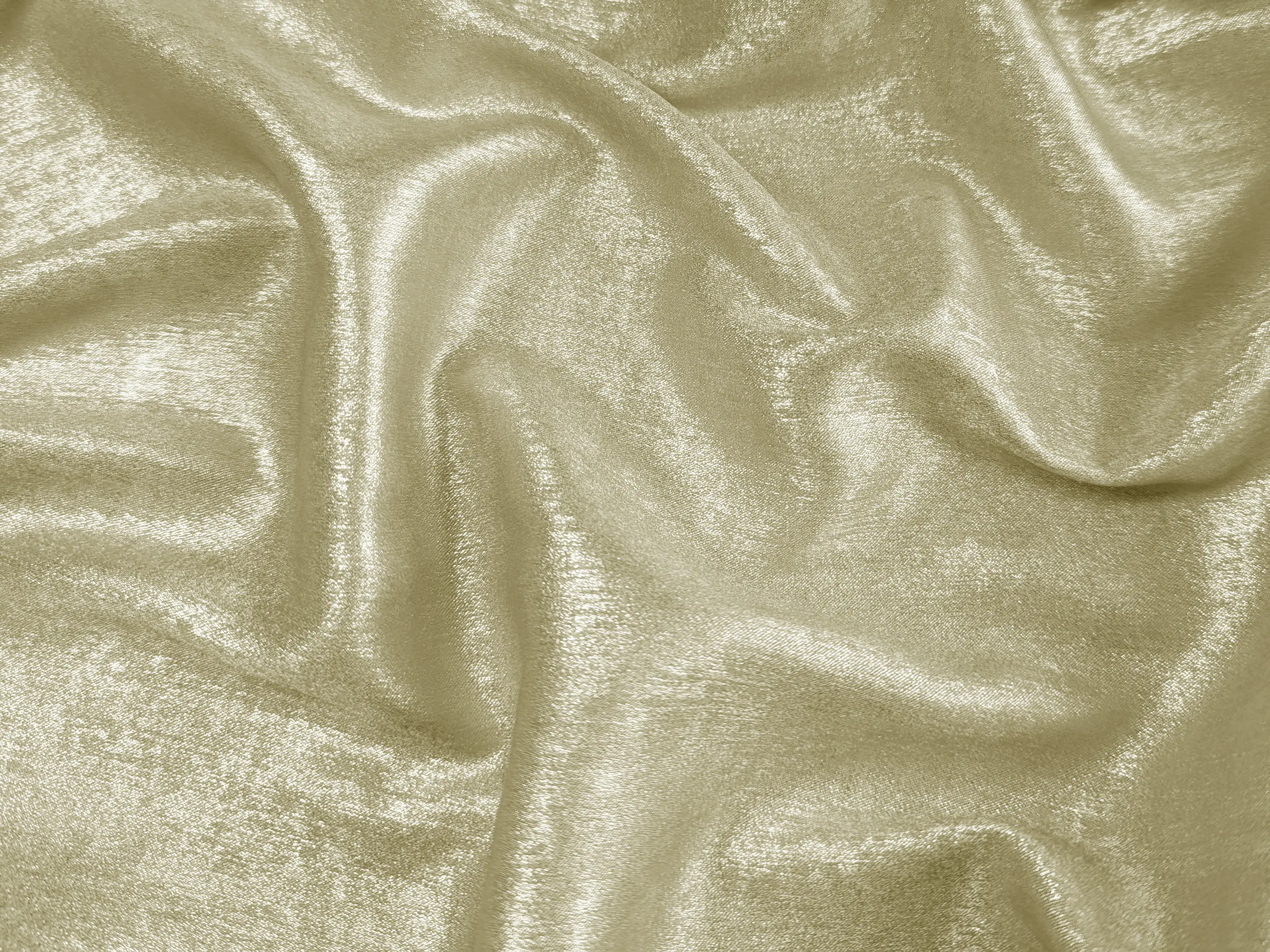 Сатин Шимер - тонкий, легкий, струмливий матеріал. Вплетена металізована нитка формує на поверхні тканини нерівномірний ефект сяйва, що переливається, зворотний бік однотонний, гладкий, матовий. На дотик матеріал злегка шорсткий, але водночас тактильно приємний, не еластичний, на тілі не просвічує, не мнеться, під час драпірування формуються плавні, м'які складки.
