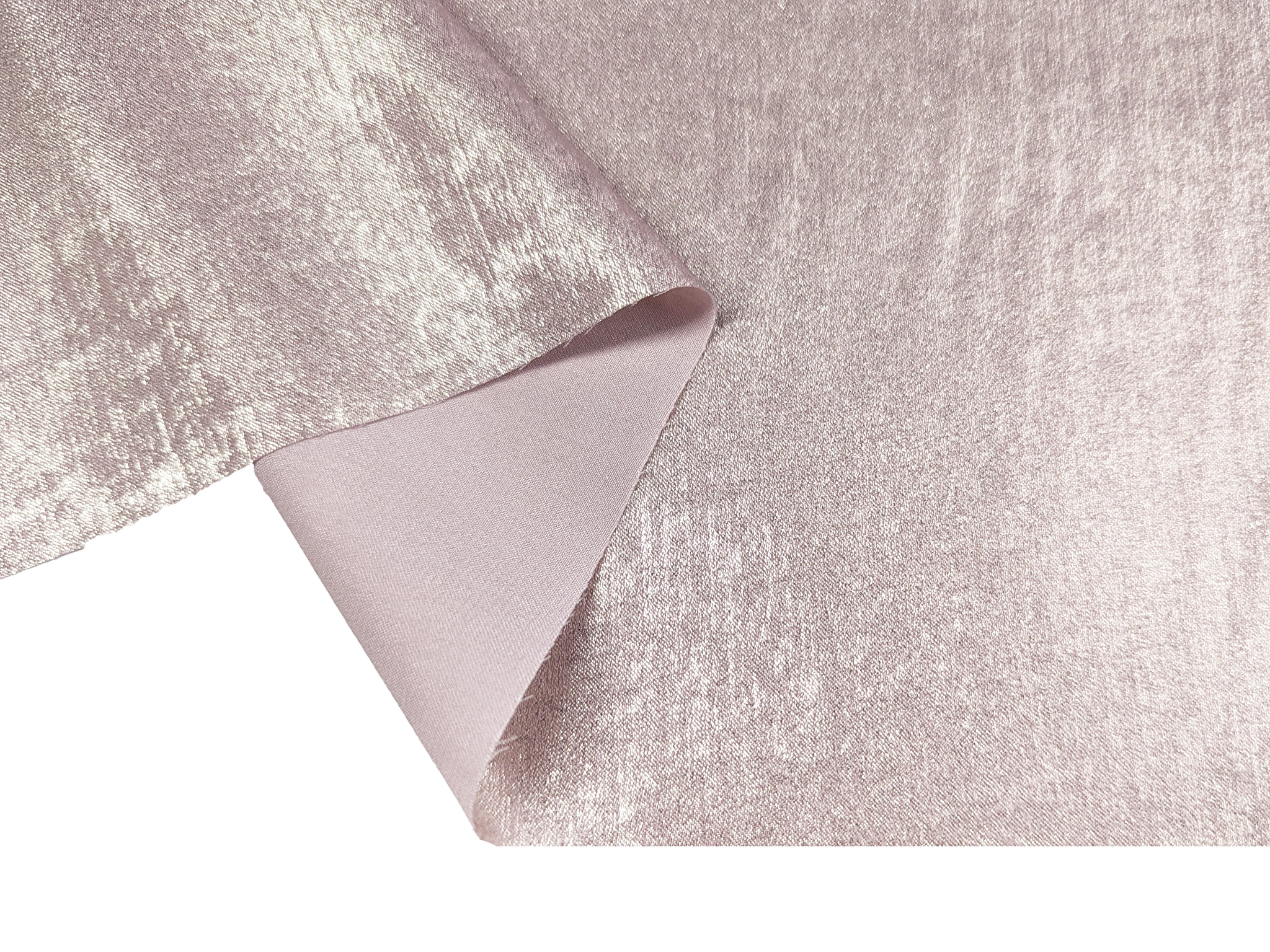 Сатин Шимер - тонкий, легкий, струмливий матеріал. Вплетена металізована нитка формує на поверхні тканини нерівномірний ефект сяйва, що переливається, зворотний бік однотонний, гладкий, матовий. На дотик матеріал злегка шорсткий, але водночас тактильно приємний, не еластичний, на тілі не просвічує, не мнеться, під час драпірування формуються плавні, м'які складки.