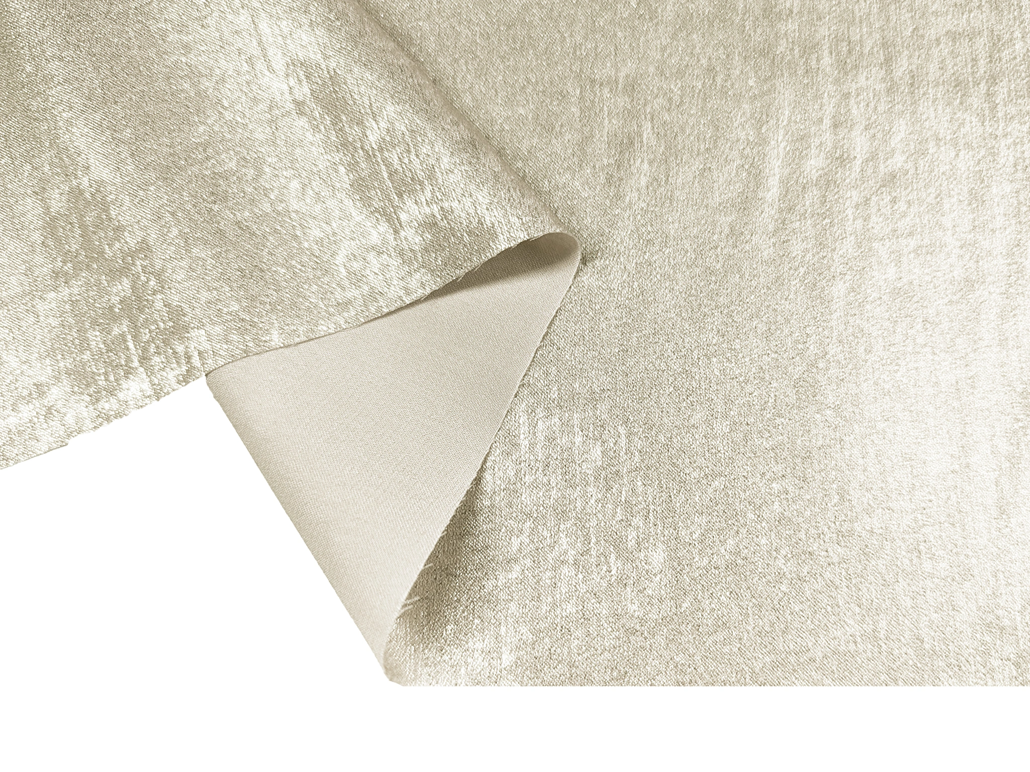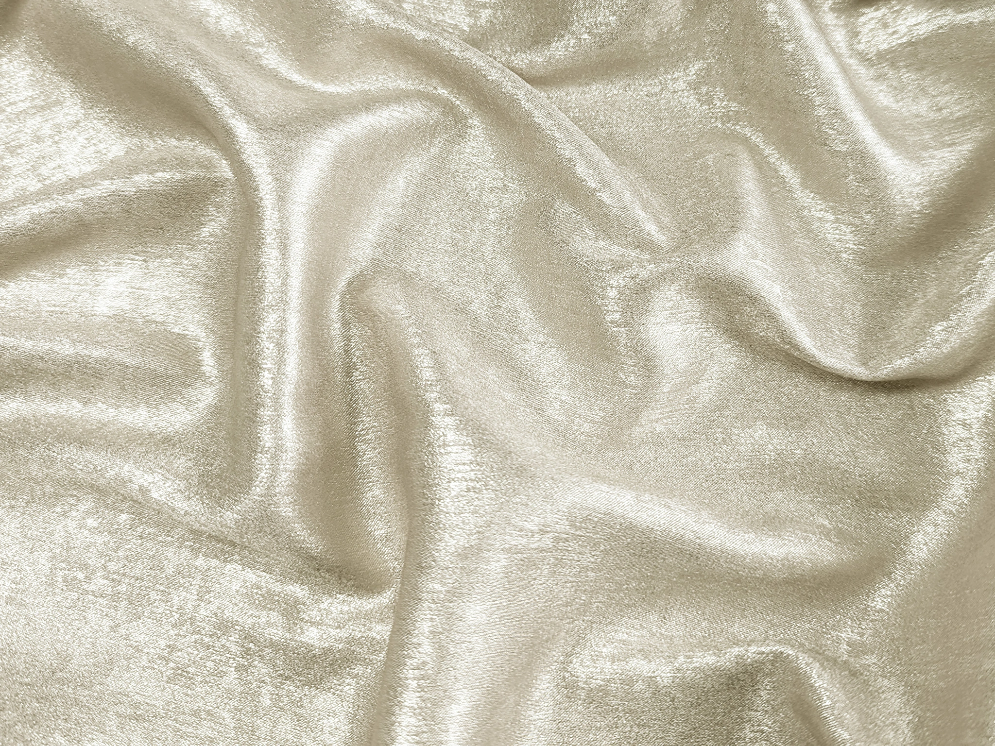 Сатин Шимер - тонкий, легкий, струмливий матеріал. Вплетена металізована нитка формує на поверхні тканини нерівномірний ефект сяйва, що переливається, зворотний бік однотонний, гладкий, матовий. На дотик матеріал злегка шорсткий, але водночас тактильно приємний, не еластичний, на тілі не просвічує, не мнеться, під час драпірування формуються плавні, м'які складки.