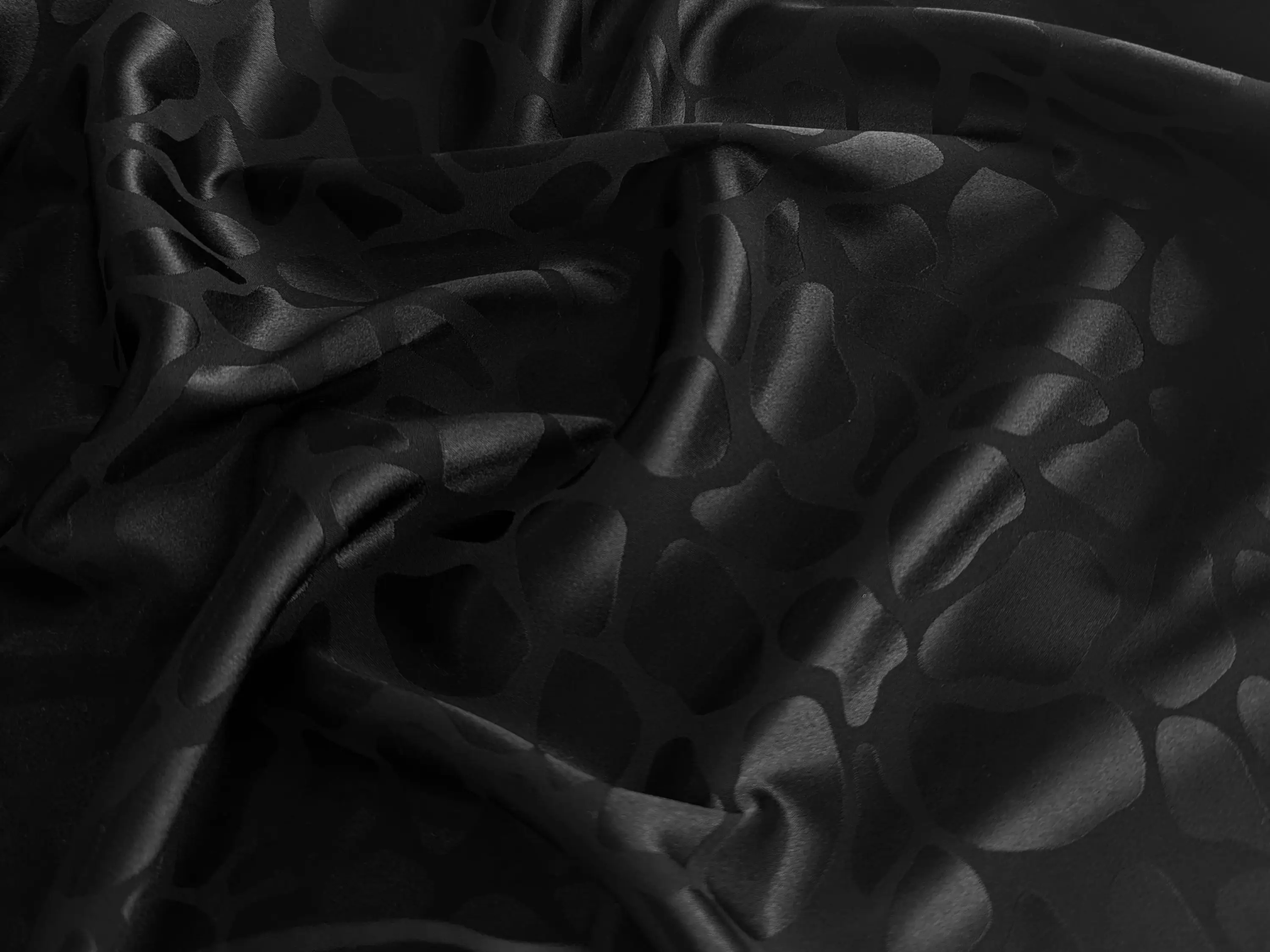 Сатин жакард - тонка, легка, гладка тканина з фактурним жакардовим малюнком і благородним сатиновим блиском. Тактильно матеріал м'який, ковзний і шовковистий. Тканина не мнеться, легка еластичність присутня по ширині полотна, світлі відтінки мають легкий силуетний просвіт. Під час драпірування укладається в м'які складки.