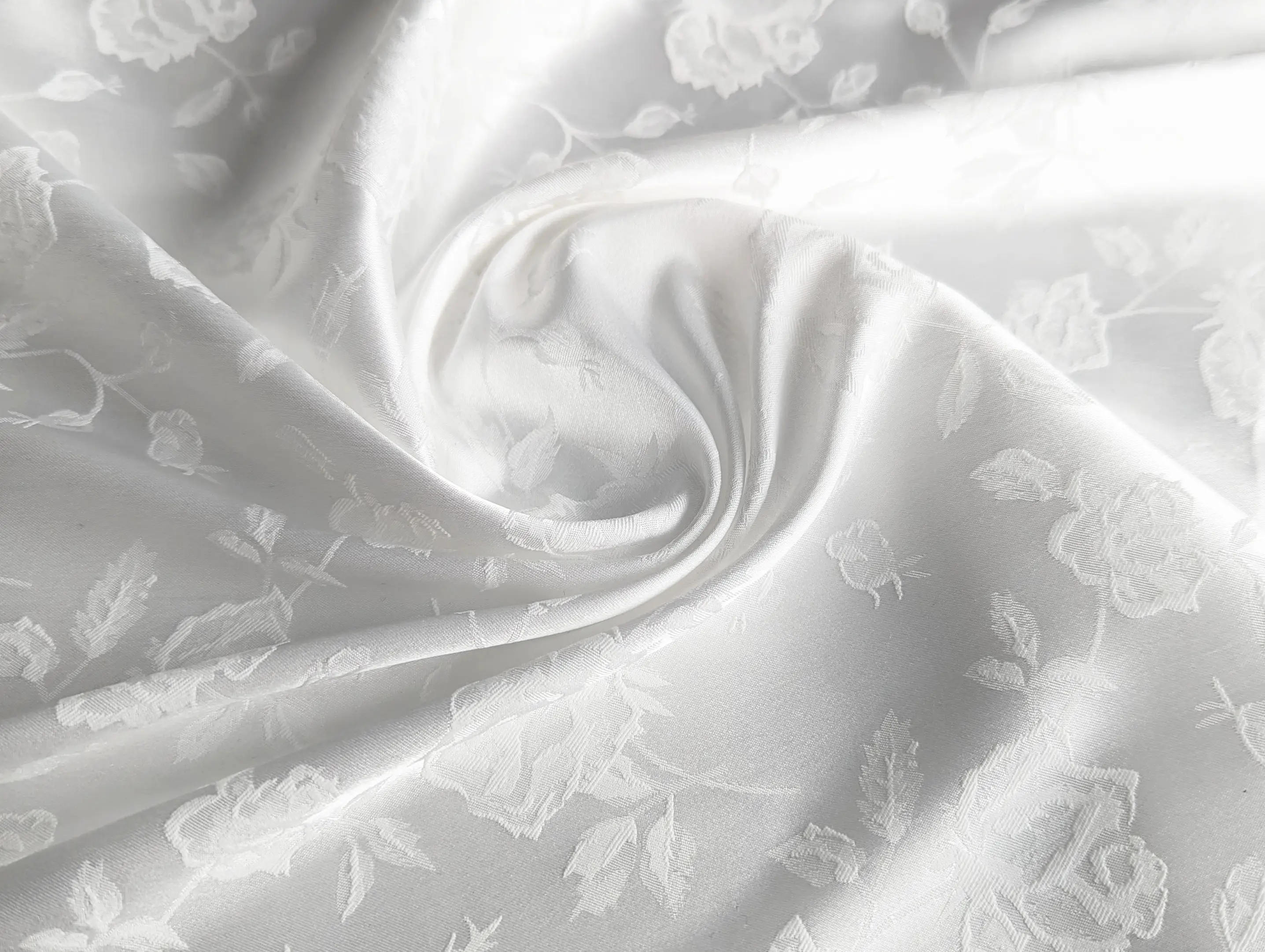 Сатин жаккард підходить для створення вечірніх і коктейльних вбрань, суконь, блуз, спідниць, костюмів з м'яким силуетом, сорочок, білизняних костюмів, а також можна використовувати як підкладку.