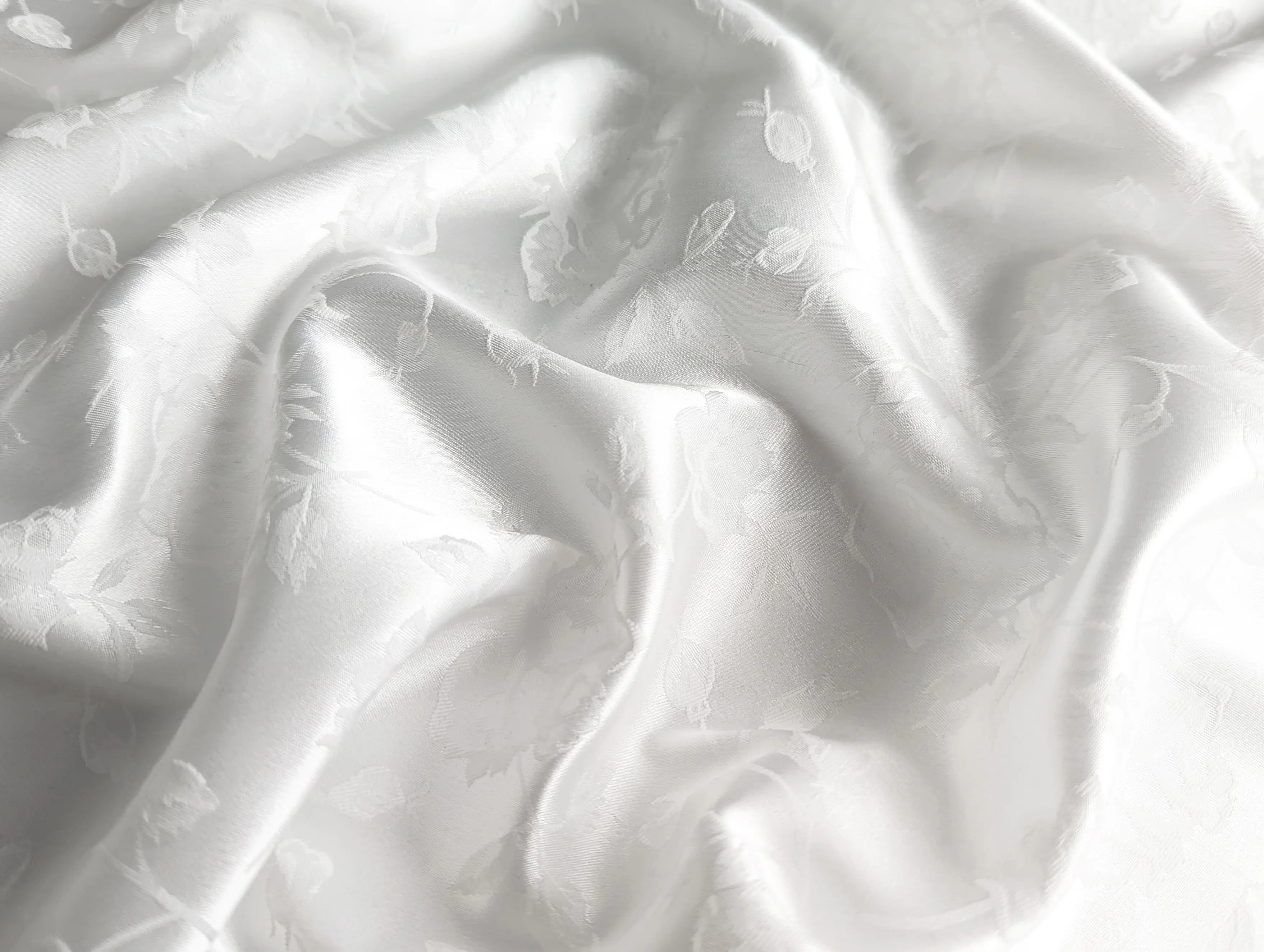 Сатин жакард - тонка, легка, гладка тканина з фактурним жакардовим малюнком і благородним сатиновим блиском. Тактильно матеріал м'який, ковзний і шовковистий. Тканина не мнеться, легка еластичність присутня по ширині полотна, світлі відтінки мають легкий силуетний просвіт. Під час драпірування укладається в м'які складки.