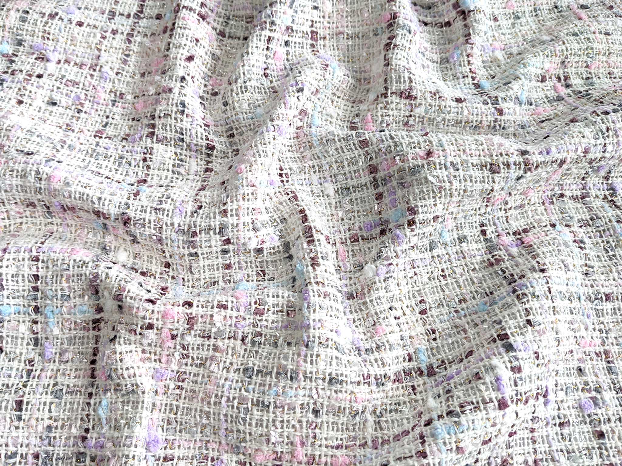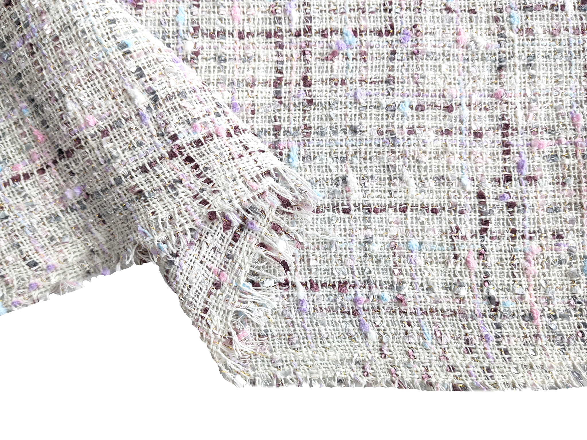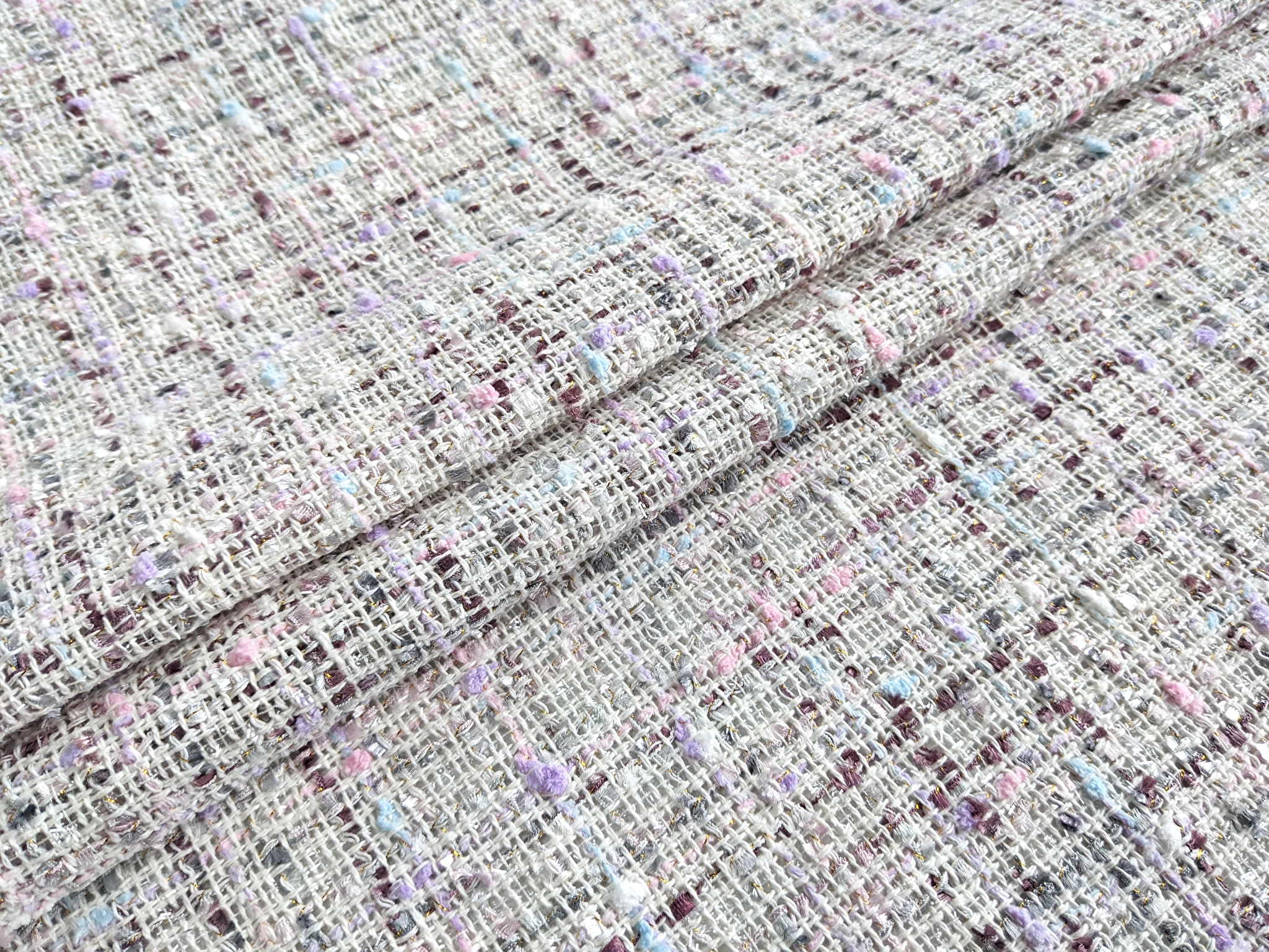 Шанель твід дуже приємна на дотик тканина, м'яка, зносостійка, тепла. По всьому полотну вплетена люрексова нитка. Виворіт тканини не колеться. Полотно щільне, але не важке, не мнеться, не деформується і не розтягується. Жаккардовая структура полотна дозволяє створювати бахрому, як яскравий додатковий елемент виробу. Жіночі костюми, жакети, пальто додадуть вашому образу жіночності та елегантності.