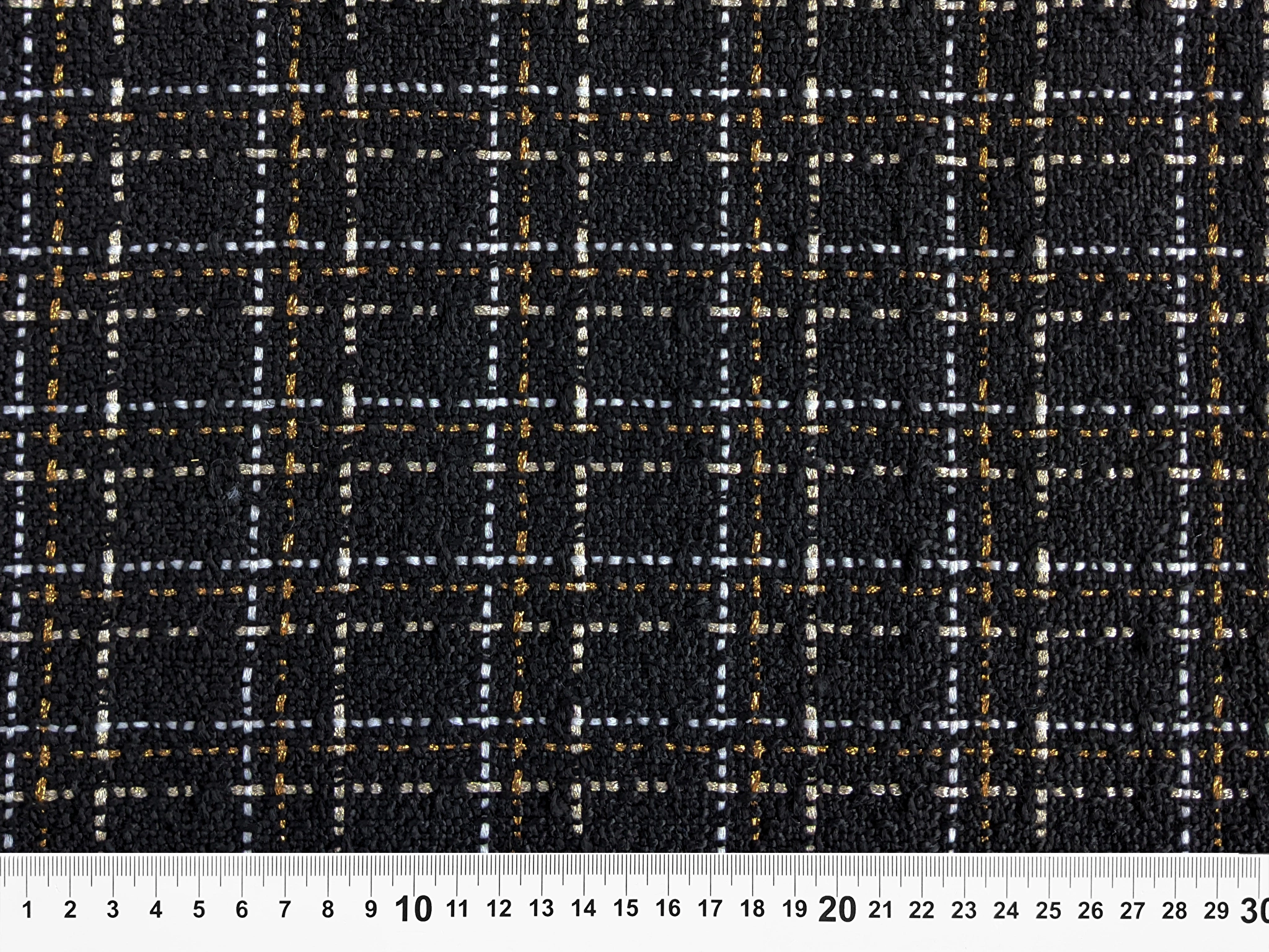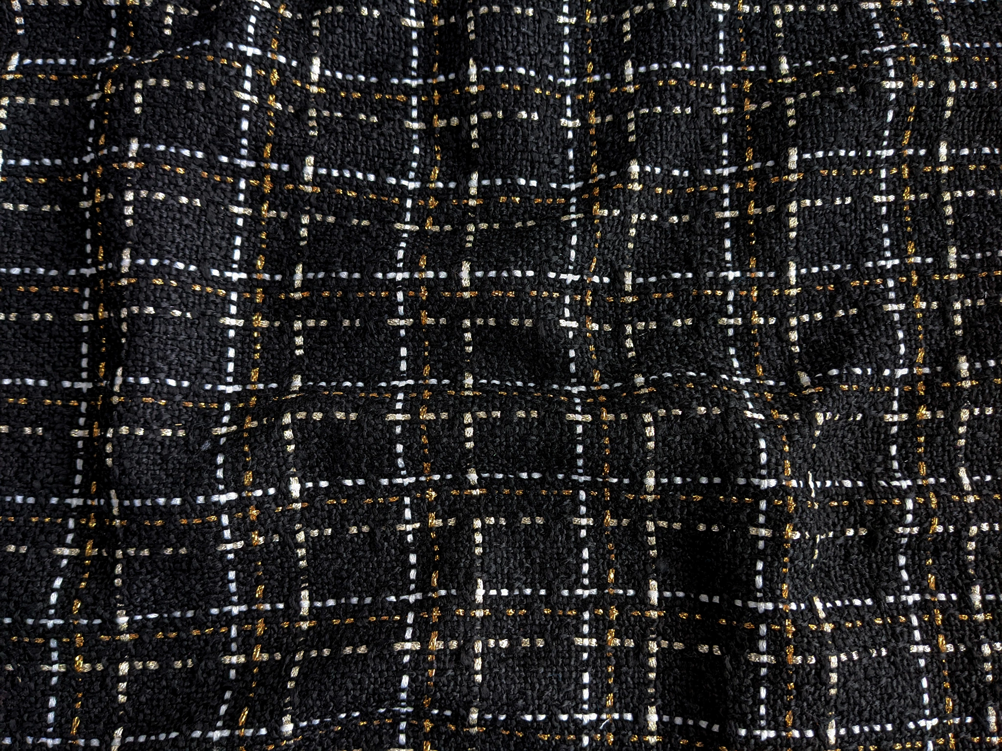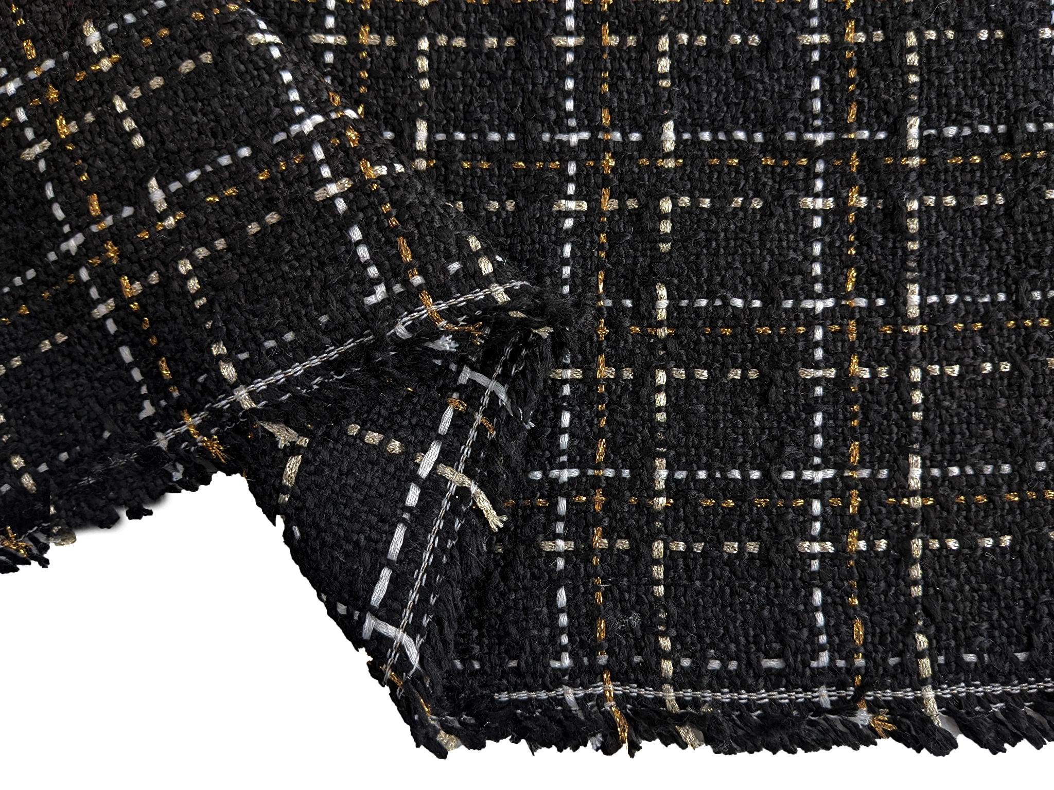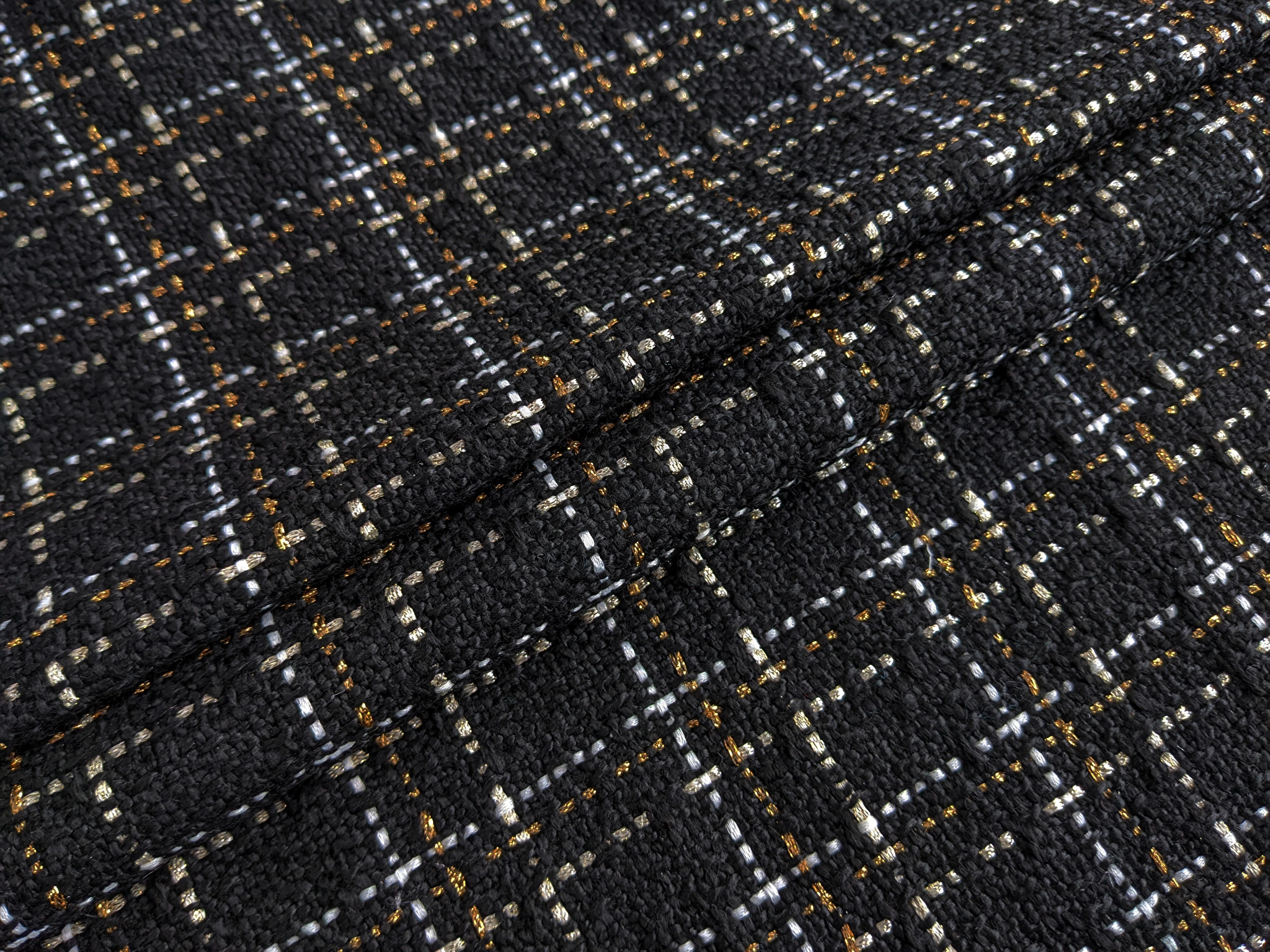 Шанель твід дуже приємна на дотик тканина, м'яка, зносостійка, тепла. По всьому полотну вплетена люрексова нитка. Виворіт тканини не колеться. Полотно щільне, але не важке, не мнеться, не деформується і не розтягується. Жаккардовая структура полотна дозволяє створювати бахрому, як яскравий додатковий елемент виробу. Жіночі костюми, жакети, пальто додадуть вашому образу жіночності та елегантності.