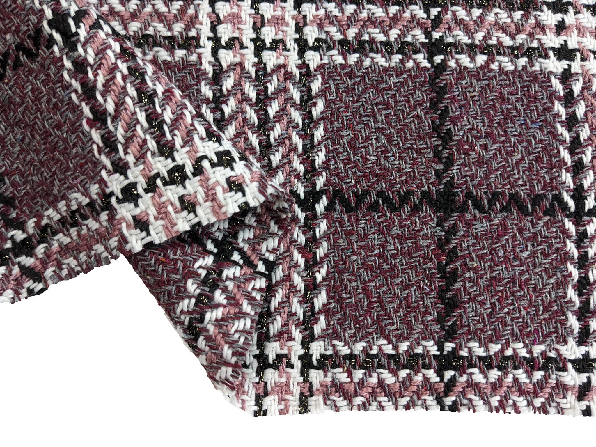 Шанель твід дуже приємна на дотик тканина, м'яка, зносостійка, тепла. По всьому полотну вплетена люрексова нитка. Виворіт тканини не колеться. Полотно щільне, але не важке, не мнеться, не деформується і не розтягується. Жаккардовая структура полотна дозволяє створювати бахрому, як яскравий додатковий елемент виробу. Жіночі костюми, жакети, пальто додадуть вашому образу жіночності та елегантності.