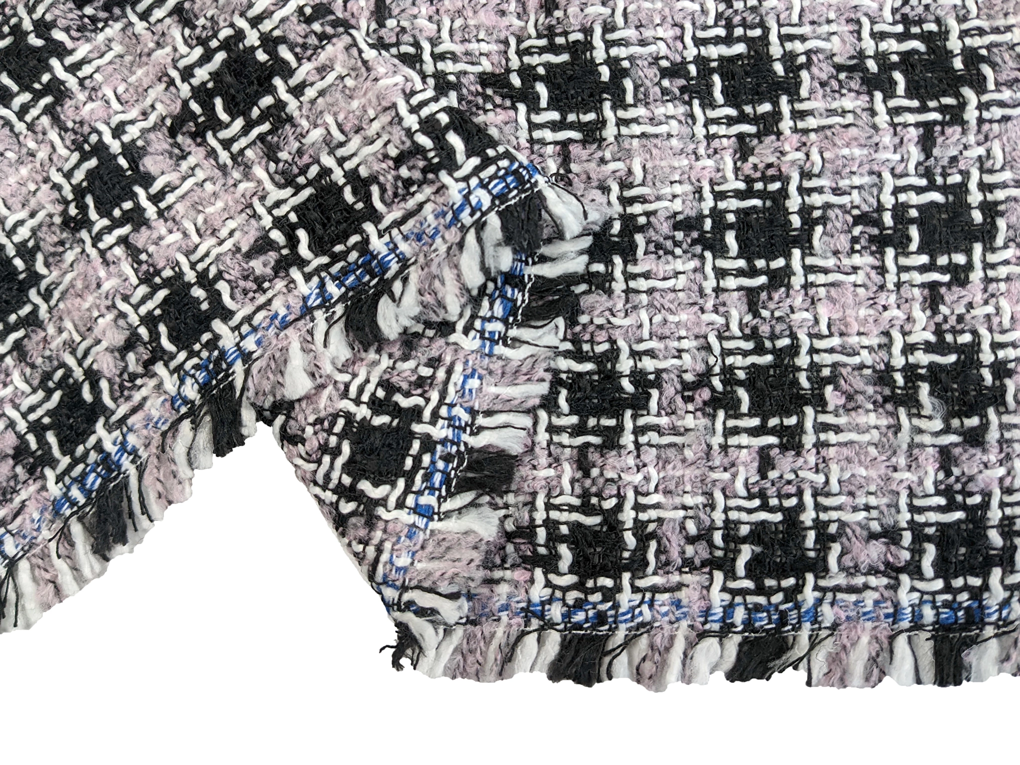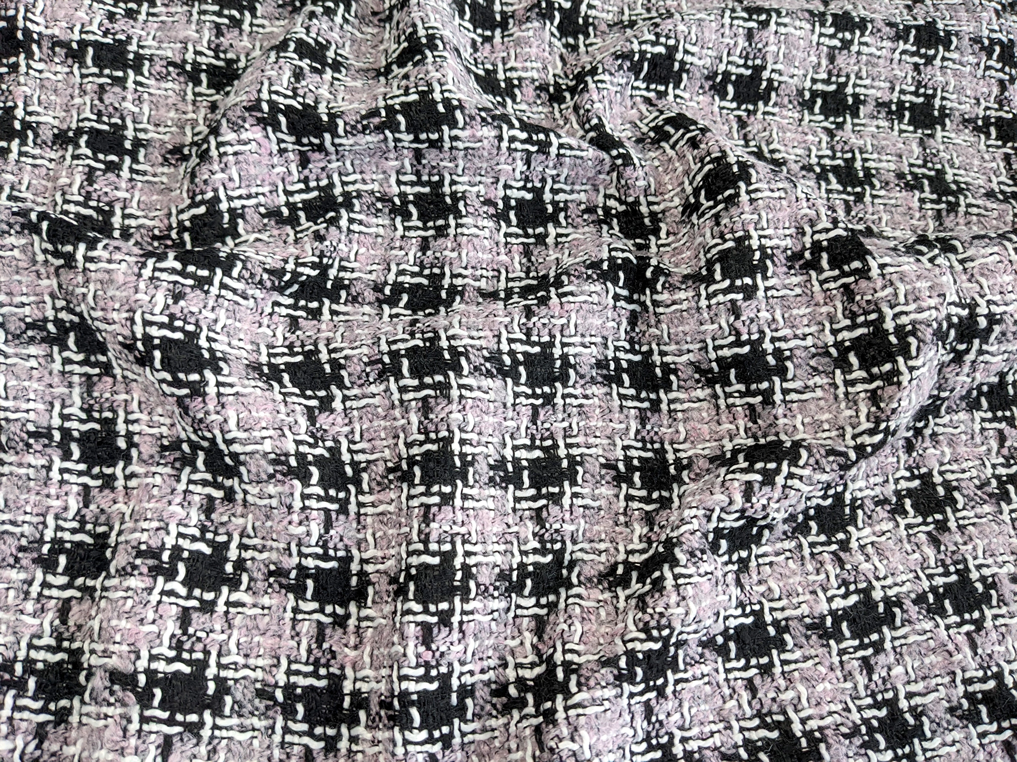 Шанель твид очень приятная на ощупь ткань, мягкая, износоустойчивая, теплая. По всему полотну вплетена люрексовая нить. Изнанка ткани не колется. Полотно плотное, но не тяжелое, не сминается, не деформируется и не растягивается. Жаккардовая структура полотна позволяет создавать бахрому, как яркий дополнительный элемент изделия. Женские костюмы, жакеты, пальто добавят вашему образу женственности и элегантности.