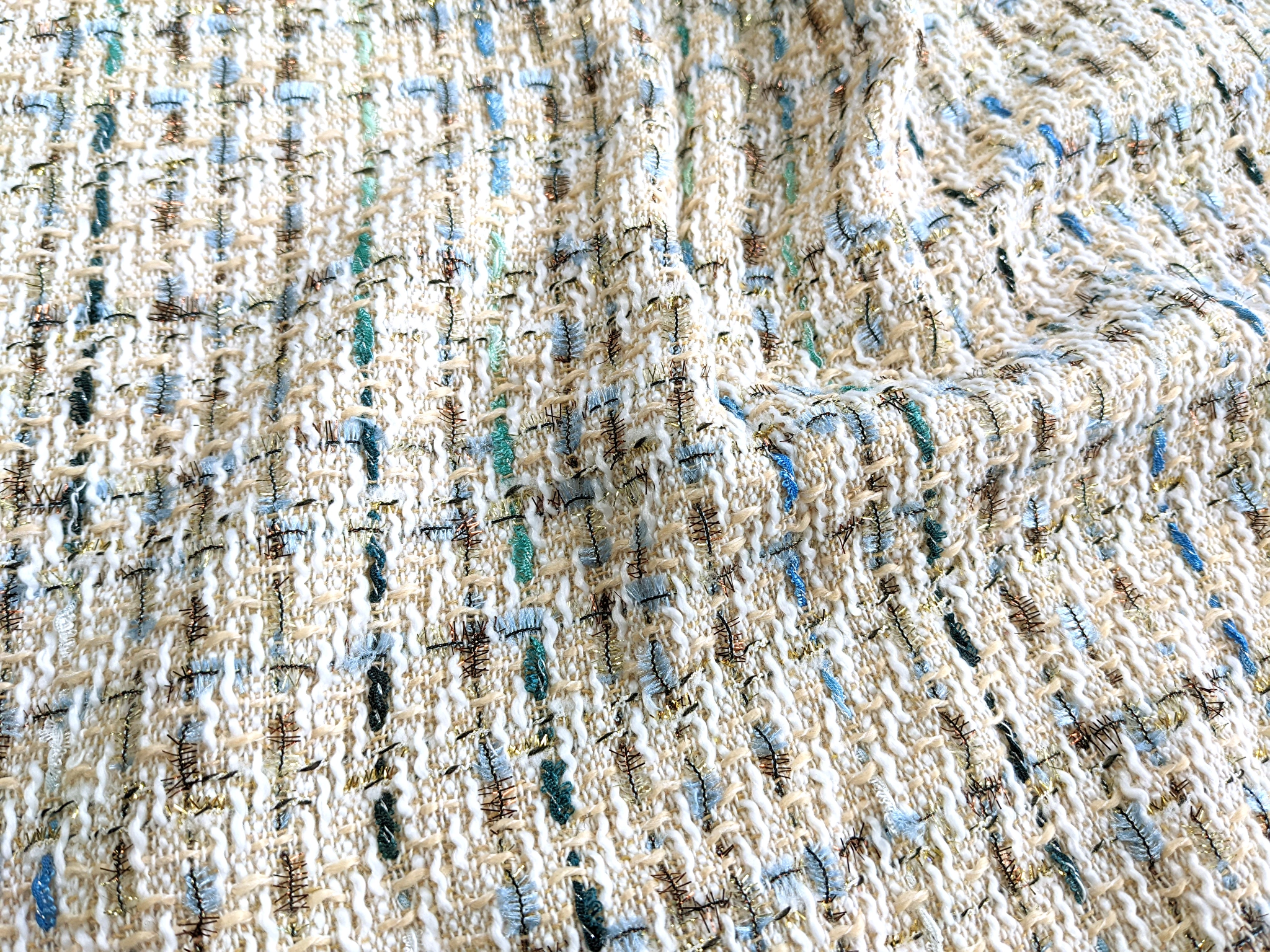 Шанель твід дуже приємна на дотик тканина, м'яка, зносостійка, тепла. По всьому полотну вплетена люрексова нитка. Виворіт тканини не колеться. Полотно щільне, але не важке, не мнеться, не деформується і не розтягується. Жаккардовая структура полотна дозволяє створювати бахрому, як яскравий додатковий елемент виробу. Жіночі костюми, жакети, пальто додадуть вашому образу жіночності та елегантності.