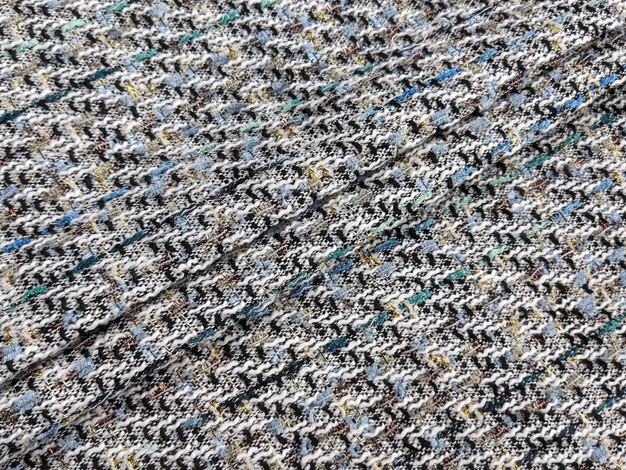 Шанель твід дуже приємна на дотик тканина, м'яка, зносостійка, тепла. По всьому полотну вплетена люрексова нитка. Виворіт тканини не колеться. Полотно щільне, але не важке, не мнеться, не деформується і не розтягується. Жаккардовая структура полотна дозволяє створювати бахрому, як яскравий додатковий елемент виробу. Жіночі костюми, жакети, пальто додадуть вашому образу жіночності та елегантності.