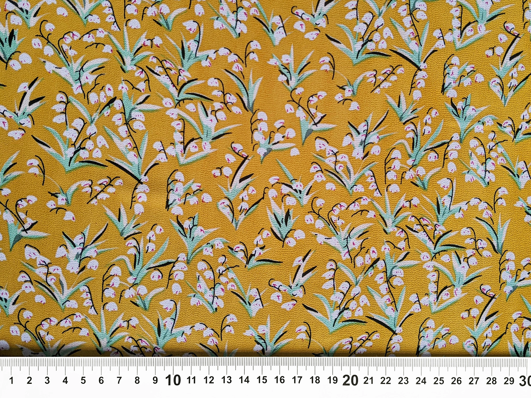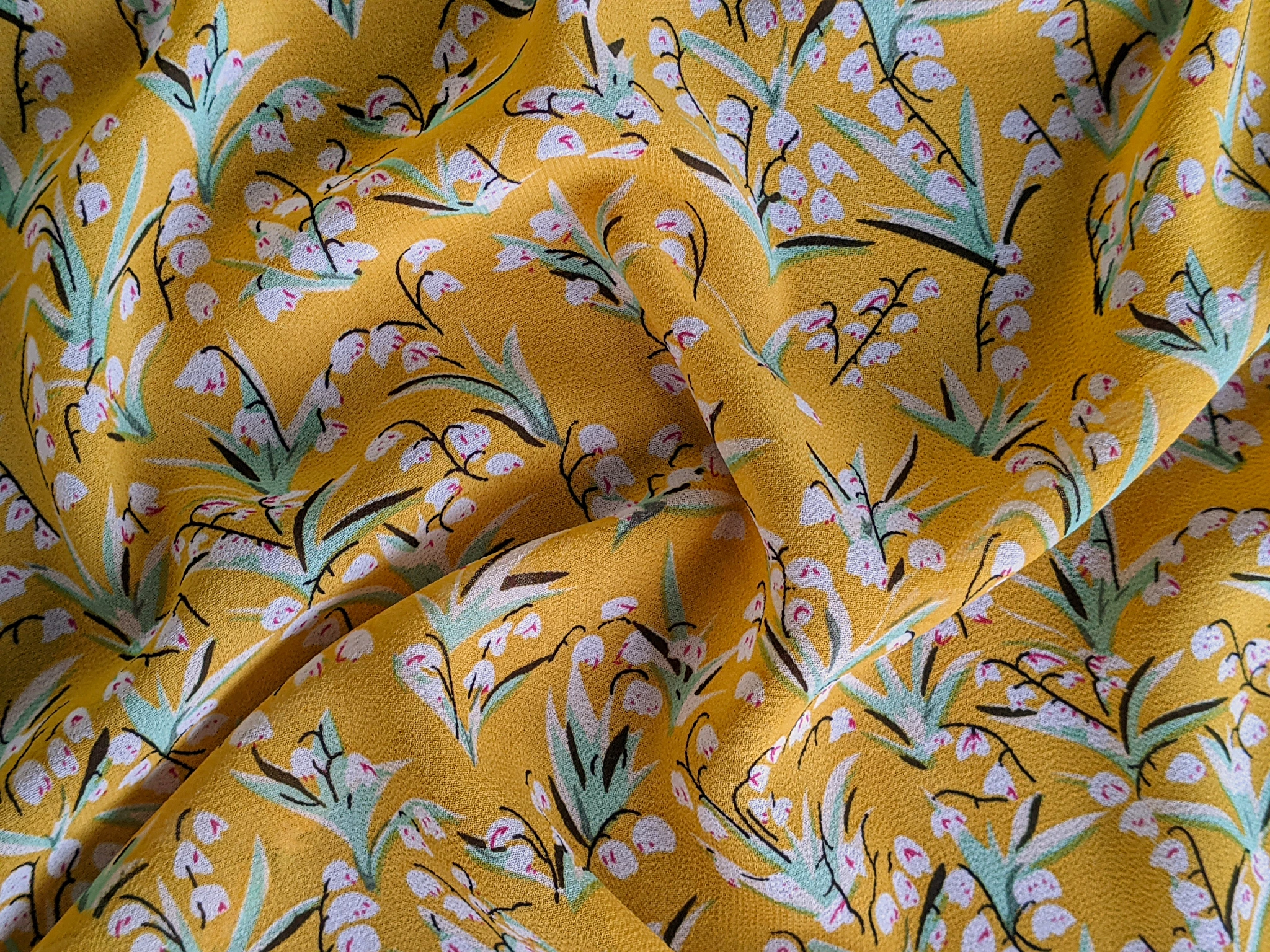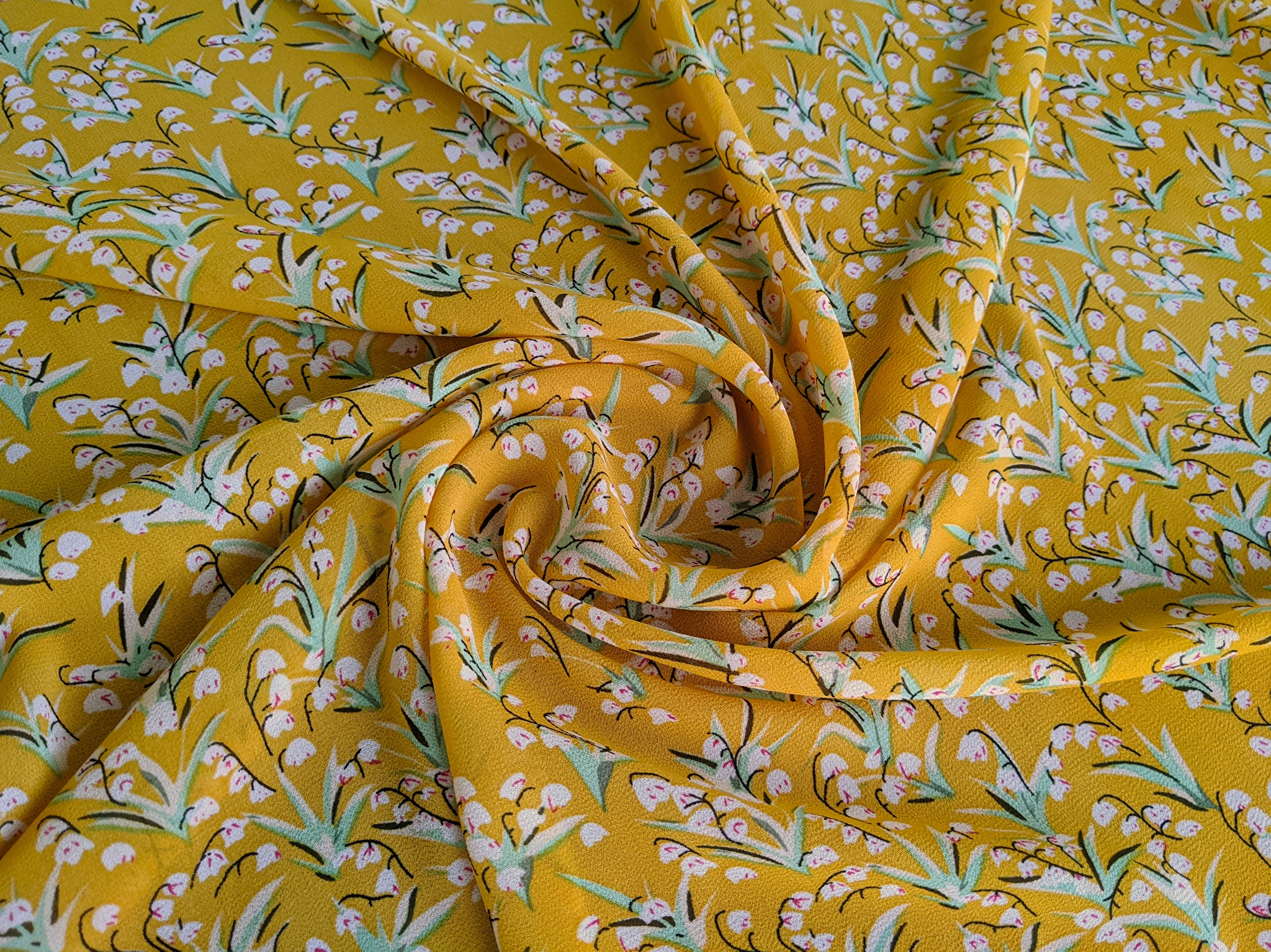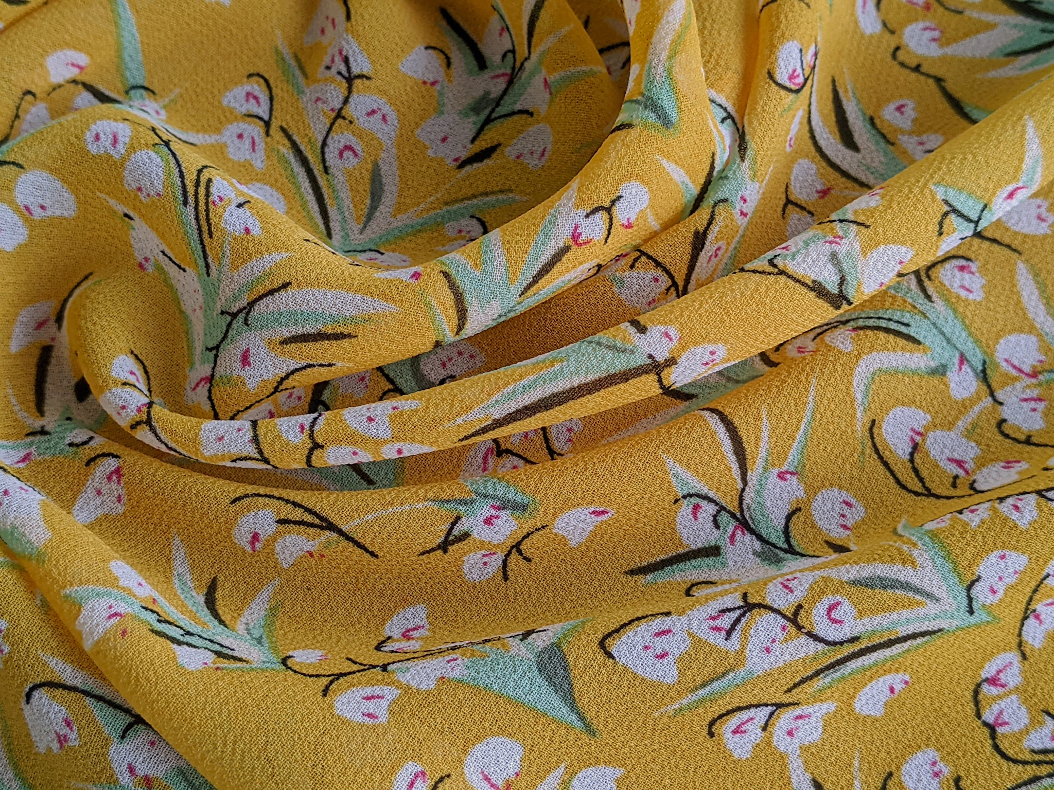 Прінтованний креп-шифон - це напівпрозора шорстка тканина. Тканина красиво драпірується. Прати й прасувати вироби з крепа- шифону необхідно з обережністю, обираючи делікатні режими. Полотно дуже міцне завдяки туго переплетеним ниткам. Для пошиття суконь рекомендуємо придбати легку підкладкову тканину. Креп-шифон використовують для пошиття суконь, сарафанів і блуз.