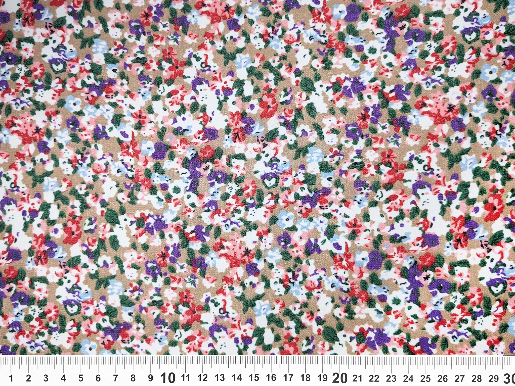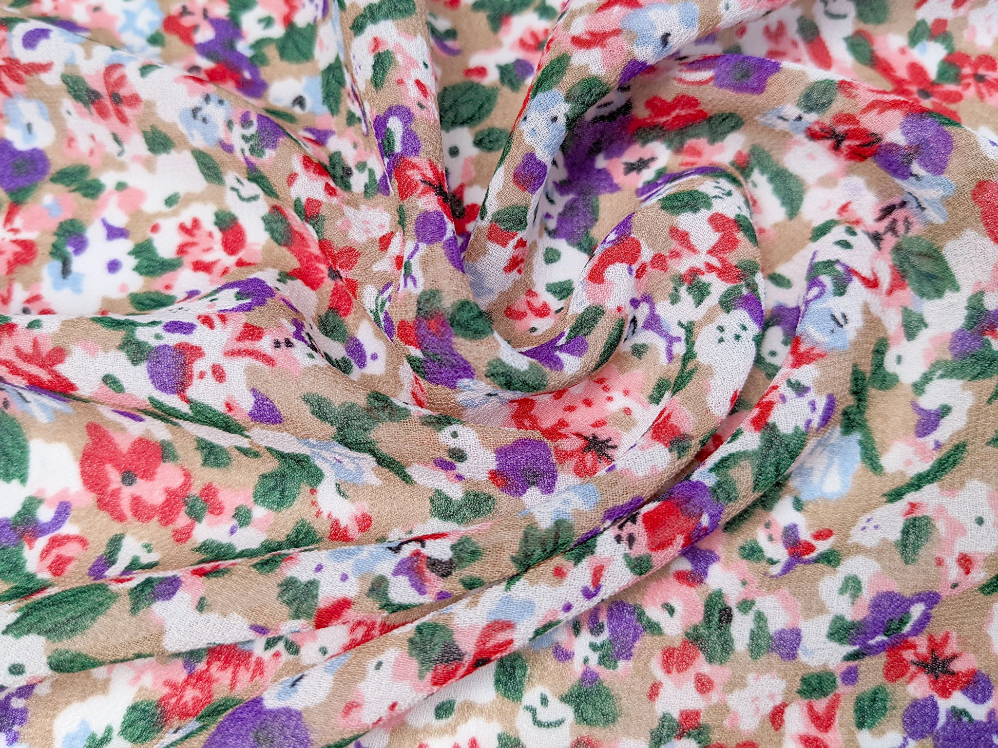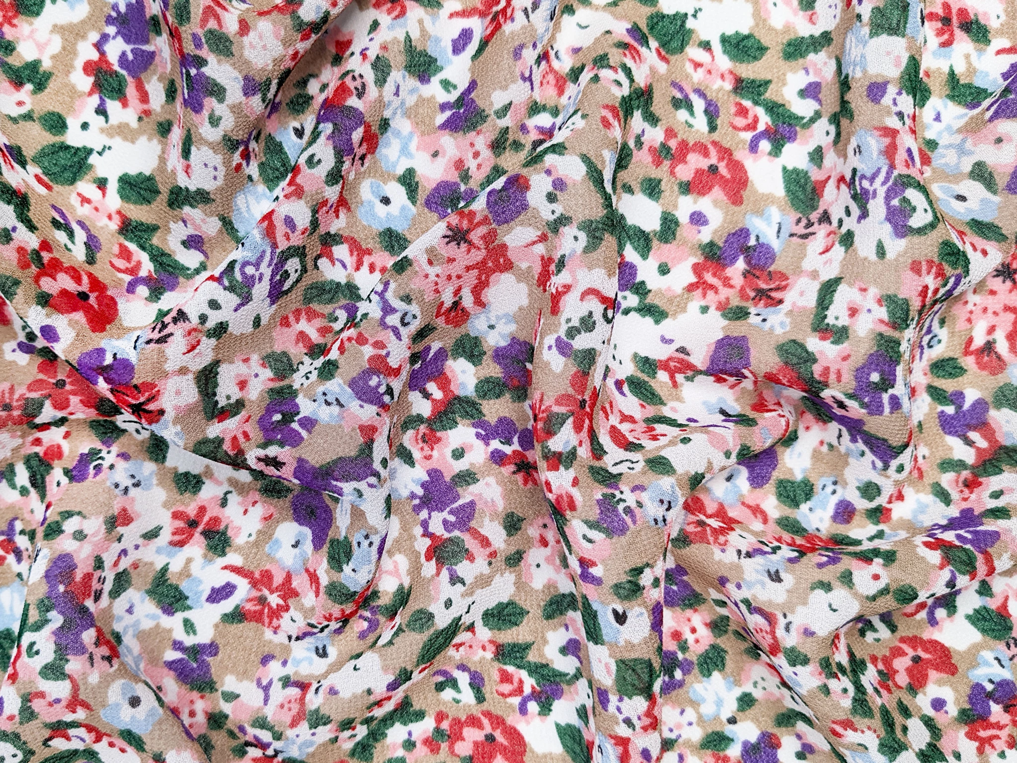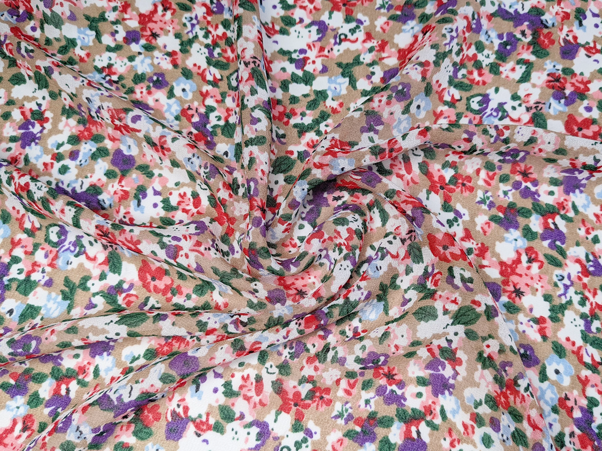 Принтований креп-шифон - це напівпрозора шорстка тканина. Тканина гарно драпірується. Прати й прасувати вироби з крепа- шифону коштує з обережністю, вибираючи делікатні режими. Полотно дуже міцне завдяки туго переплетених ниток. Для пошиття суконь рекомендуємо придбати легку підкладкову тканину.