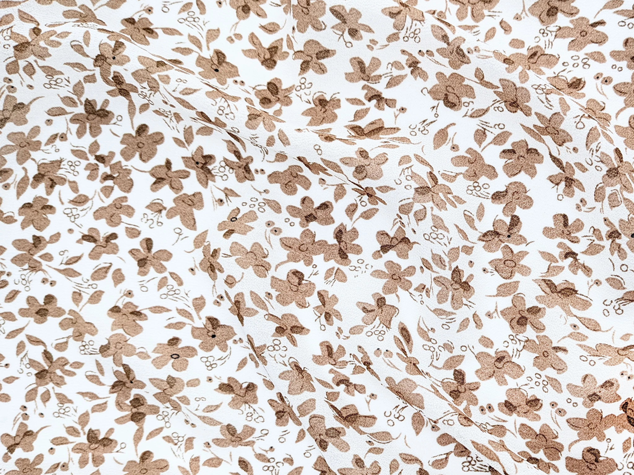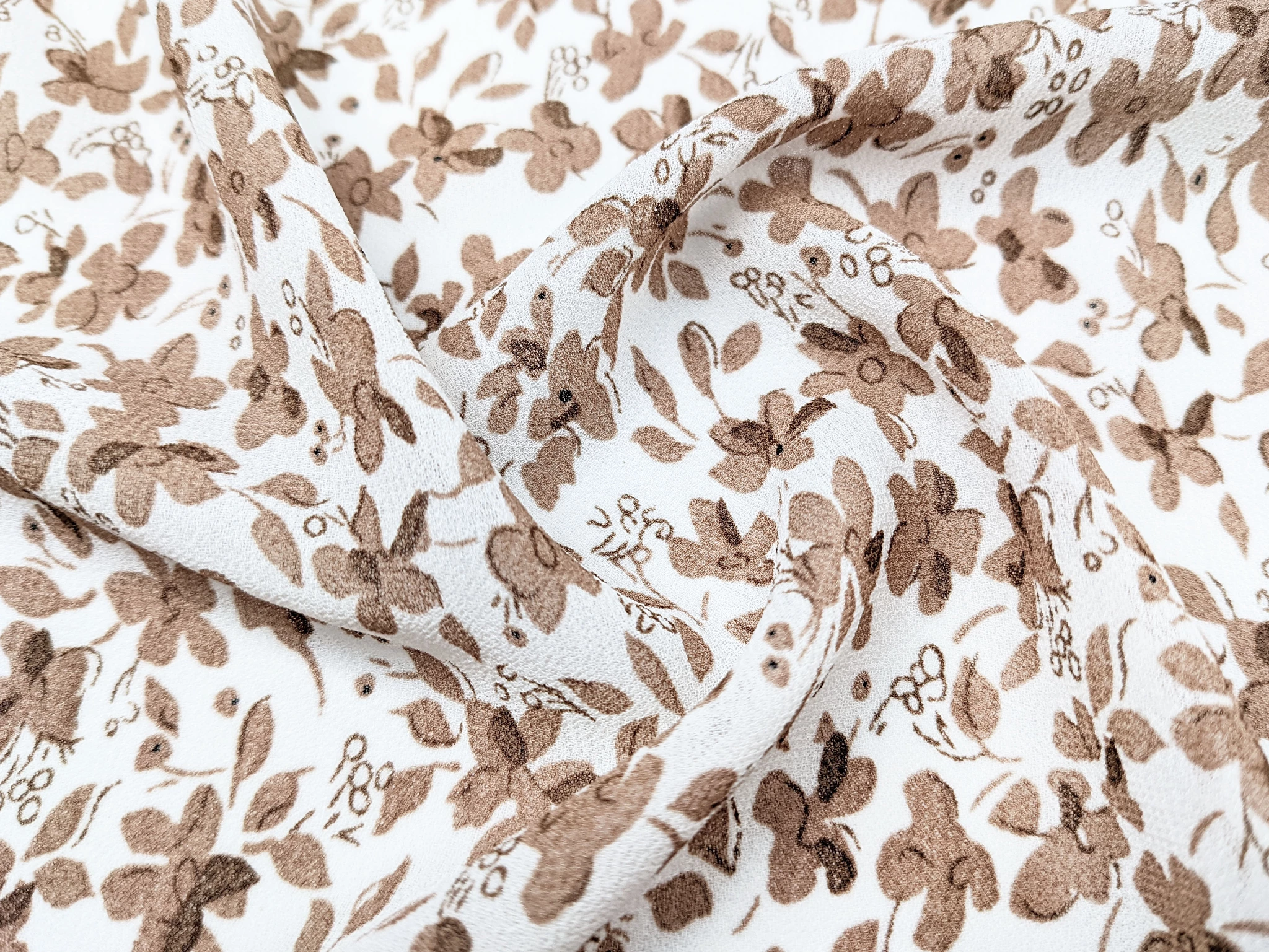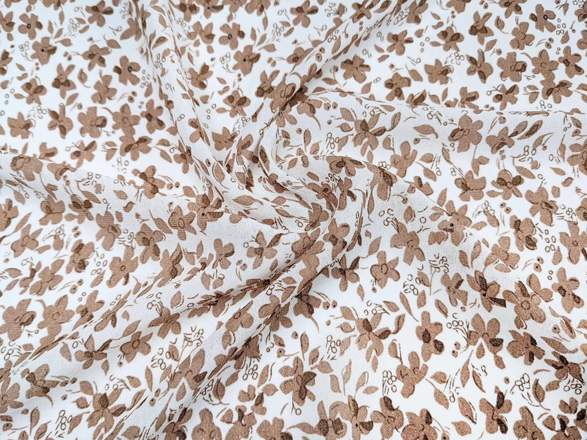 Принтований креп-шифон - це напівпрозора шорстка тканина. Тканина гарно драпірується. Прати й прасувати вироби з крепа- шифону коштує з обережністю, вибираючи делікатні режими. Полотно дуже міцне завдяки туго переплетених ниток. Для пошиття суконь рекомендуємо придбати легку підкладкову тканину.