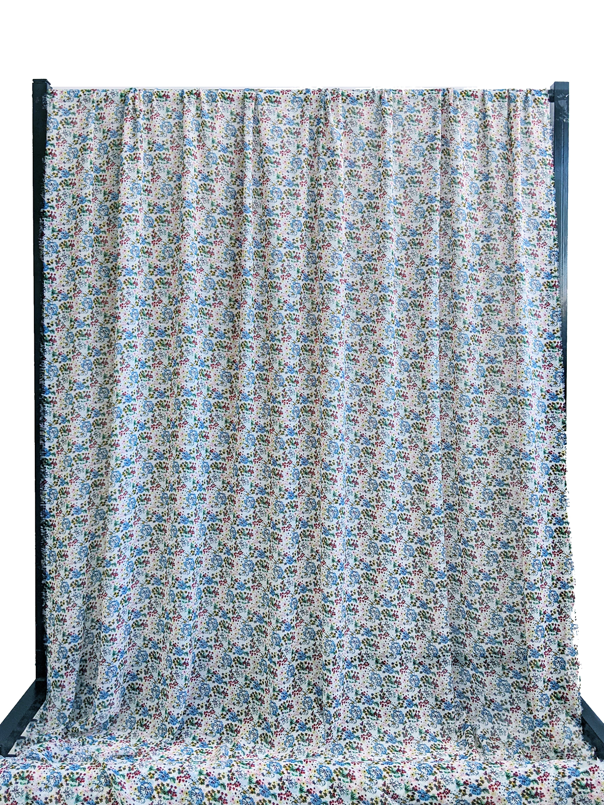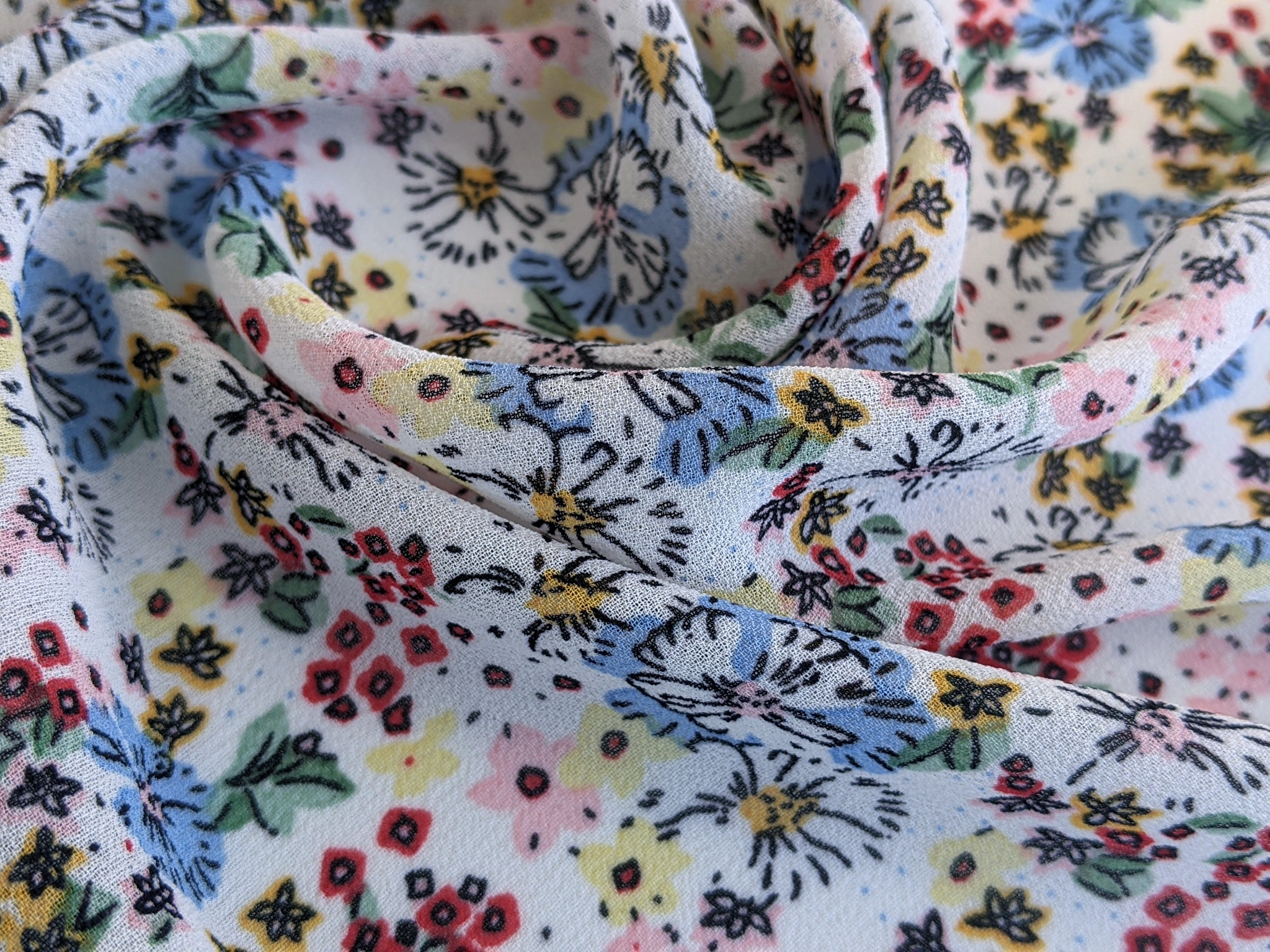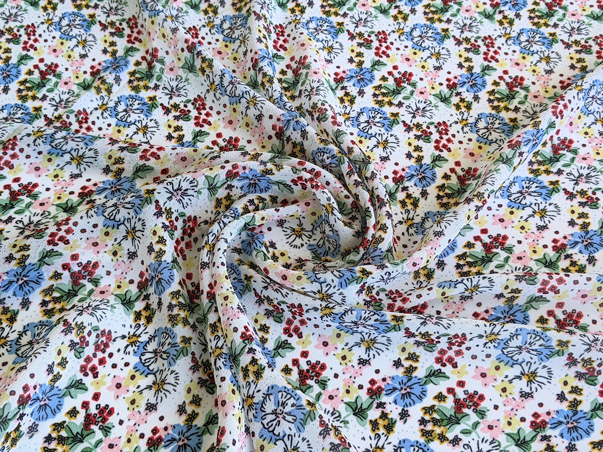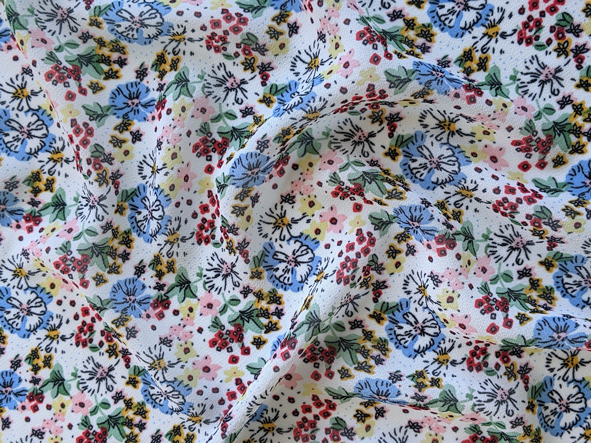 Принтований креп-шифон - це напівпрозора шорстка тканина. Тканина гарно драпірується. Прати й прасувати вироби з крепа- шифону коштує з обережністю, вибираючи делікатні режими. Полотно дуже міцне завдяки туго переплетених ниток. Для пошиття суконь рекомендуємо придбати легку підкладкову тканину.