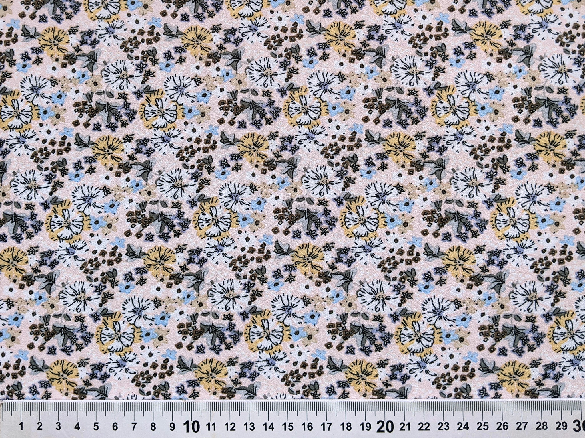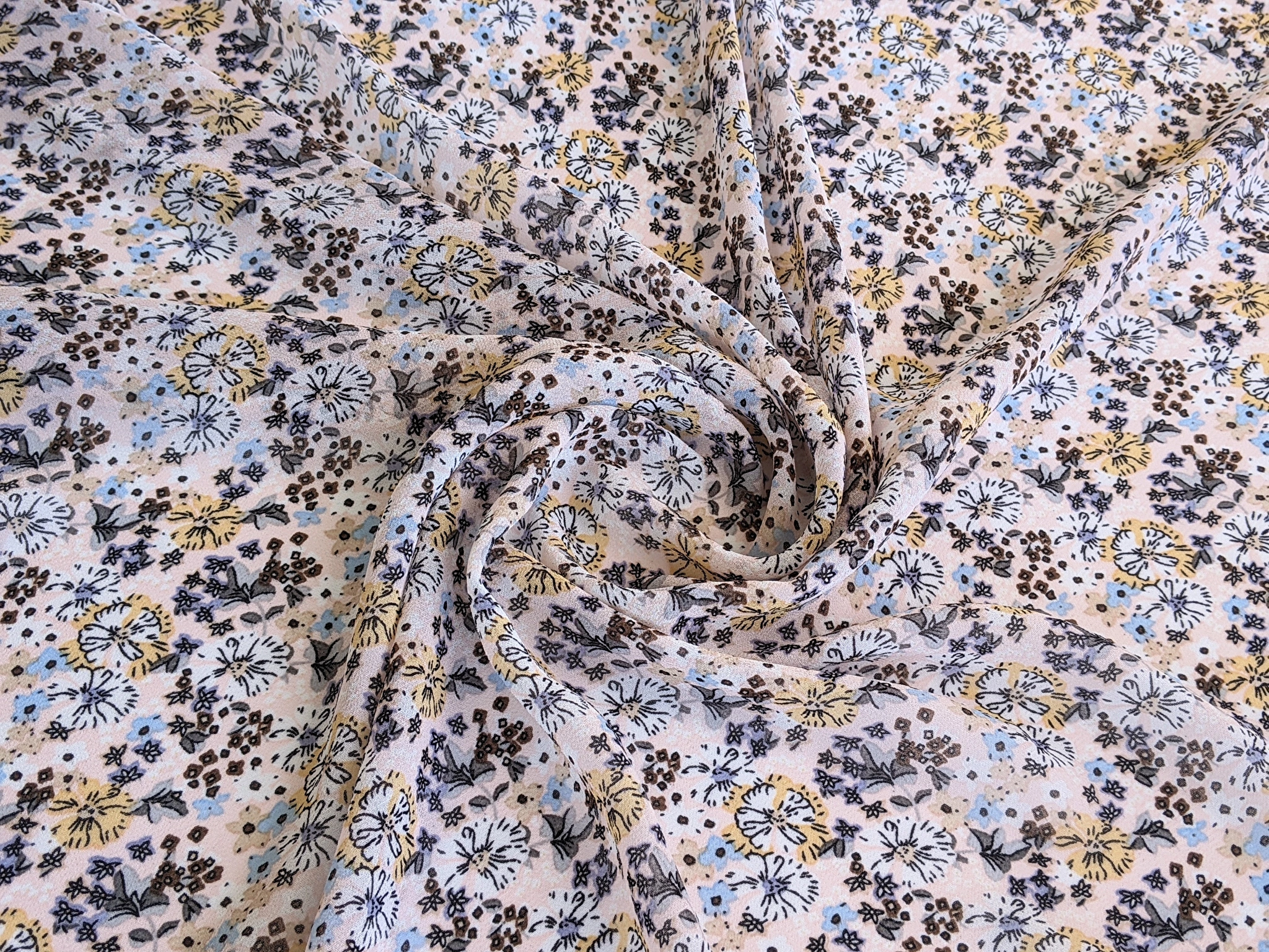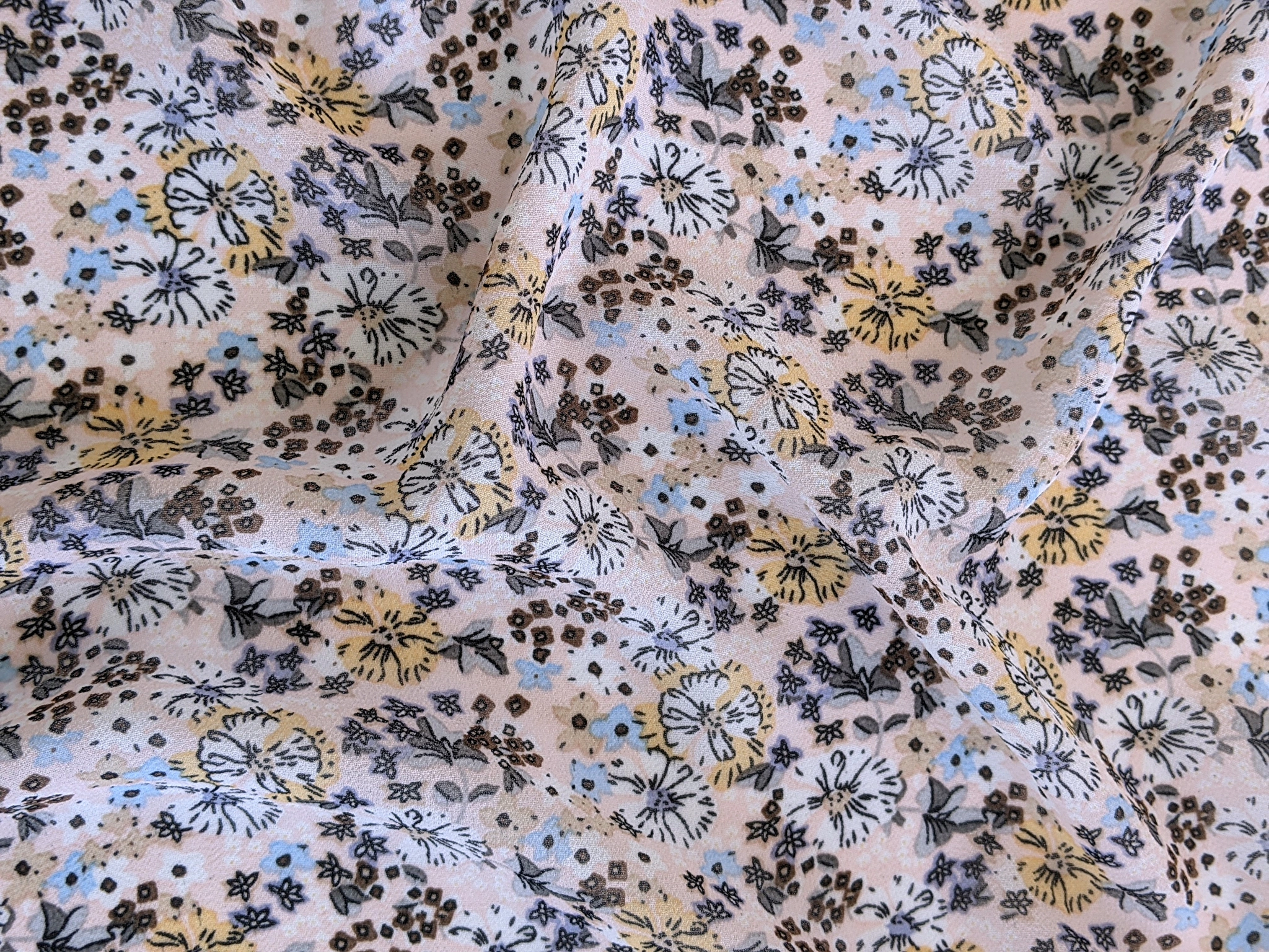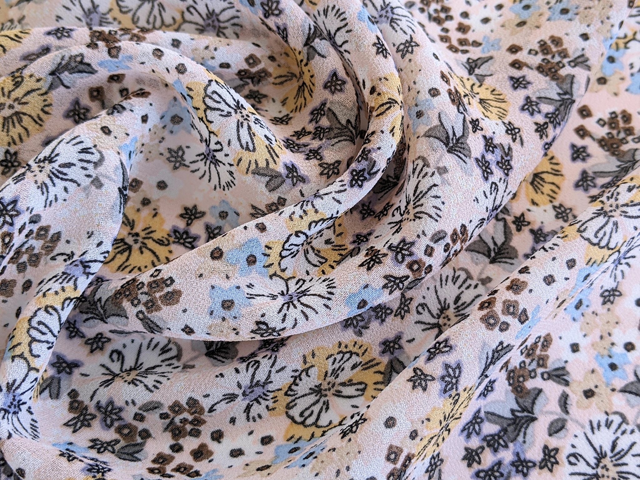 Принтований креп-шифон - це напівпрозора шорстка тканина. Тканина гарно драпірується. Прати й прасувати вироби з крепа- шифону коштує з обережністю, вибираючи делікатні режими. Полотно дуже міцне завдяки туго переплетених ниток. Для пошиття суконь рекомендуємо придбати легку підкладкову тканину.
