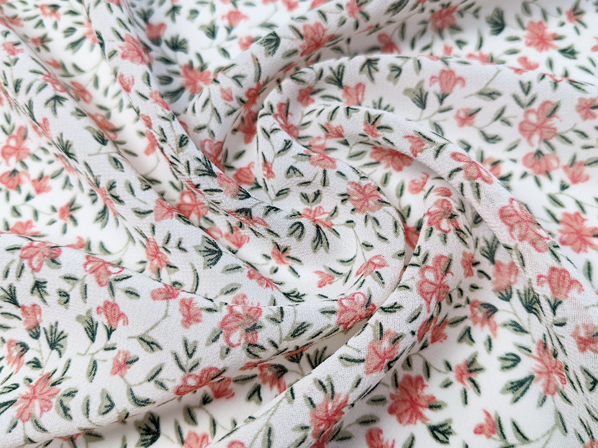 Принтований креп-шифон - це напівпрозора шорстка тканина. Тканина гарно драпірується. Прати й прасувати вироби з крепа- шифону коштує з обережністю, вибираючи делікатні режими. Полотно дуже міцне завдяки туго переплетених ниток. Для пошиття суконь рекомендуємо придбати легку підкладкову тканину.