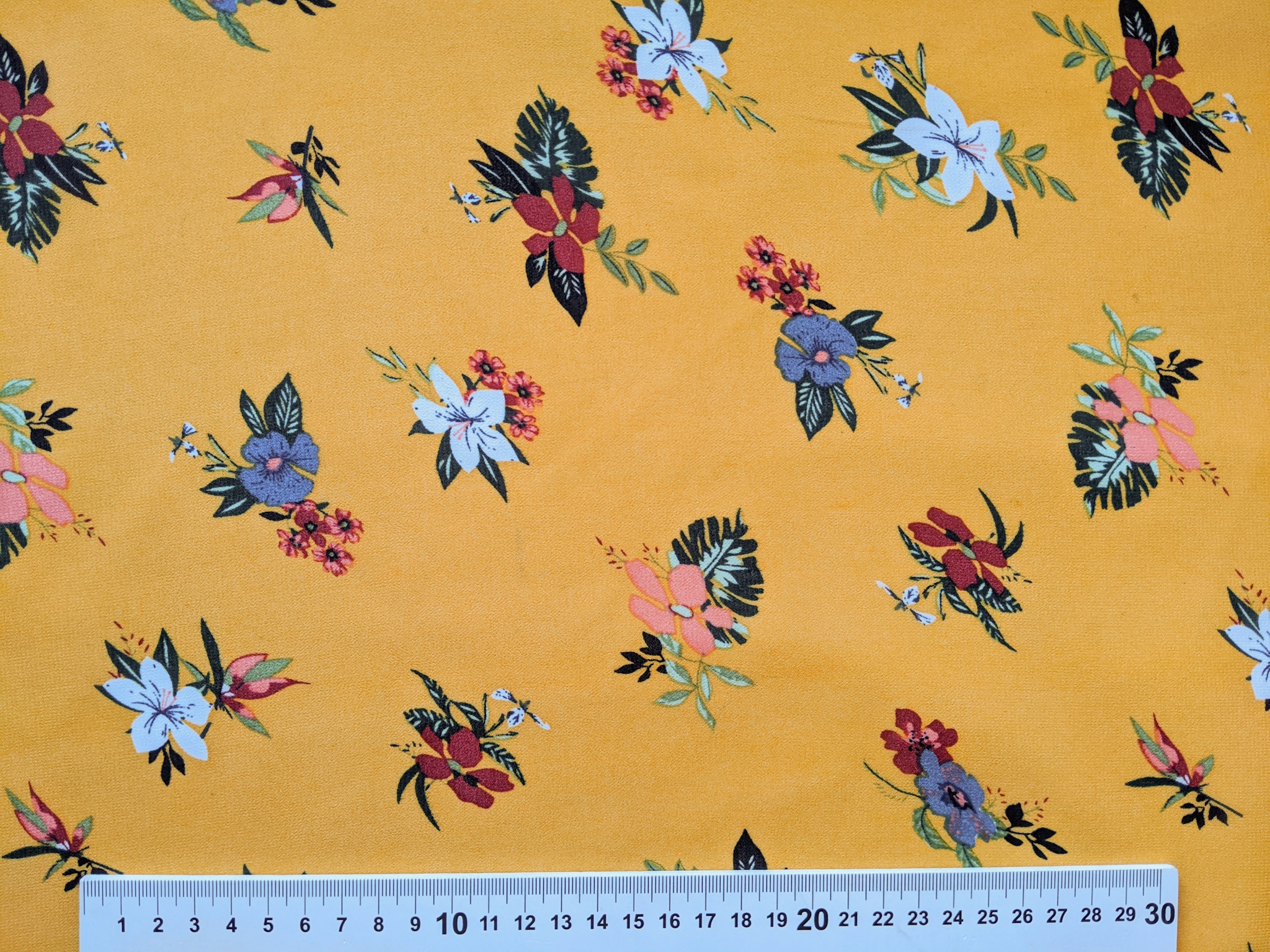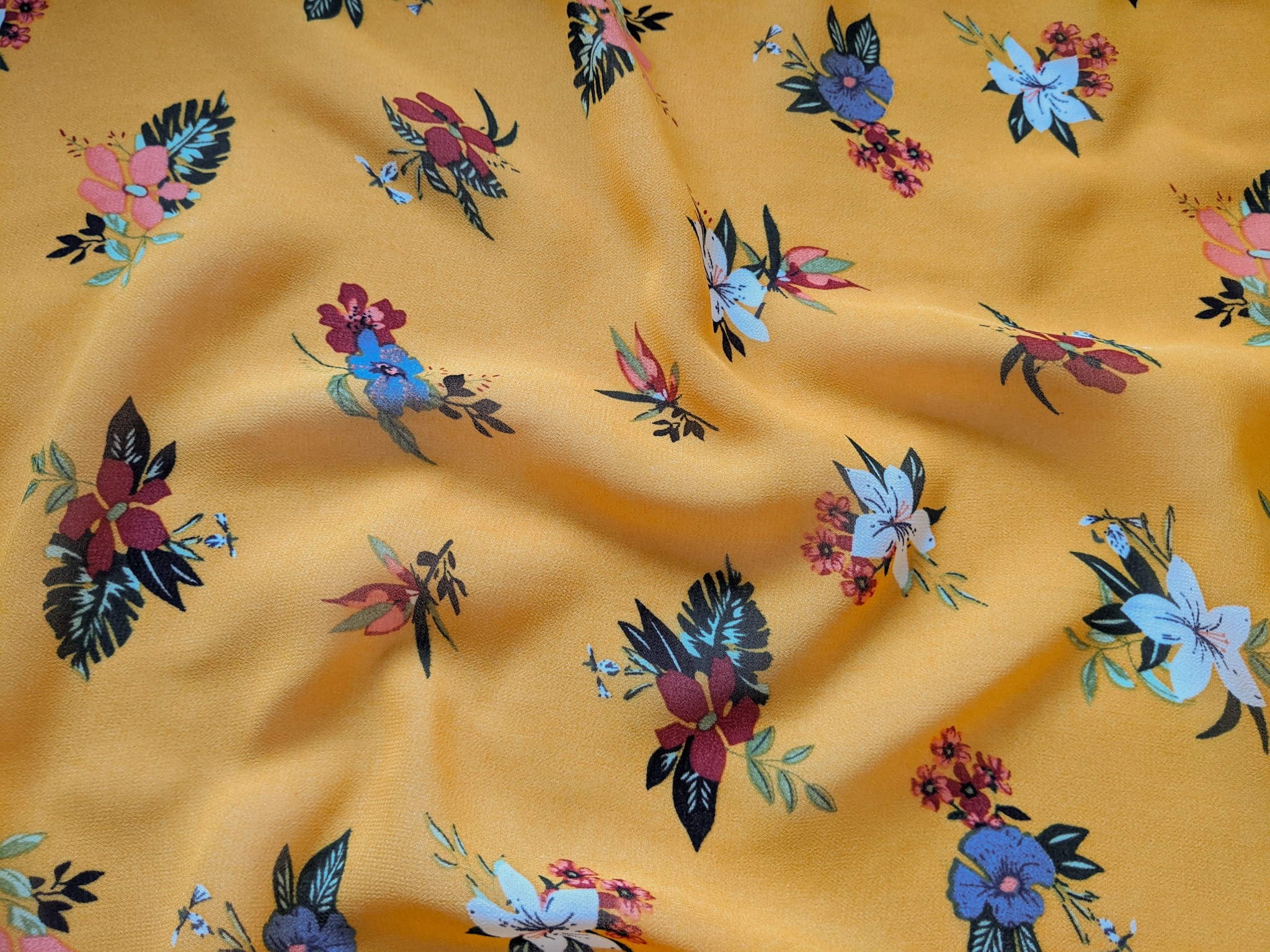 Прінтованний креп-шифон - це напівпрозора шорстка тканина. Тканина красиво драпірується. Прати й прасувати вироби з крепа- шифону необхідно з обережністю, обираючи делікатні режими. Полотно дуже міцне завдяки туго переплетеним ниткам. Для пошиття суконь рекомендуємо придбати легку підкладкову тканину. Креп-шифон використовують для пошиття суконь, сарафанів і блуз.