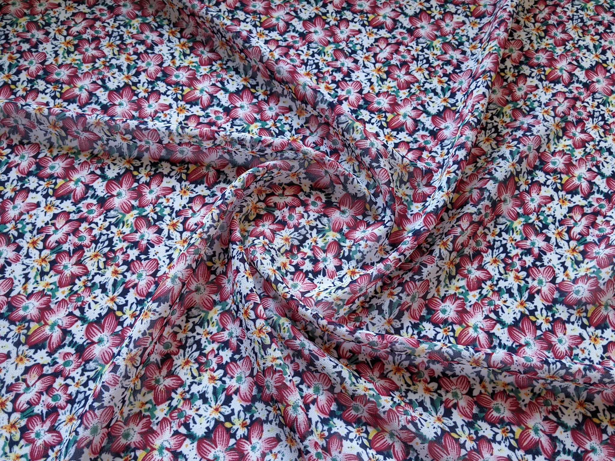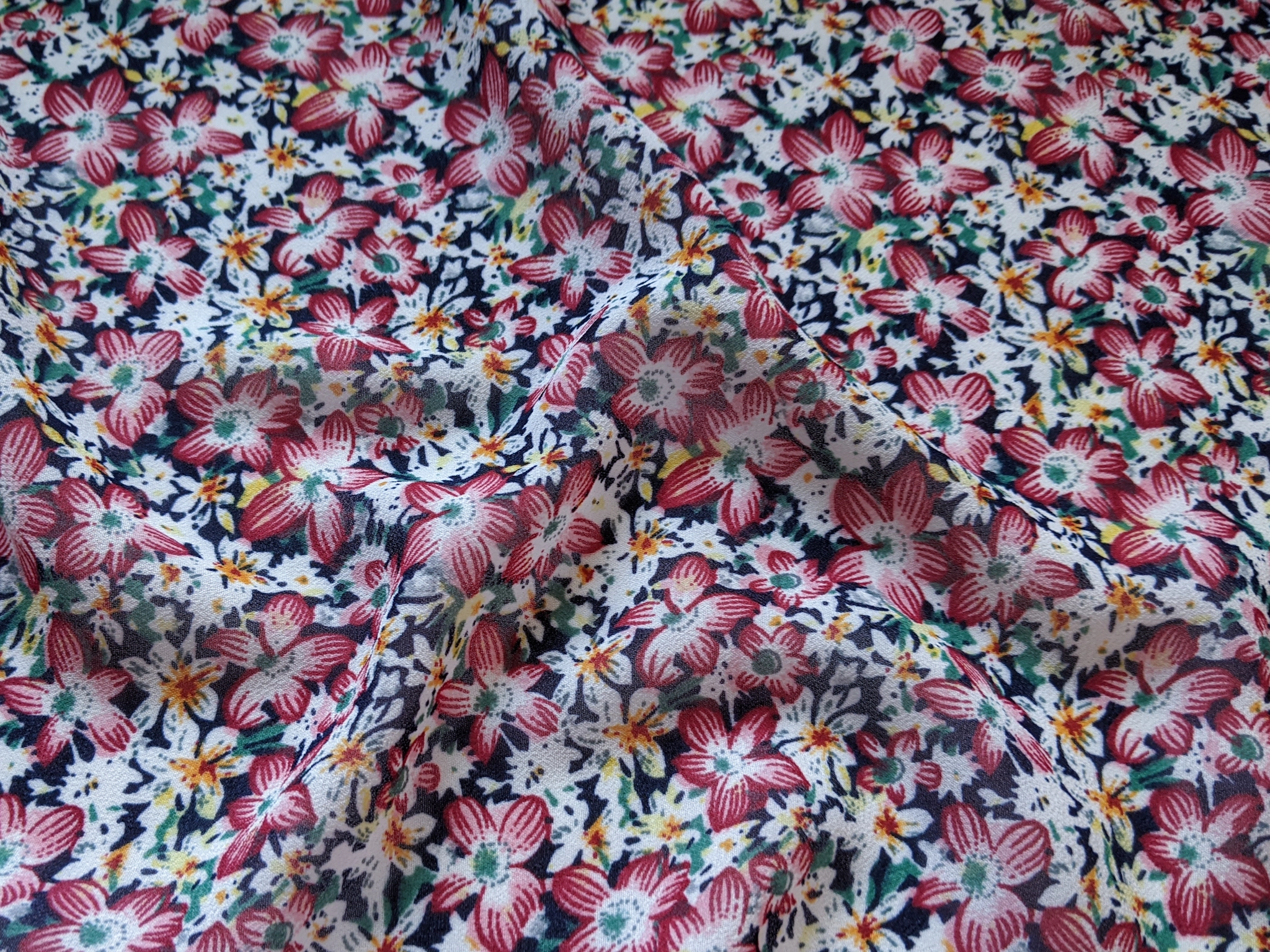 Прінтованний креп-шифон - це напівпрозора шорстка тканина. Тканина красиво драпірується. Прати й прасувати вироби з крепа- шифону необхідно з обережністю, обираючи делікатні режими. Полотно дуже міцне завдяки туго переплетеним ниткам. Для пошиття суконь рекомендуємо придбати легку підкладкову тканину. Креп-шифон використовують для пошиття суконь, сарафанів і блуз.