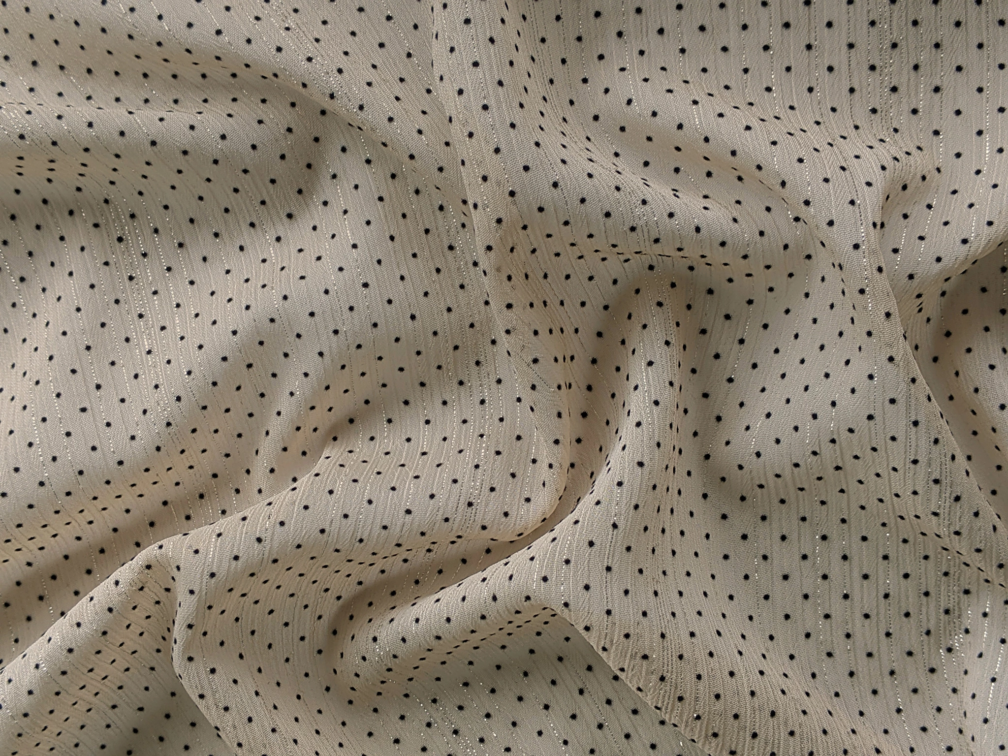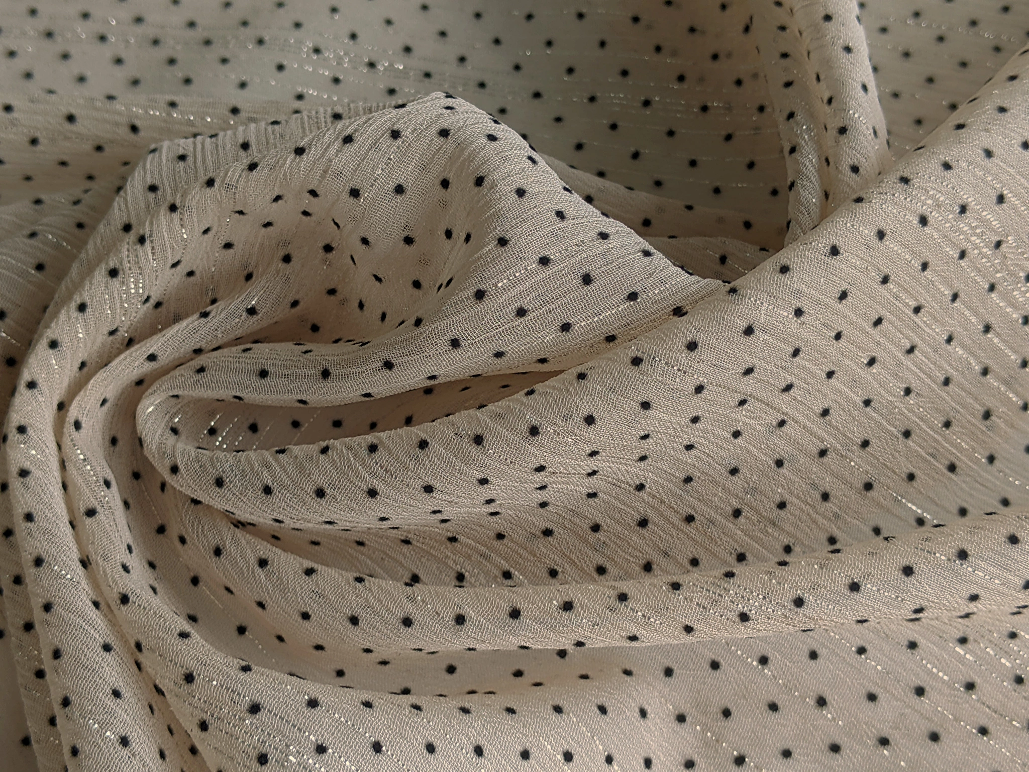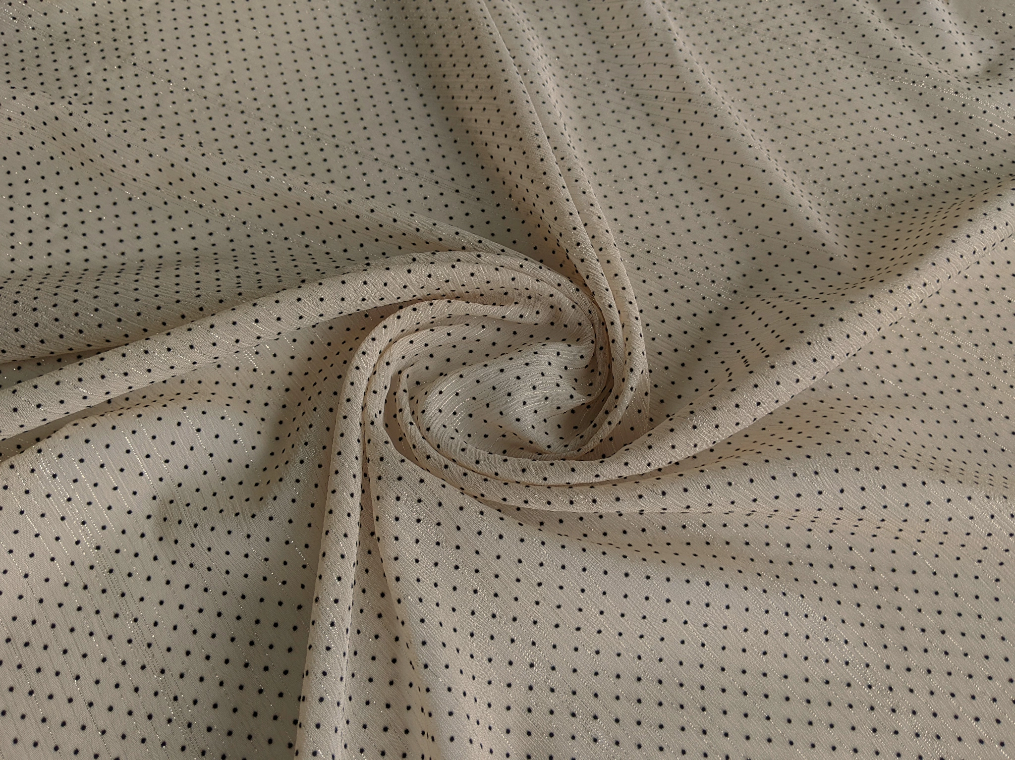 Шифон металік - полотно з люрексовой ниткою і витканими кружечками. Тканина дуже легка, майже не мнеться. Стильний дизайн дозволяє створити жіночні образи для літнього сезону. Люрексова нитка додасть легкого сяйва. Тканина відмінно підходить для пошиття накидок, блуз, суконь і спідниць. Для пошиття сукні або спідниці необхідно обрати підкладку. Тканину на підкладку ви можете придбати на нашому сайті в комплекті з шифоном.