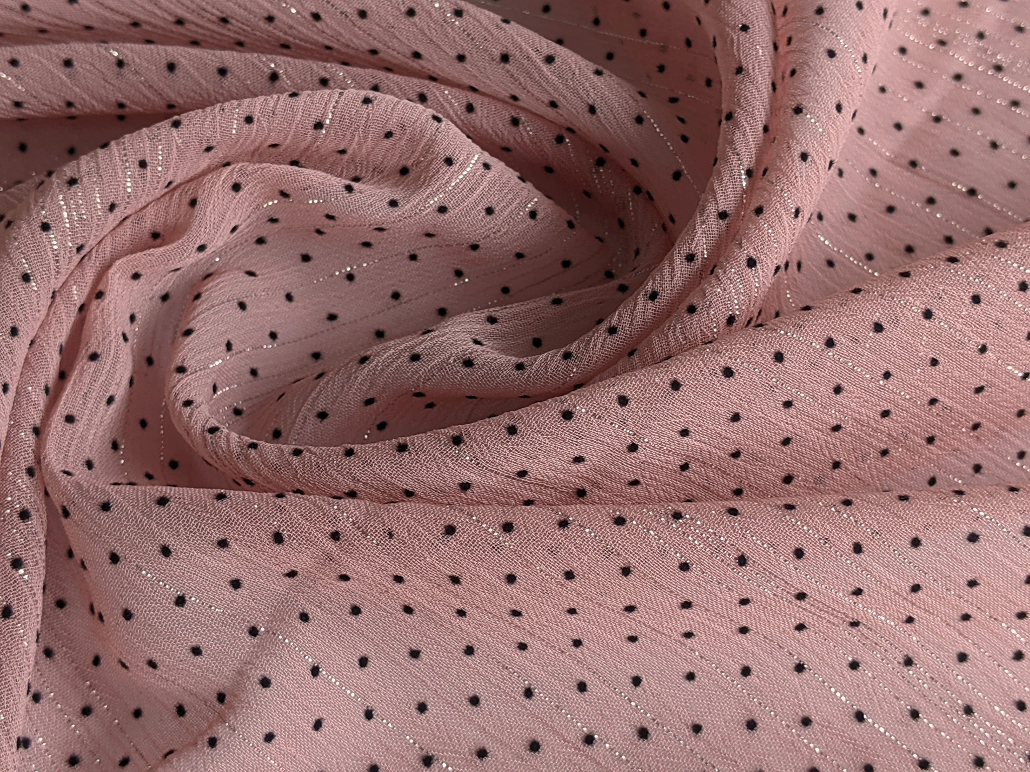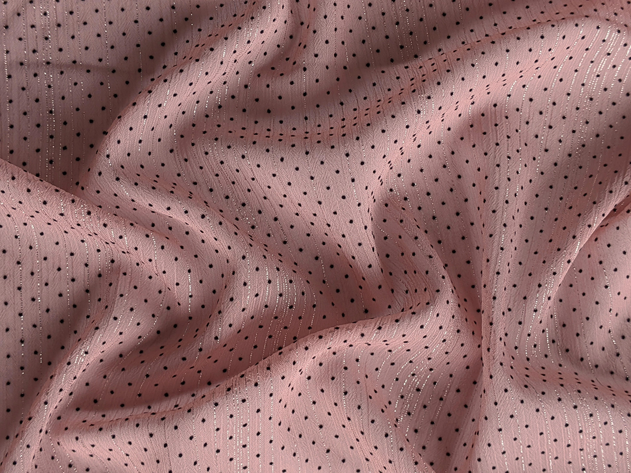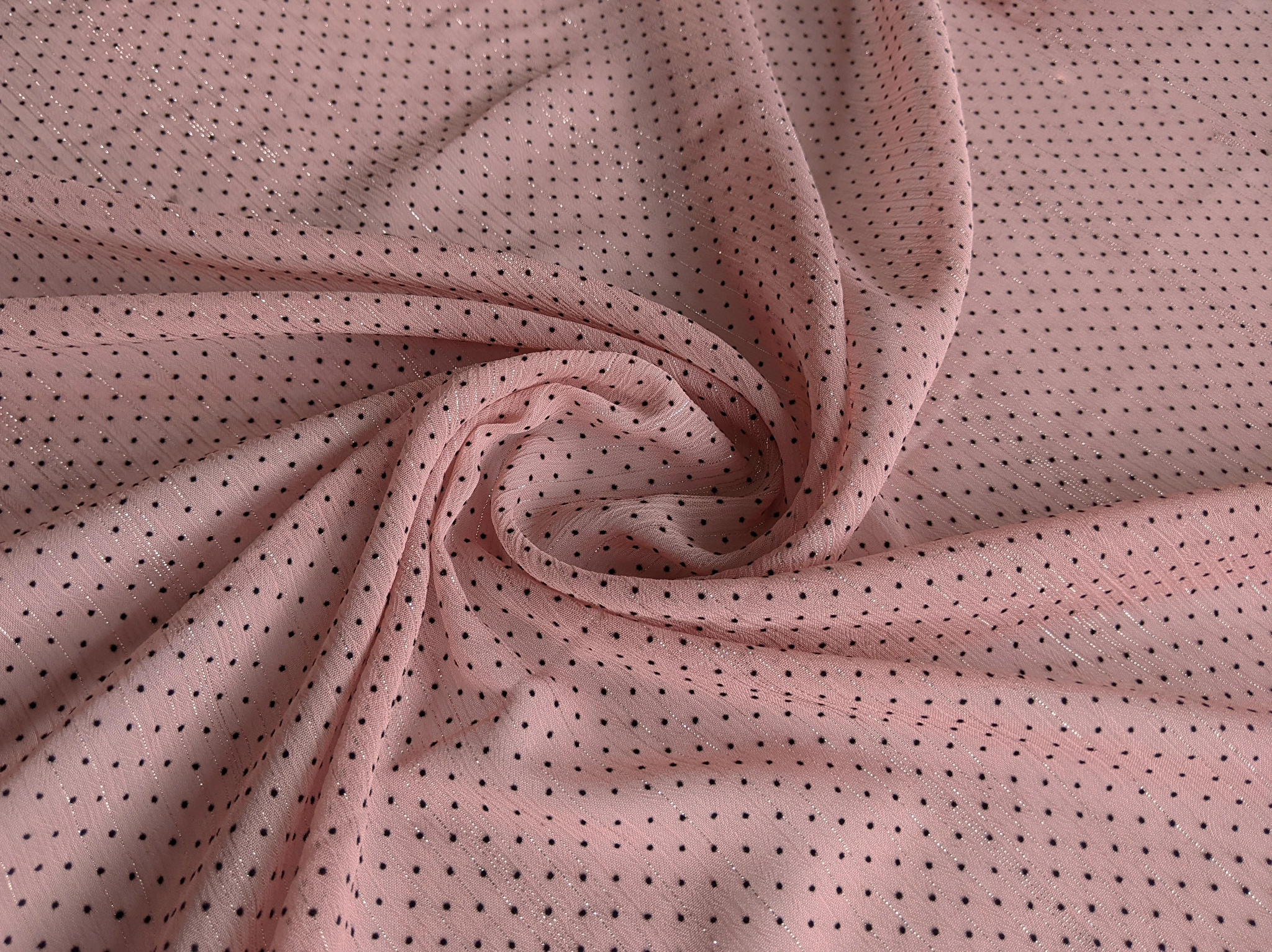 Шифон металік - полотно з люрексовой ниткою і витканими кружечками. Тканина дуже легка, майже не мнеться. Стильний дизайн дозволяє створити жіночні образи для літнього сезону. Люрексова нитка додасть легкого сяйва. Тканина відмінно підходить для пошиття накидок, блуз, суконь і спідниць. Для пошиття сукні або спідниці необхідно обрати підкладку. Тканину на підкладку ви можете придбати на нашому сайті в комплекті з шифоном.