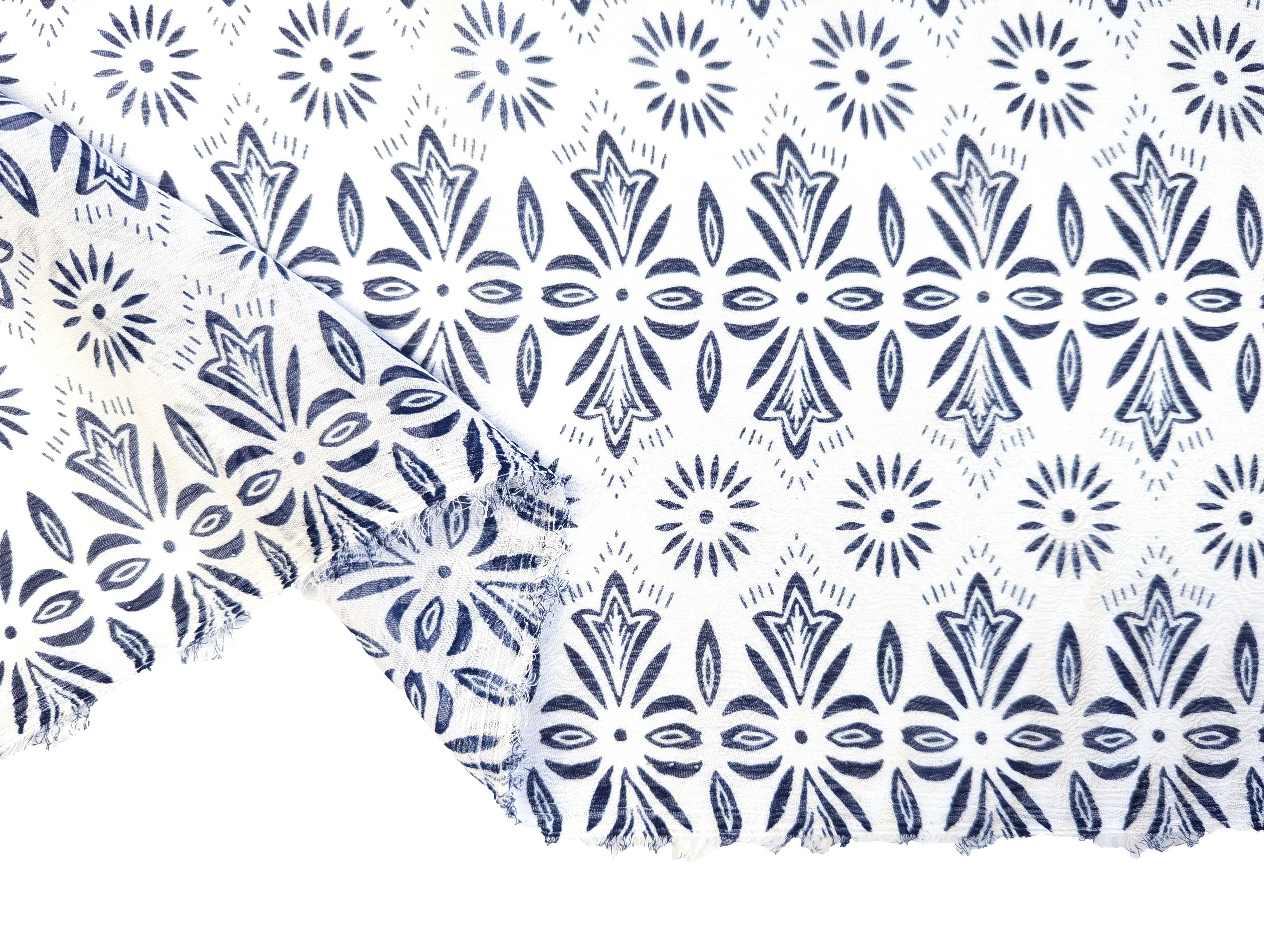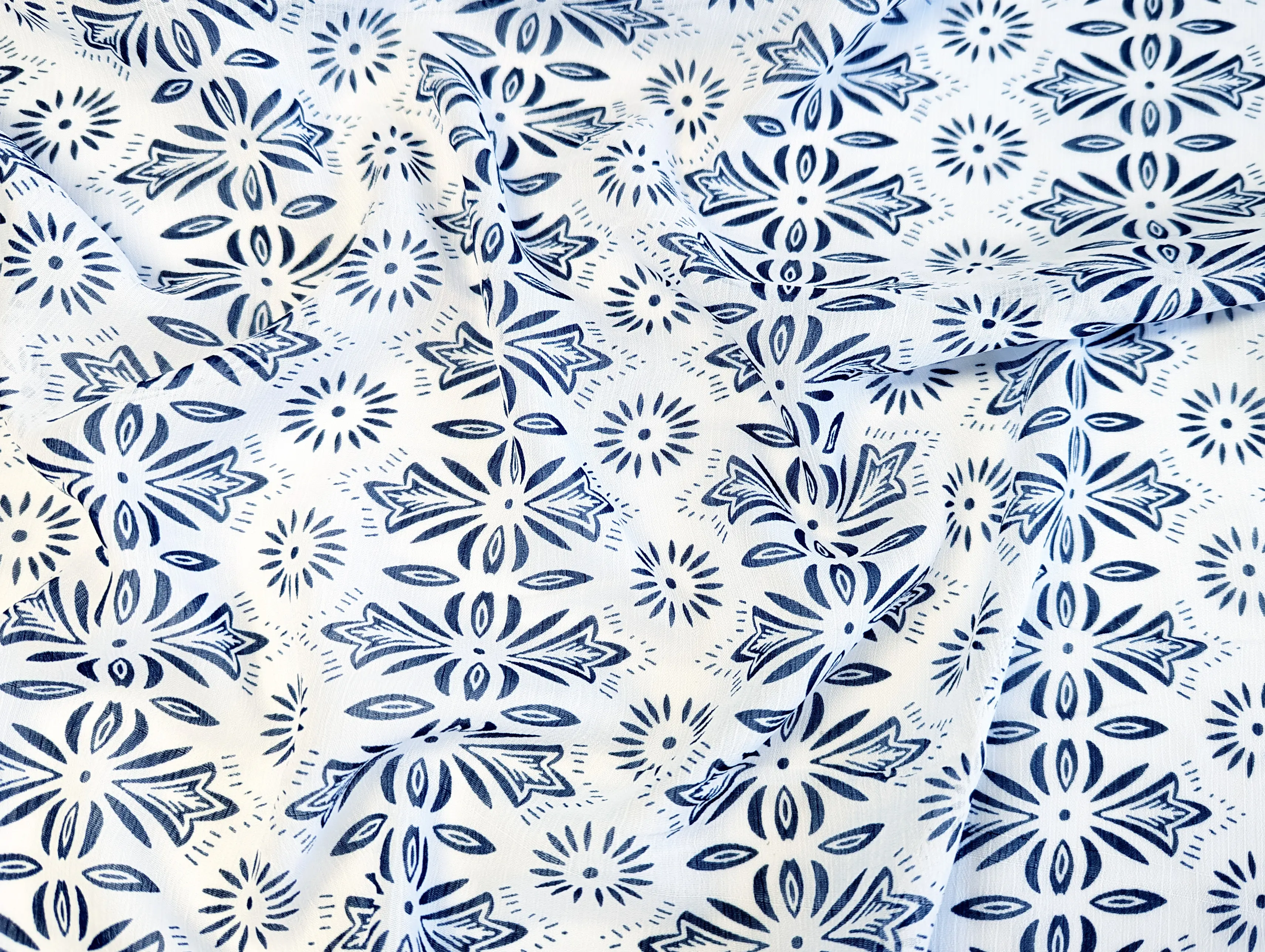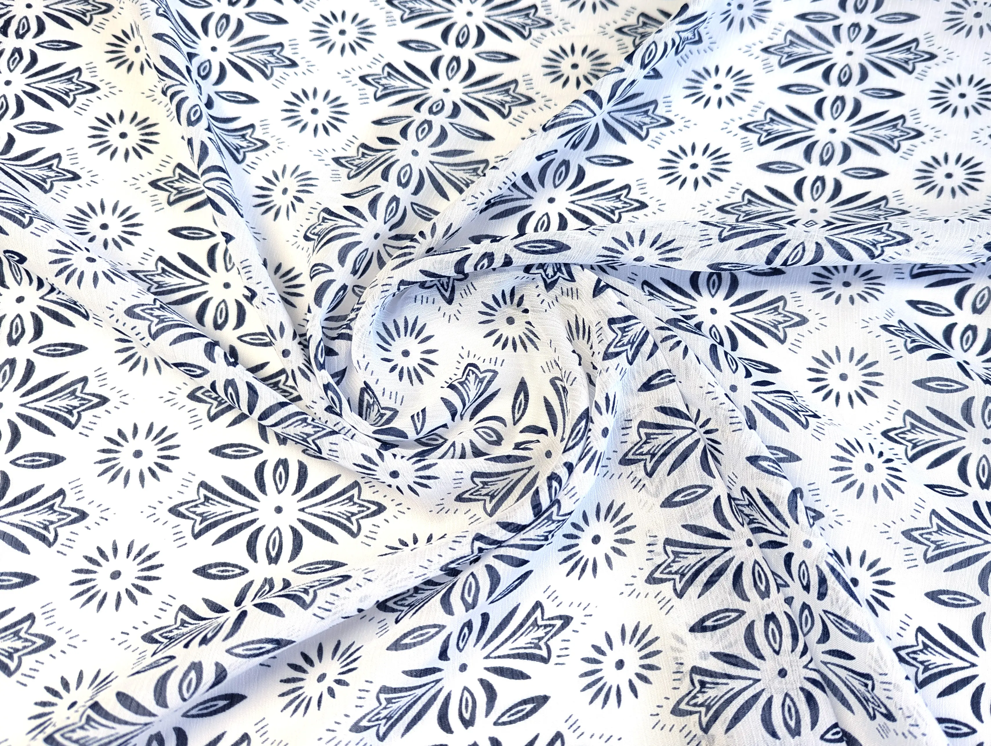 Шифон - це легка, тонка і прозора тканина. Тканина має піщану структуру і шорстку поверхню. Шифон асоціюється з жіночністю та ніжністю. Полотно не мнеться і красиво драпірується, тому використовується для пошиття блуз, суконь, спідниць та сарафанів. Шифон можна комбінувати з трикотажем в якості підкладки. Прати тканину краще в спеціальному мішечку в режимі ручного прання і прасувати через марлю.