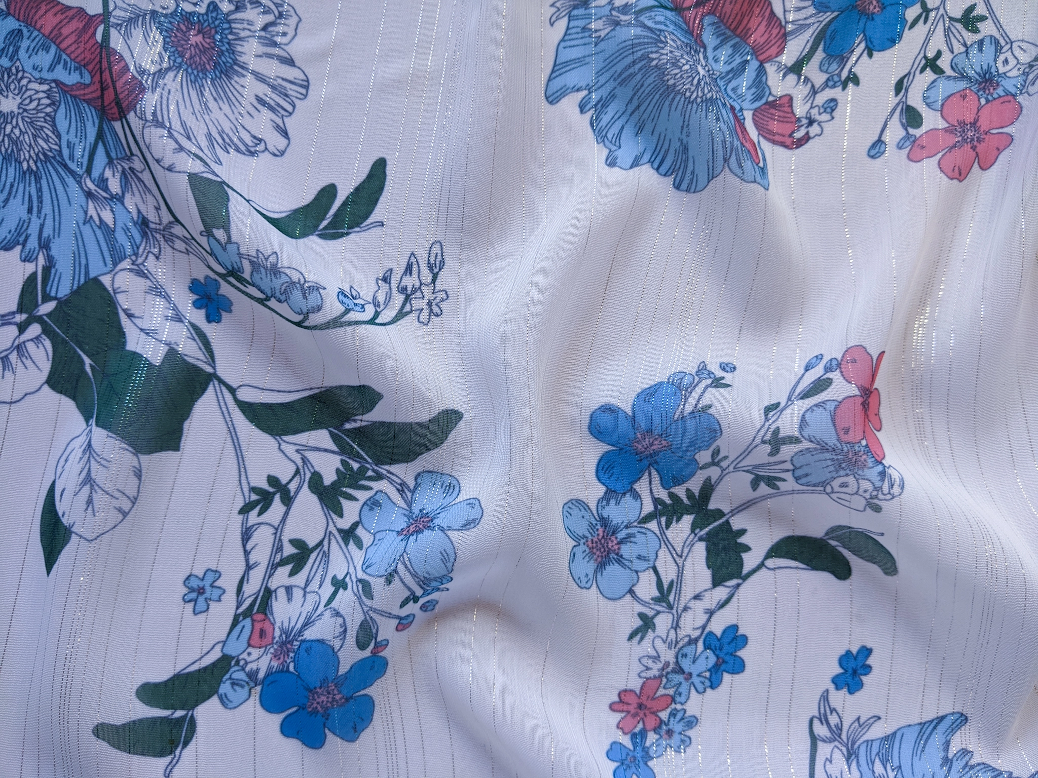 Шифон асоціюється з легкістю, ніжністю та теплою порою року. З шифону шиють блузи, сукні, сарафани, спідниці та накидки. На шифоні присутній ніжний квітковий принт і люрексовой смужка, яка додає легке сяйво. Тканина практично не мнеться, напівпрозора і дуже легка. Для багатьох виробів з шифону вам знадобиться підкладка, яку ви можете придбати в комплекті з шифоном на нашому сайті.