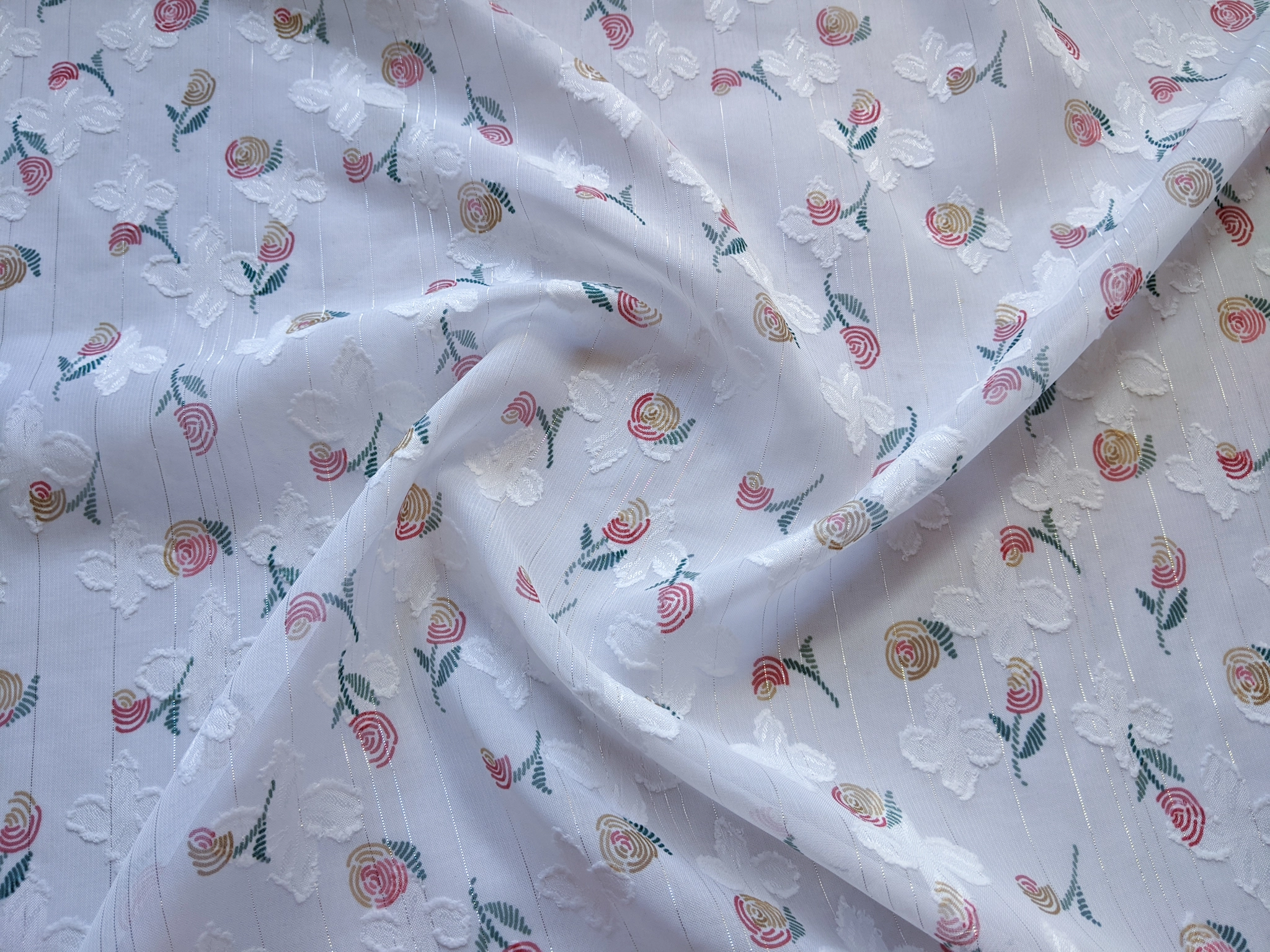 Шифон асоціюється з легкістю, ніжністю та теплою порою року. З шифону шиють блузи, сукні, сарафани, спідниці та накидки. На жакардовому шифоні присутній ніжний квітковий принт і люрексовой смужка, яка додає легке сяйво. По всьому полю витканий додатковий квітковий візерунок в колір полотна, який ущільнює структуру тканини роблячи її більш формостійкою. Тканина майже не мнеться, напівпрозора і дуже легка. Для багатьох виробів з шифону вам знадобиться підкладка, яку ви можете придбати в комплекті з шифоном на нашому сайті.