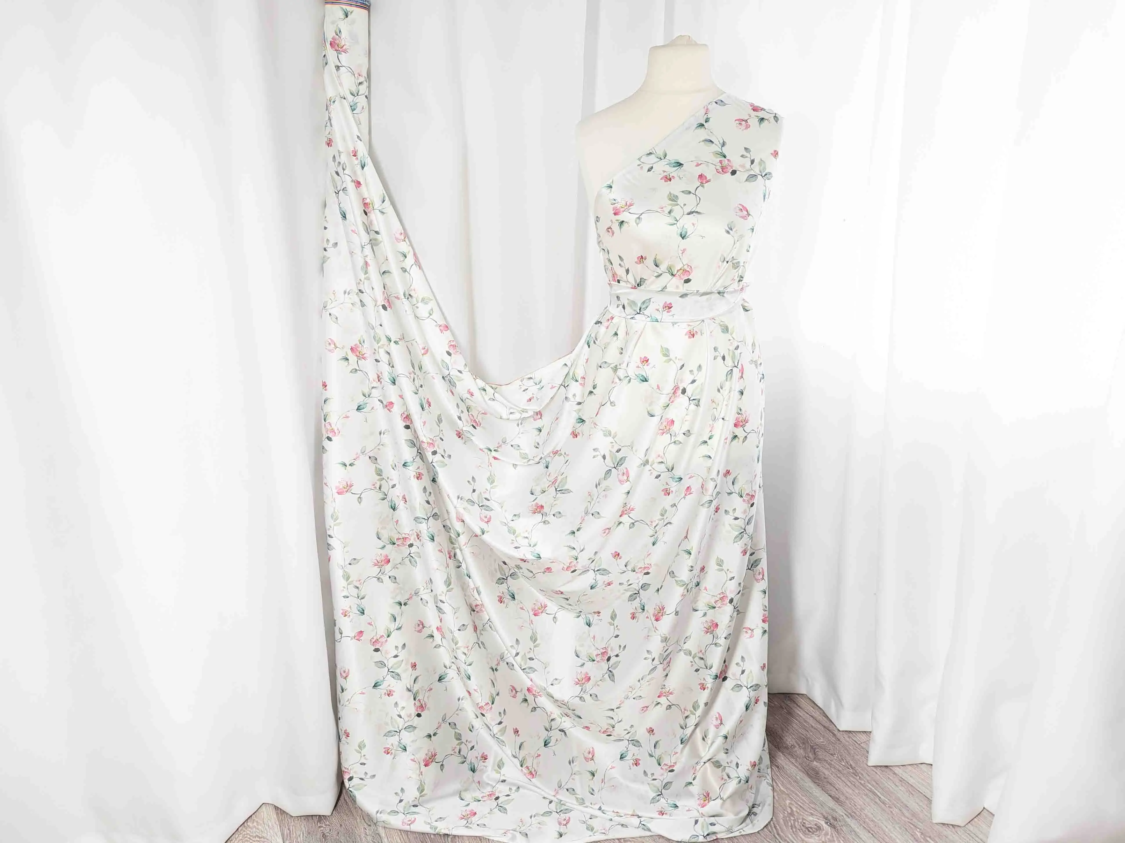 Шовк сати - це легке полотно, гладке як атлас, але значно тонше й приємніше на дотик. Друга назва тканини - шовк Армані. Полотно красиво струмує, легке та летюче, не мнеться. Вимагає делікатного догляду. Застосовується для пошиття блуз, суконь, костюмів та накидок. У виробі тканина виглядає дорого, ошатно і вишукано.