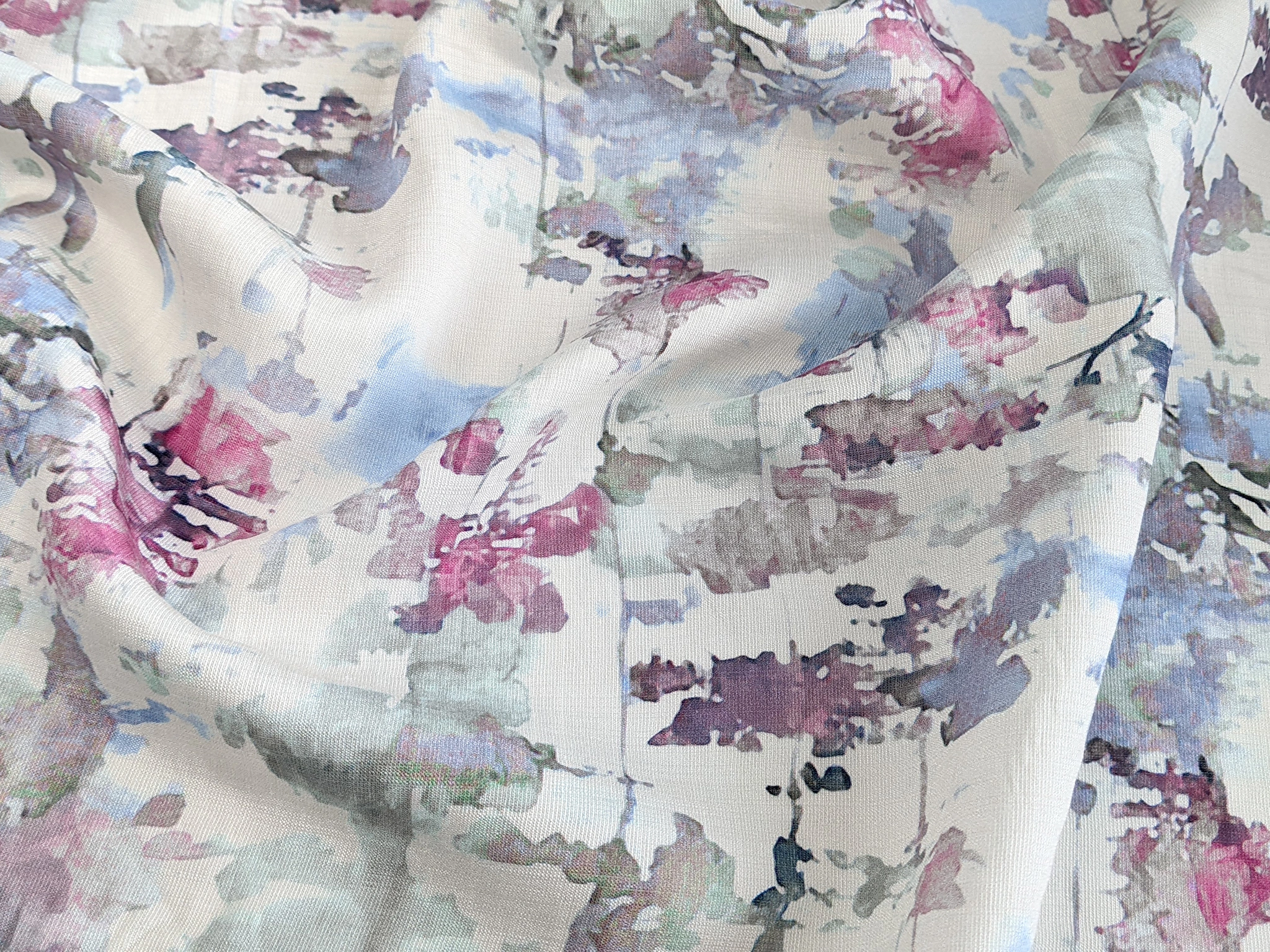 Шовк віскоза - тонкий, легкий матеріал з природним матовим блиском і полотняним плетінням волокон. Тканина повітряна, поєднує в собі ніжність шовковистої структури і вишуканість штапеля. Тактильно поверхня має ледь відчутну шорсткість. Нейлонова нитка в складі відповідає за міцність і зносостійкість тканини. Присутнє легке зминання, має прозорість на просвіт. Тканина без еластану, добре драпірується, пропускає повітря, не парить, дає відчуття прохолоди в спекотну погоду.