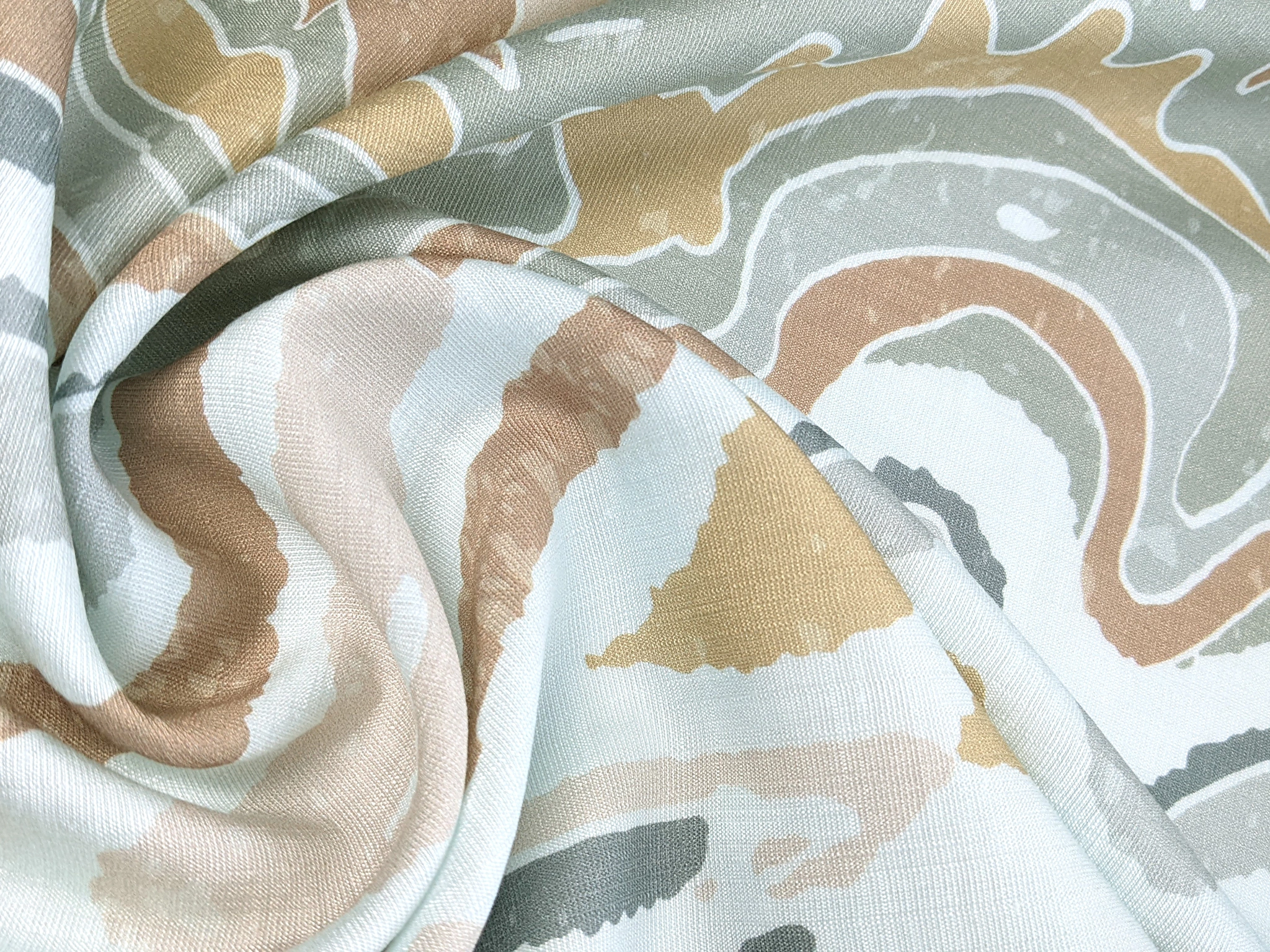 Шовк віскоза - тонкий, легкий матеріал з природним матовим блиском і полотняним плетінням волокон. Тканина повітряна, поєднує в собі ніжність шовковистої структури і вишуканість штапеля. Тактильно поверхня має ледь відчутну шорсткість. Нейлонова нитка в складі відповідає за міцність і зносостійкість тканини. Присутнє легке зминання, має прозорість на просвіт. Тканина без еластану, добре драпірується, пропускає повітря, не парить, дає відчуття прохолоди в спекотну погоду.