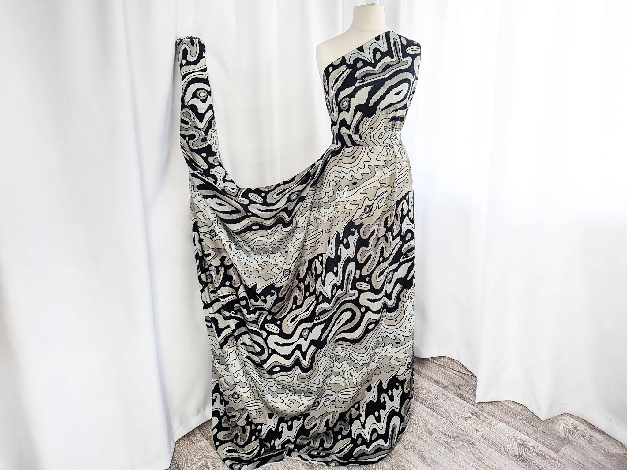 Шовк віскоза - тонкий, легкий матеріал з природним матовим блиском і полотняним плетінням волокон. Тканина повітряна, поєднує в собі ніжність шовковистої структури і вишуканість штапеля. Тактильно поверхня має ледь відчутну шорсткість. Нейлонова нитка в складі відповідає за міцність і зносостійкість тканини. Присутнє легке зминання, має прозорість на просвіт. Тканина без еластану, добре драпірується, пропускає повітря, не парить, дає відчуття прохолоди в спекотну погоду.