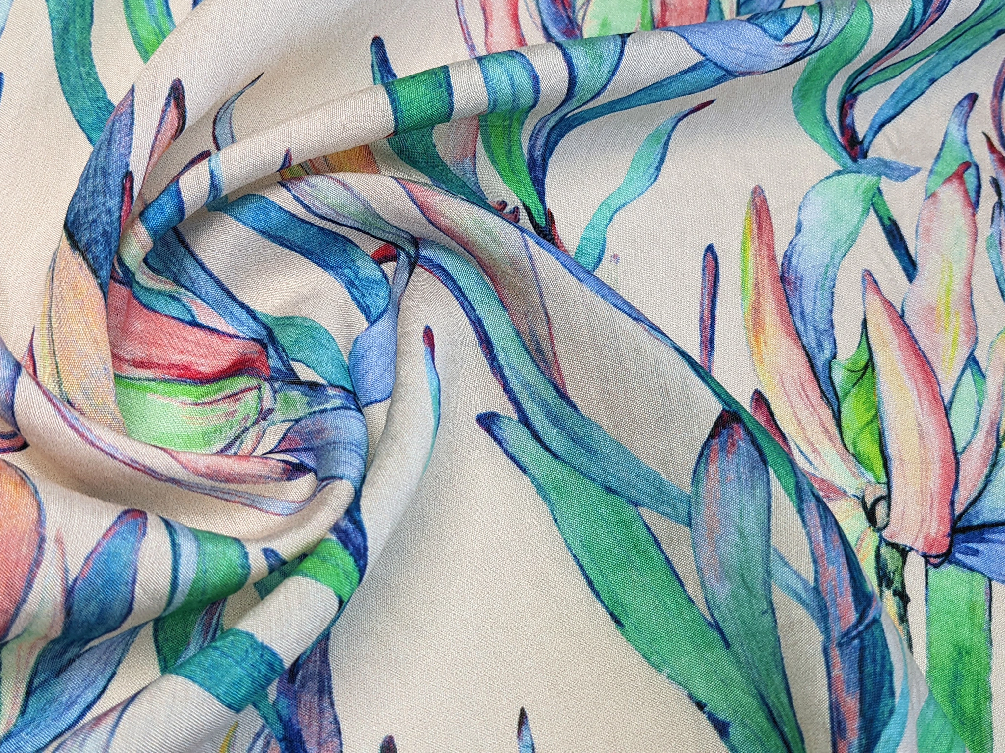 Шовк віскоза - тонкий, невагомий матеріал, що відрізняється легкістю та повітрянністю. Тканина поєднує в собі ніжність шовковистої структури та вишуканість штапелю. Тактильно поверхня має відчутну шорсткість, природний, легкий матовий блиск. За рахунок натурального складу, присутнє зминання, має прозорість на просвіт. Тканина без еластану, добре драпірується, повітропроникна, забезпечує відчуття прохолоди у спеку.