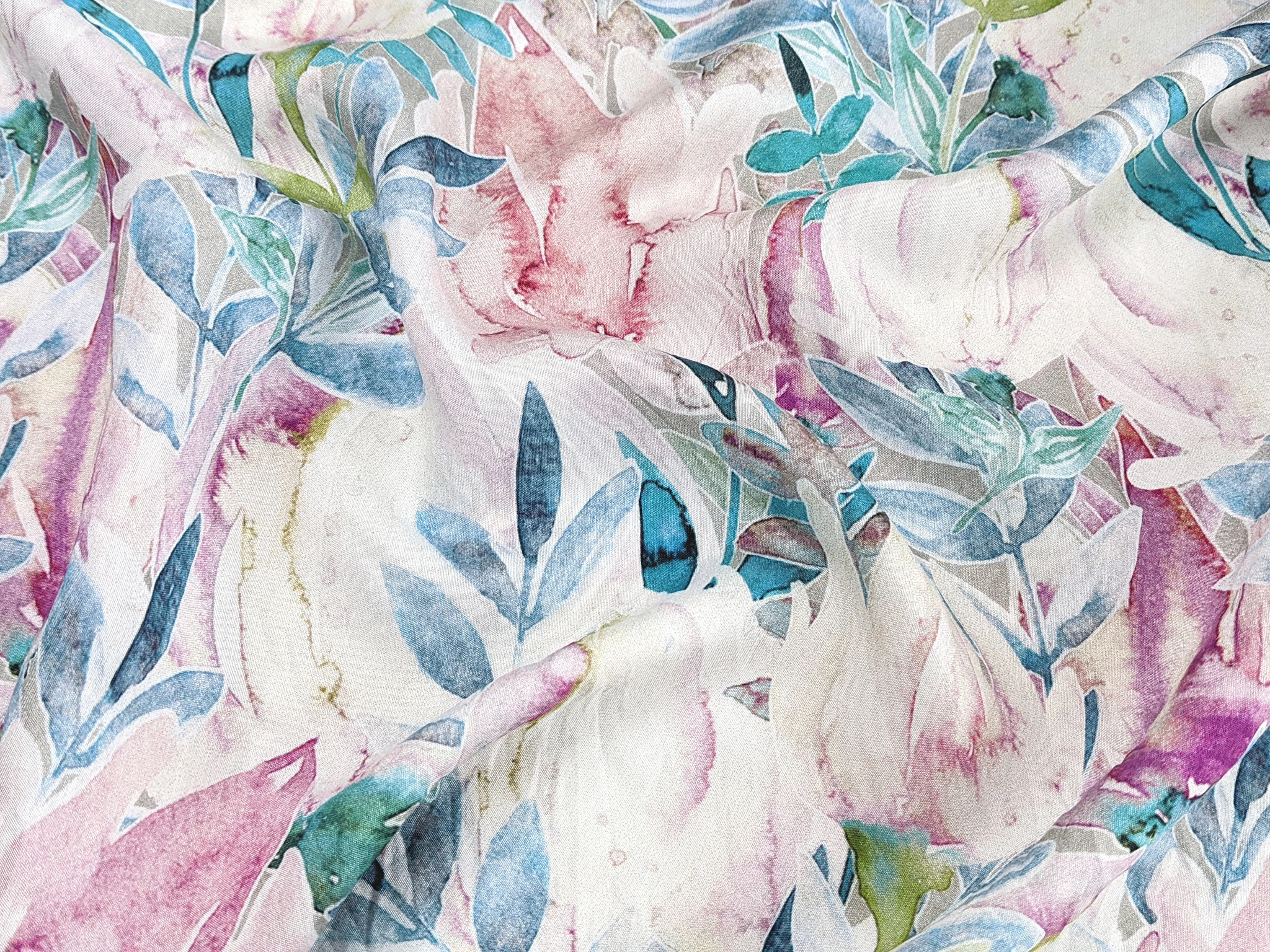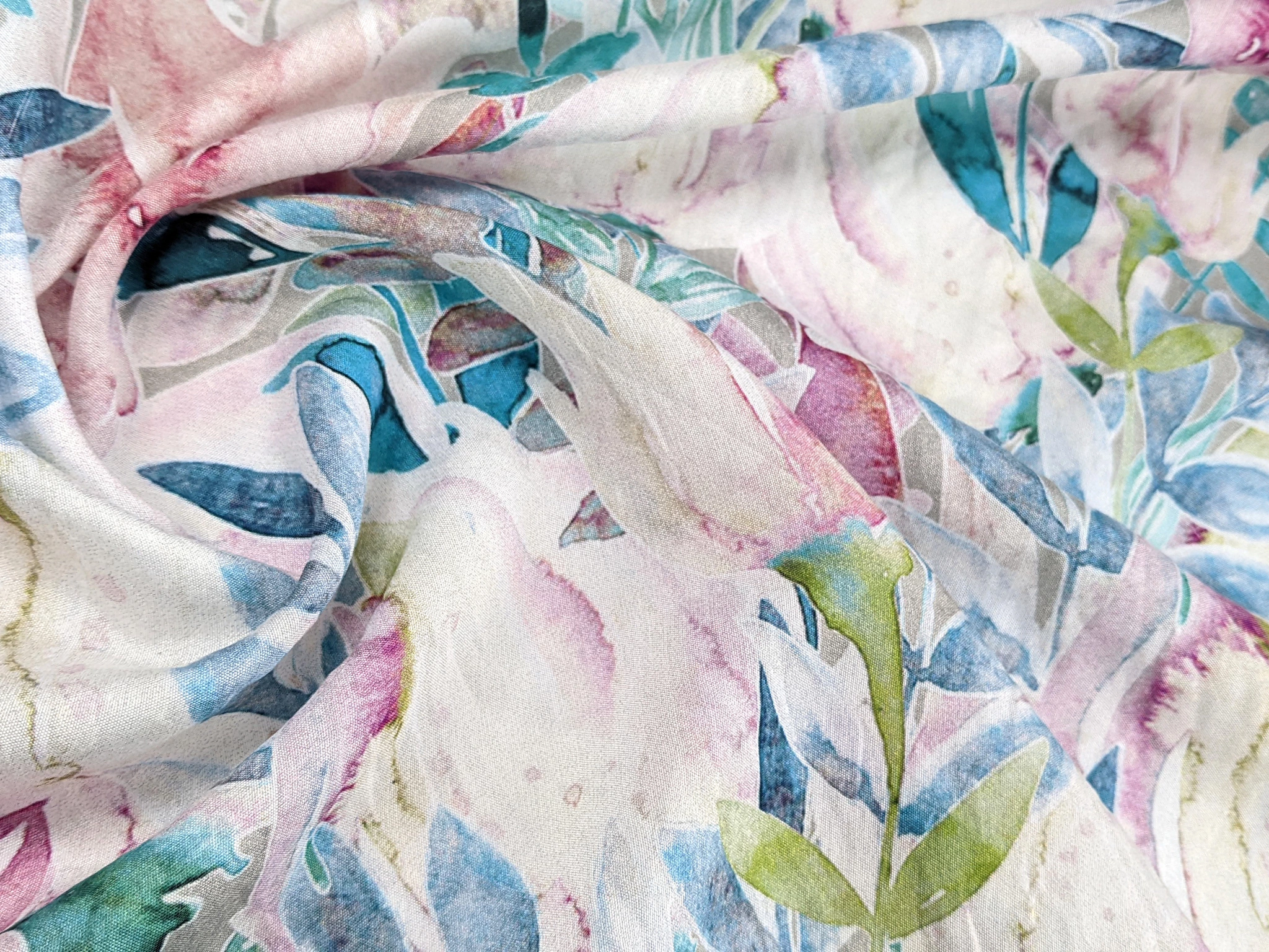 Шовк віскоза - тонкий, невагомий матеріал, що відрізняється легкістю та повітрянністю. Тканина поєднує в собі ніжність шовковистої структури та вишуканість штапелю. Тактильно поверхня має відчутну шорсткість, природний, легкий матовий блиск. За рахунок натурального складу, присутнє зминання, має прозорість на просвіт. Тканина без еластану, добре драпірується, повітропроникна, забезпечує відчуття прохолоди у спеку.