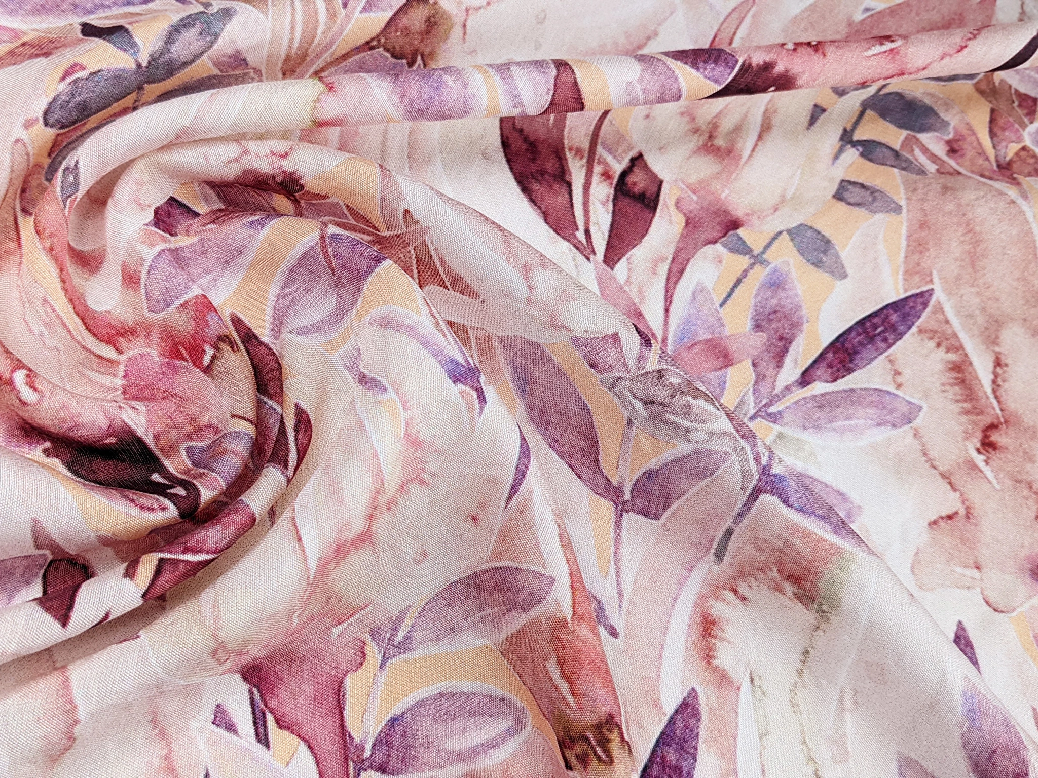 Шовк віскоза - тонкий, невагомий матеріал, що відрізняється легкістю та повітрянністю. Тканина поєднує в собі ніжність шовковистої структури та вишуканість штапелю. Тактильно поверхня має відчутну шорсткість, природний, легкий матовий блиск. За рахунок натурального складу, присутнє зминання, має прозорість на просвіт. Тканина без еластану, добре драпірується, повітропроникна, забезпечує відчуття прохолоди у спеку.