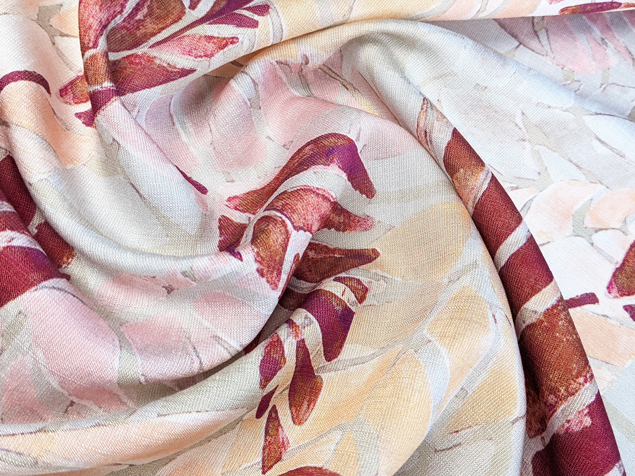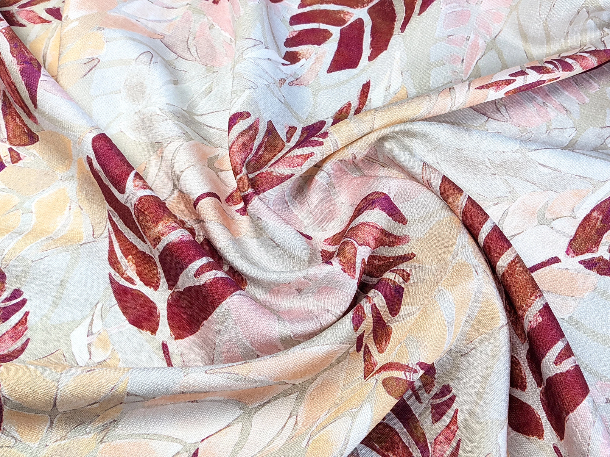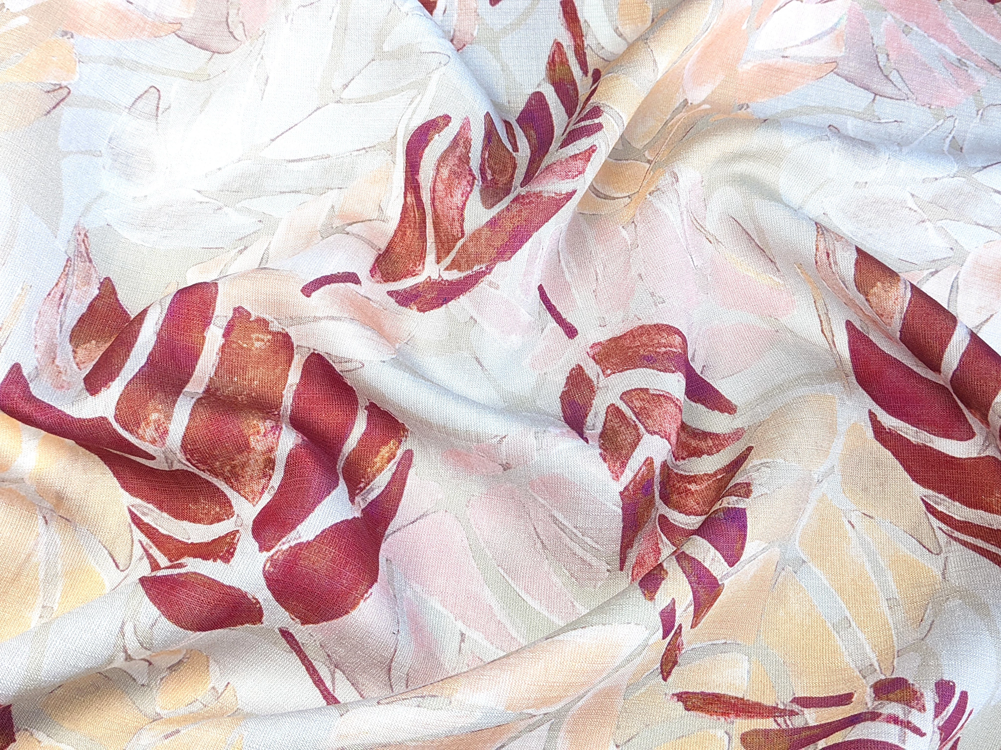 Шовк віскоза - тонкий, легкий матеріал з природним матовим блиском і полотняним плетінням волокон. Тканина повітряна, поєднує в собі ніжність шовковистої структури і вишуканість штапеля. Тактильно поверхня має ледь відчутну шорсткість. Нейлонова нитка в складі відповідає за міцність і зносостійкість тканини. Присутнє легке зминання, має прозорість на просвіт. Тканина без еластану, добре драпірується, пропускає повітря, не парить, дає відчуття прохолоди в спекотну погоду.