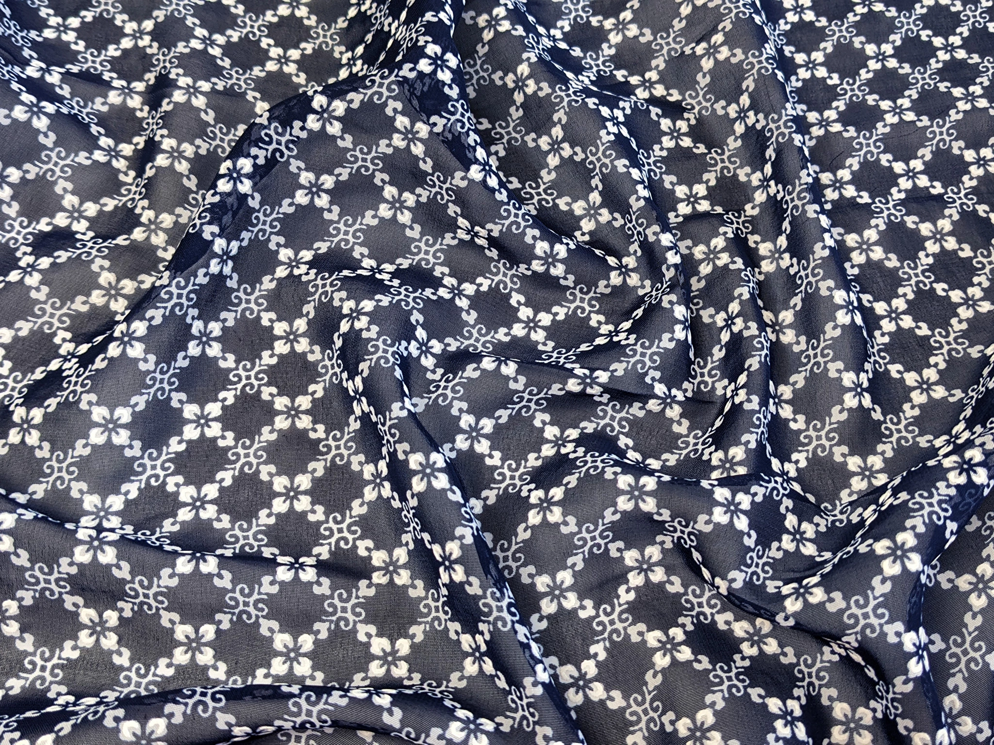 Шифон Бальпо - легкий, тонкий, напівпрозорий матеріал. На лицьовій стороні полотна на малюнок принта нанесений контур у вигляді дрібних крапок та зигзагів білого кольору. Шифон м'який і невагомий, відмінно драпірується, утворюючи м'які повітряні складки у виробах. Матеріал нееластичний, не мнеться, повітропроникний, зносостійкий.