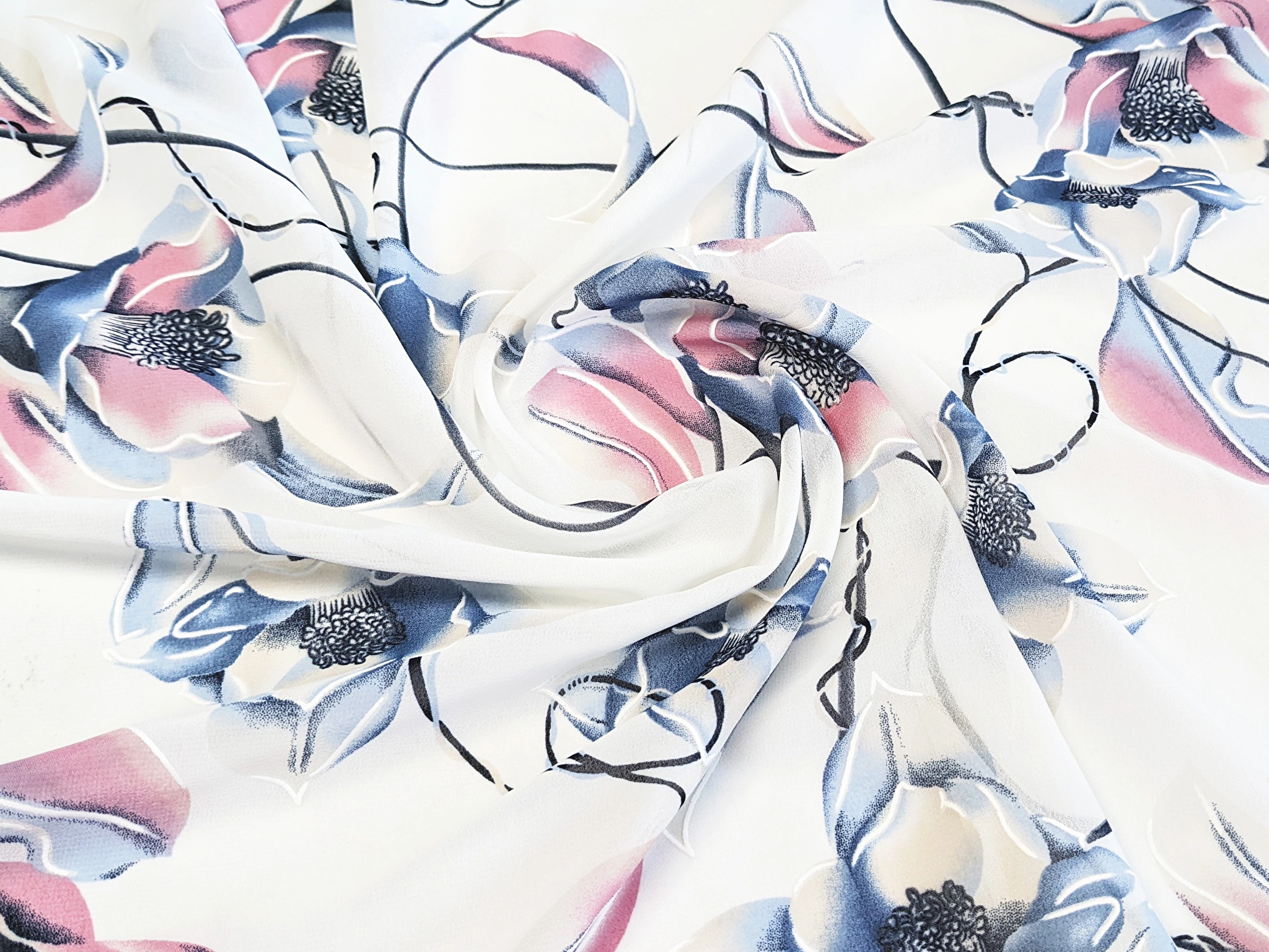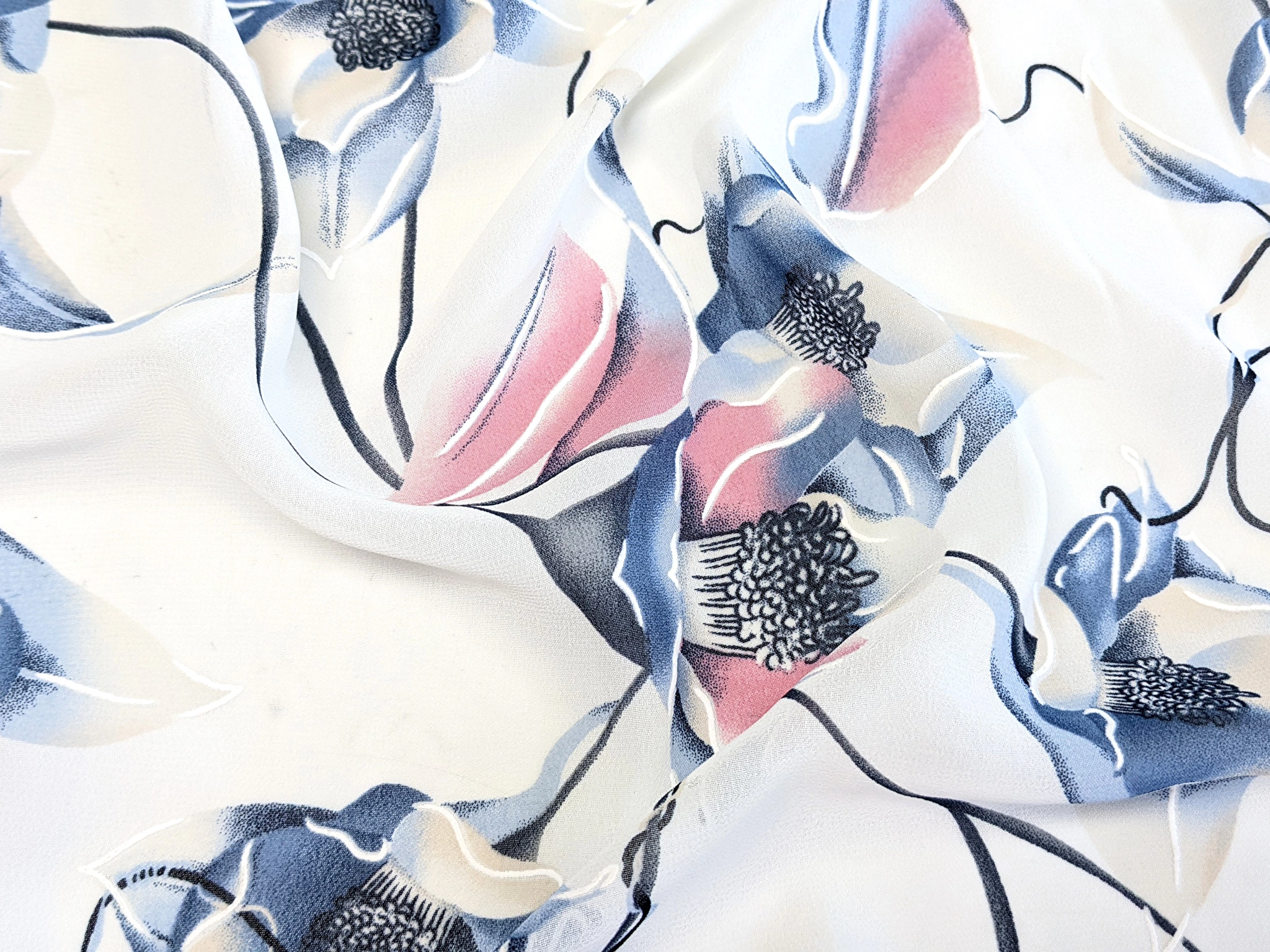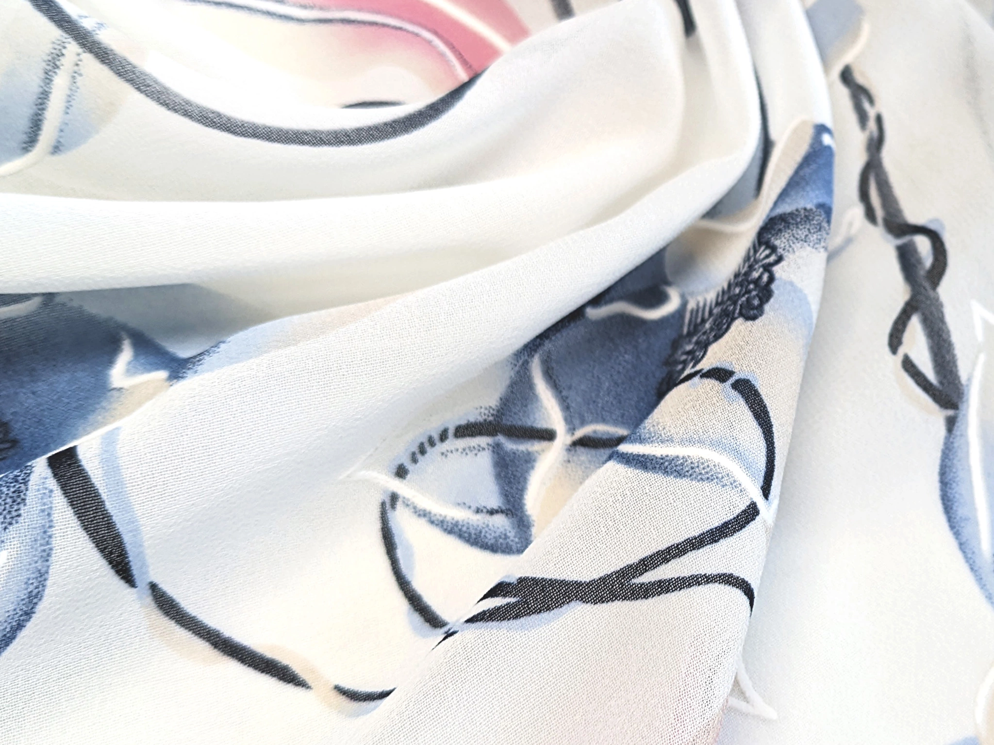 Шифон Бальпо - легкий, тонкий, напівпрозорий матеріал. На лицьовій стороні полотна на малюнок принта нанесений контур у вигляді дрібних крапок та зигзагів білого кольору. Шифон м'який і невагомий, відмінно драпірується, утворюючи м'які повітряні складки у виробах. Матеріал нееластичний, не мнеться, повітропроникний, зносостійкий.