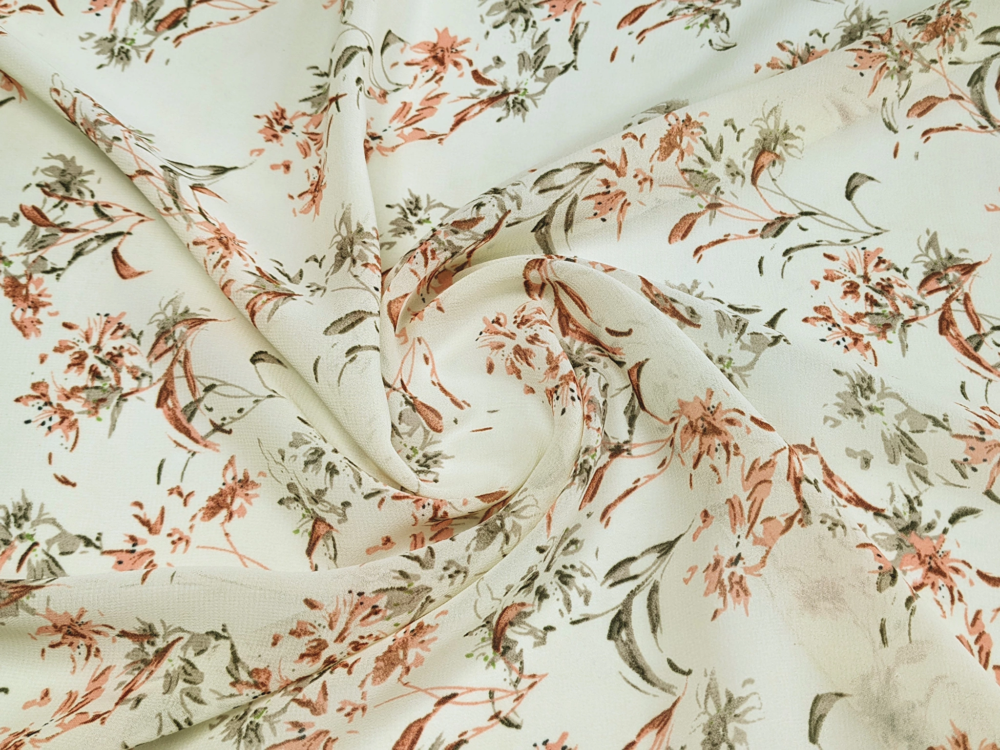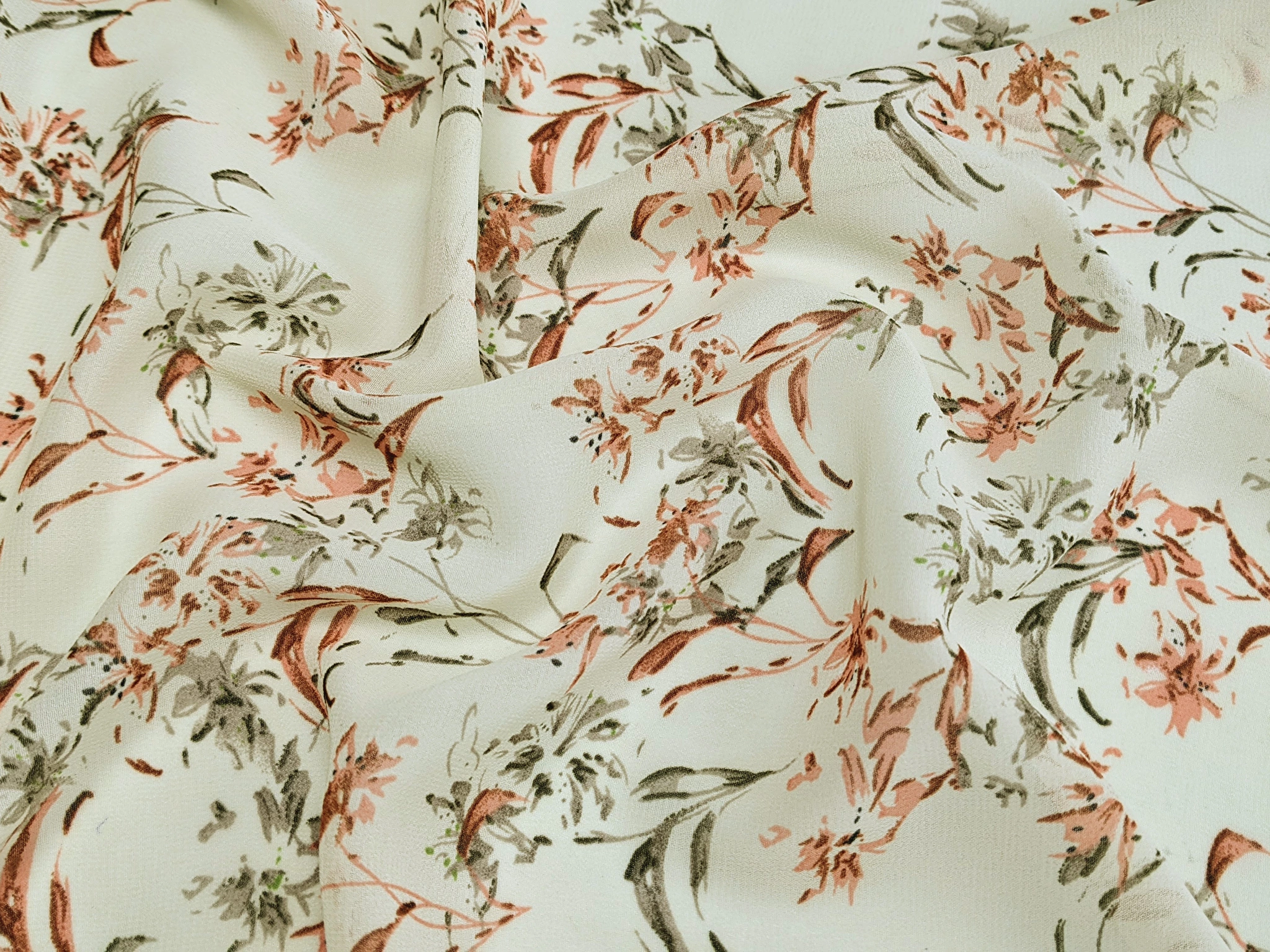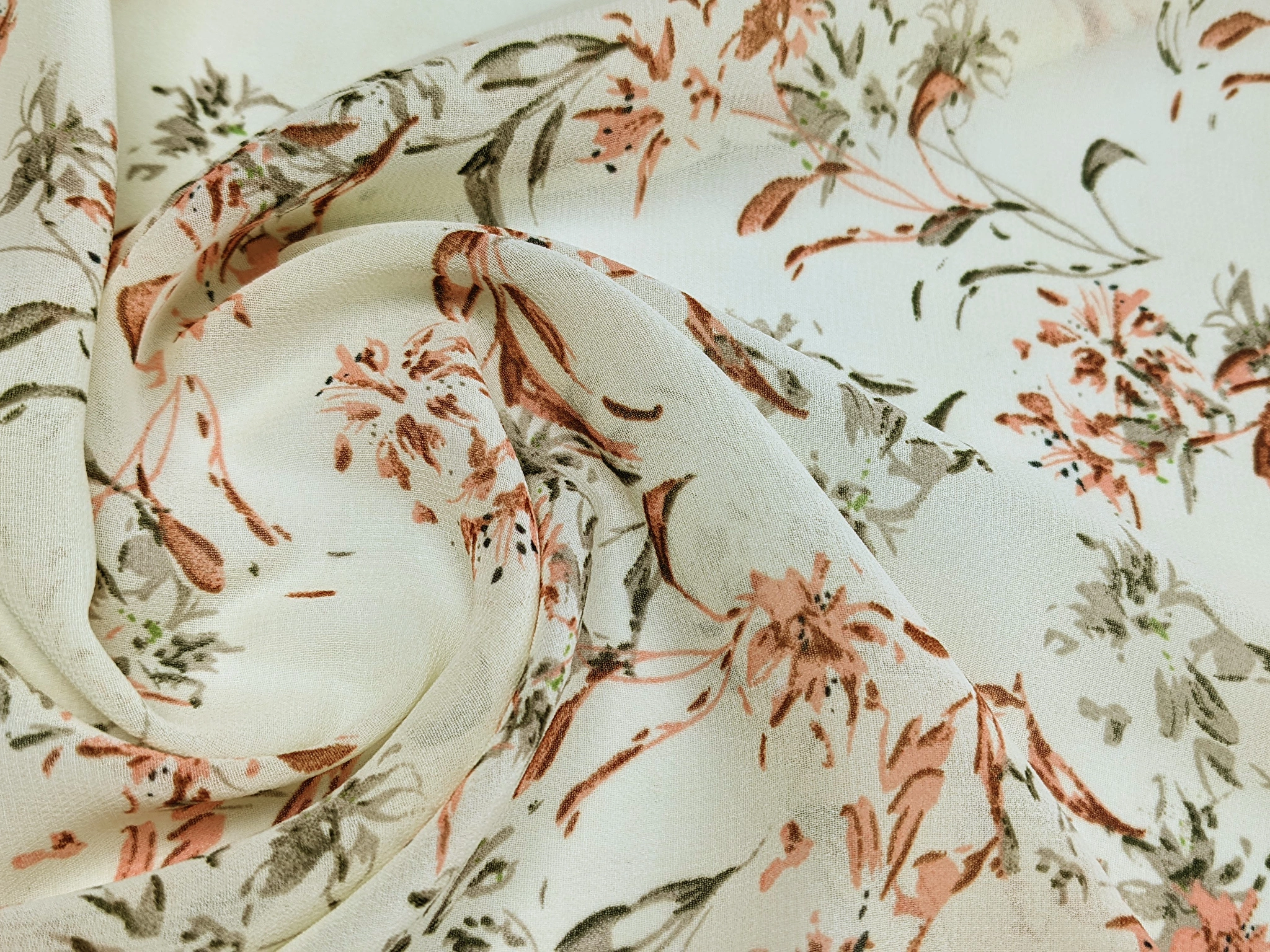 Принтований креп-шифон - це напівпрозора шорстка тканина. Тканина гарно драпірується. Прати й прасувати вироби з крепа- шифону коштує з обережністю, вибираючи делікатні режими. Полотно дуже міцне завдяки туго переплетених ниток. Для пошиття суконь рекомендуємо придбати легку підкладкову тканину.
