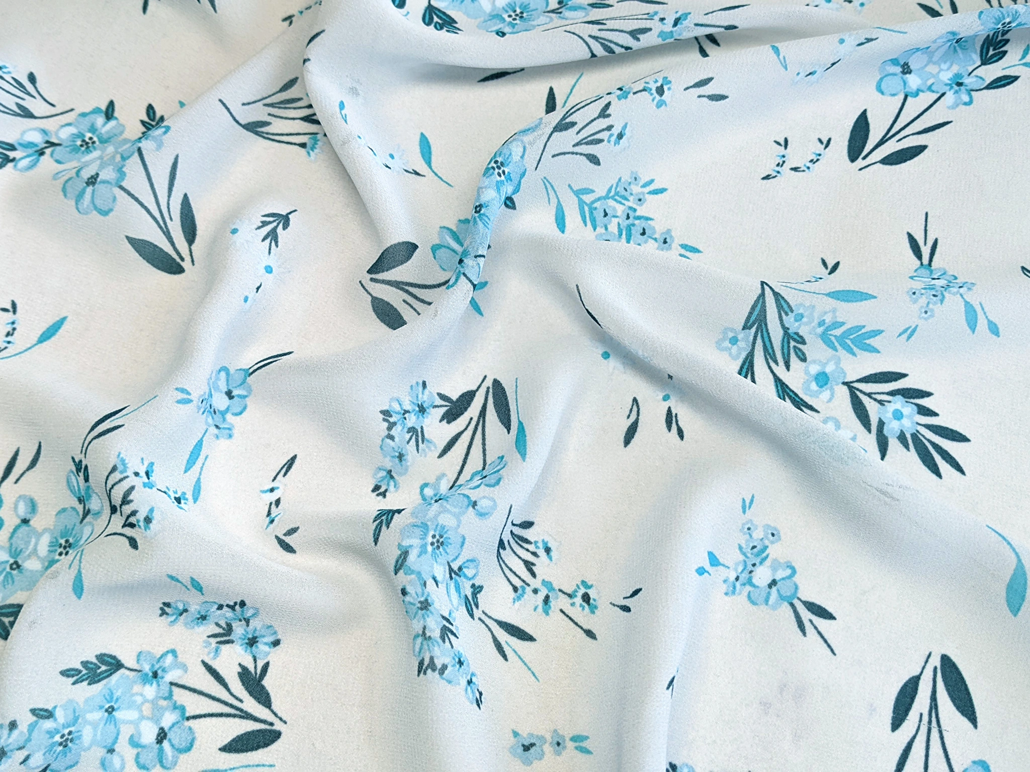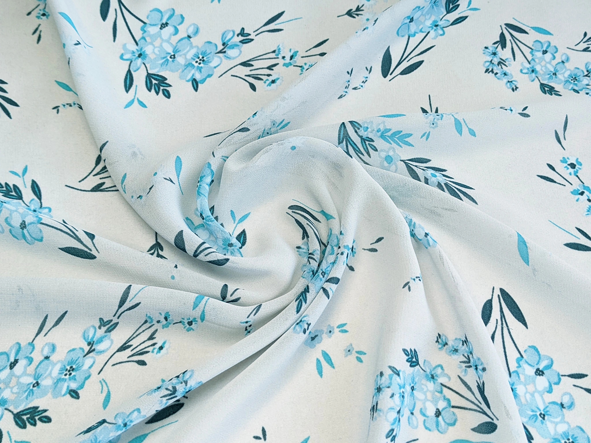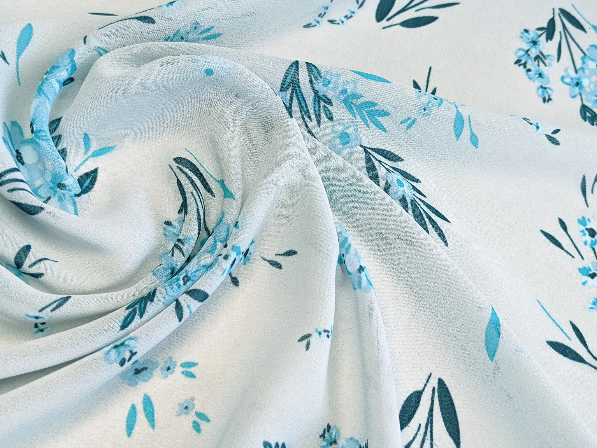 Принтований креп-шифон - це напівпрозора шорстка тканина. Тканина гарно драпірується. Прати й прасувати вироби з крепа- шифону коштує з обережністю, вибираючи делікатні режими. Полотно дуже міцне завдяки туго переплетених ниток. Для пошиття суконь рекомендуємо придбати легку підкладкову тканину.